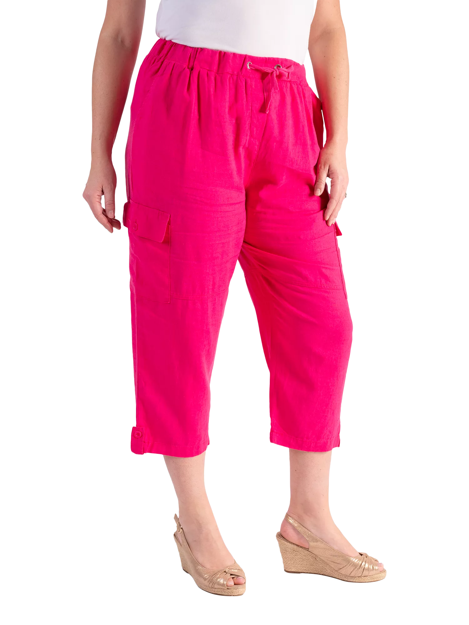 Ideal for warmer days, these relaxed cropped cargo pants have a pull-on elasticated waist and feature two side button-tab pockets. Fashioned from a linen mix fabric for ease of comfort, they play nicely with both plain and patterned separates thanks to their plain ground and are perfect to take on holiday or for spending summer days in the city. Inside leg measures 55cm, waistband to hem measures 87cm.