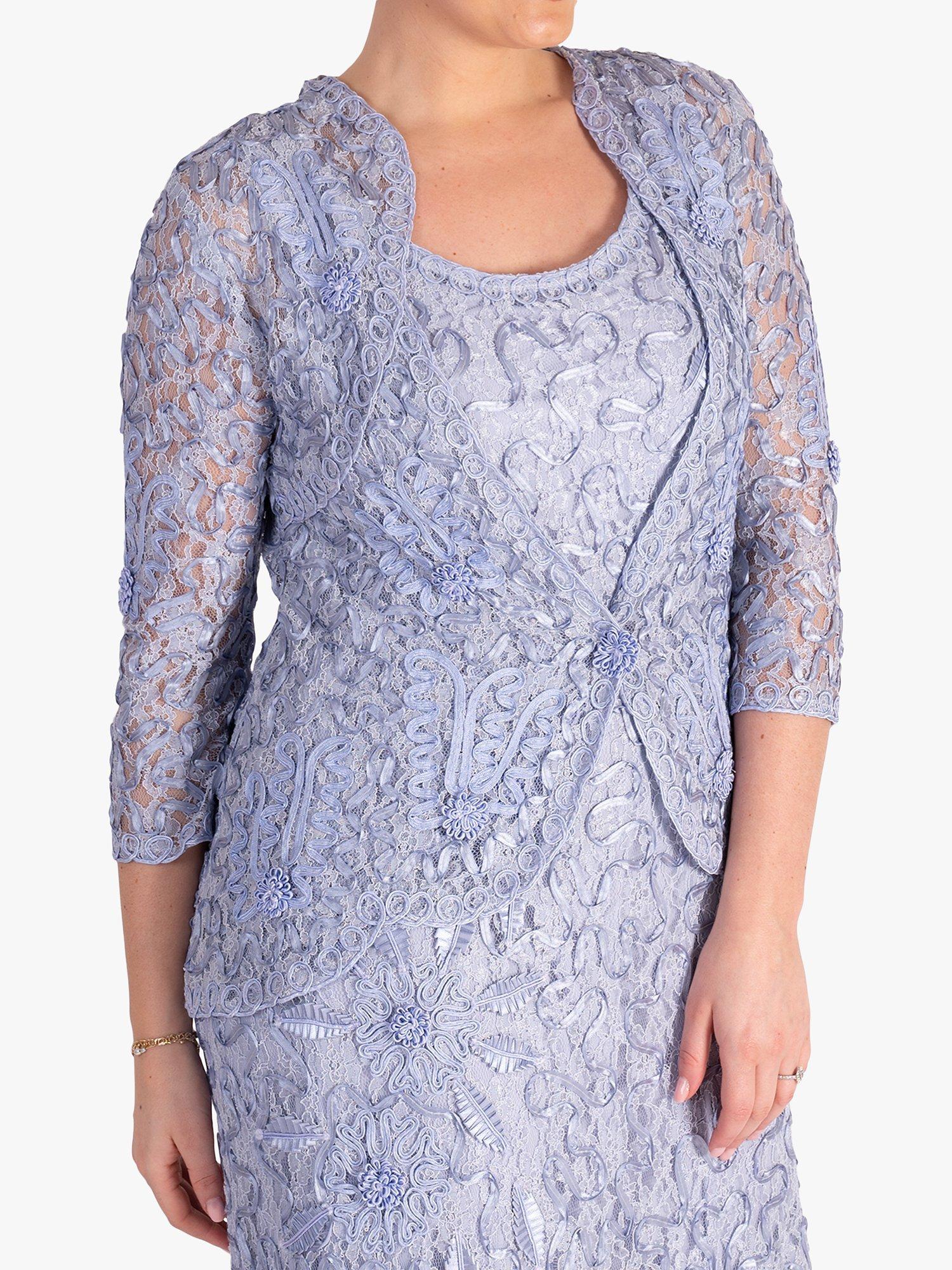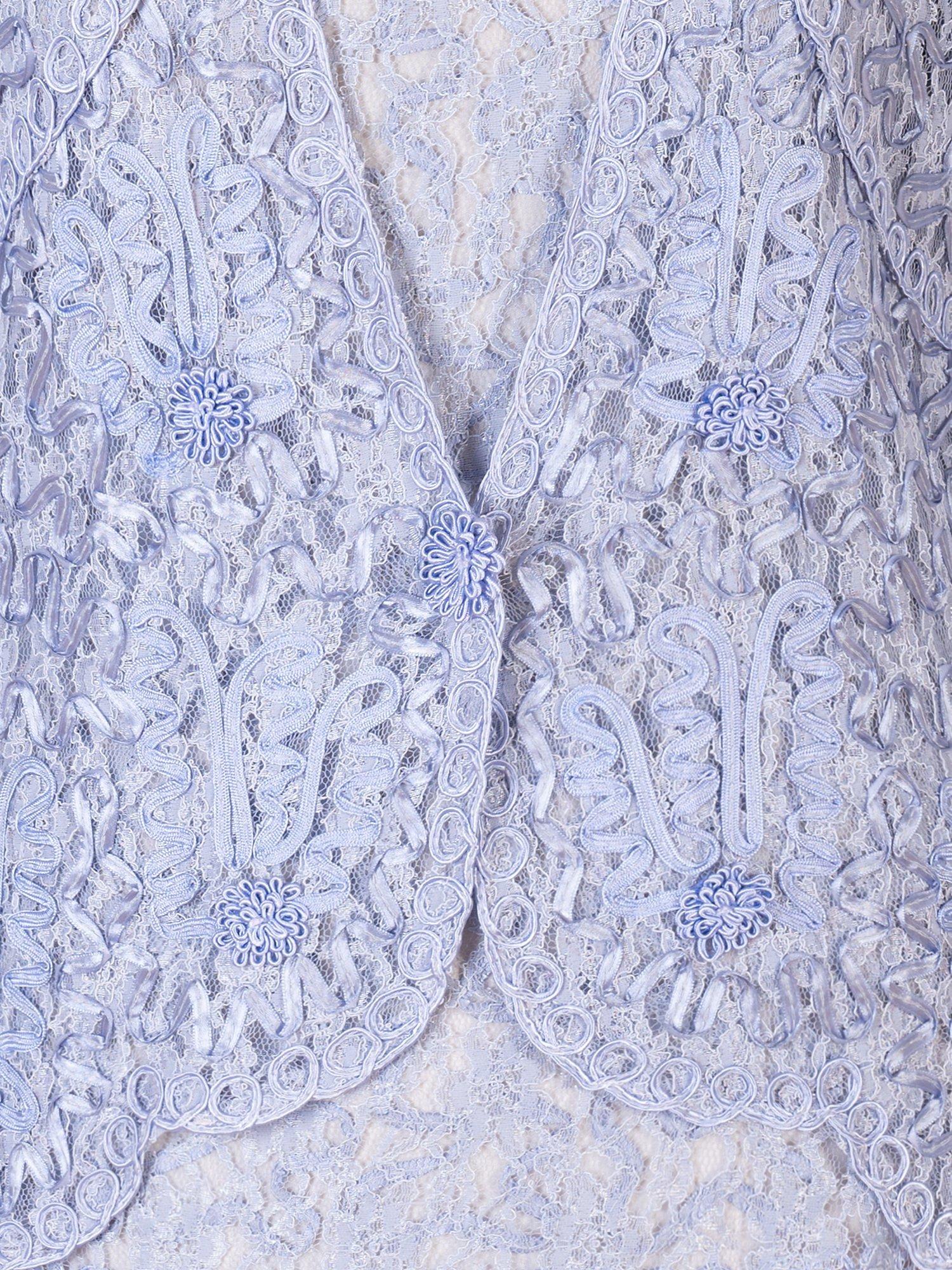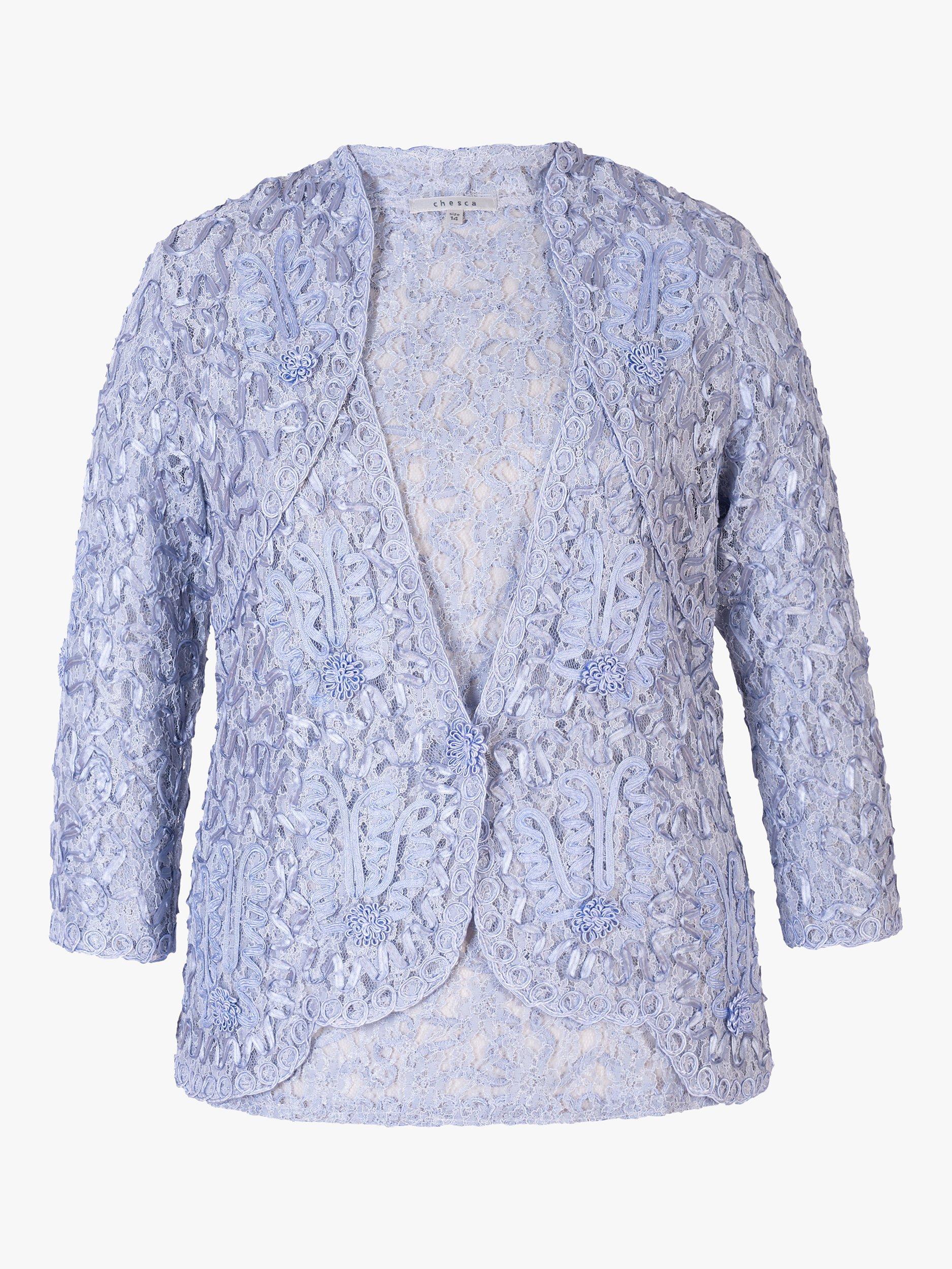 A luxury lace detail jacket by Chesca, featuring a fitted style for ultimate shape and slim, three-quarter-length sleeves. The V neck with faux bolero lines gives a sweetheart neckline when worn with matching signature lace dress. Crafted from the finest lace embroidered with satin ribbon and hand-crafted embossed flowers, in luxe hues it is perfect for occasion dressing.