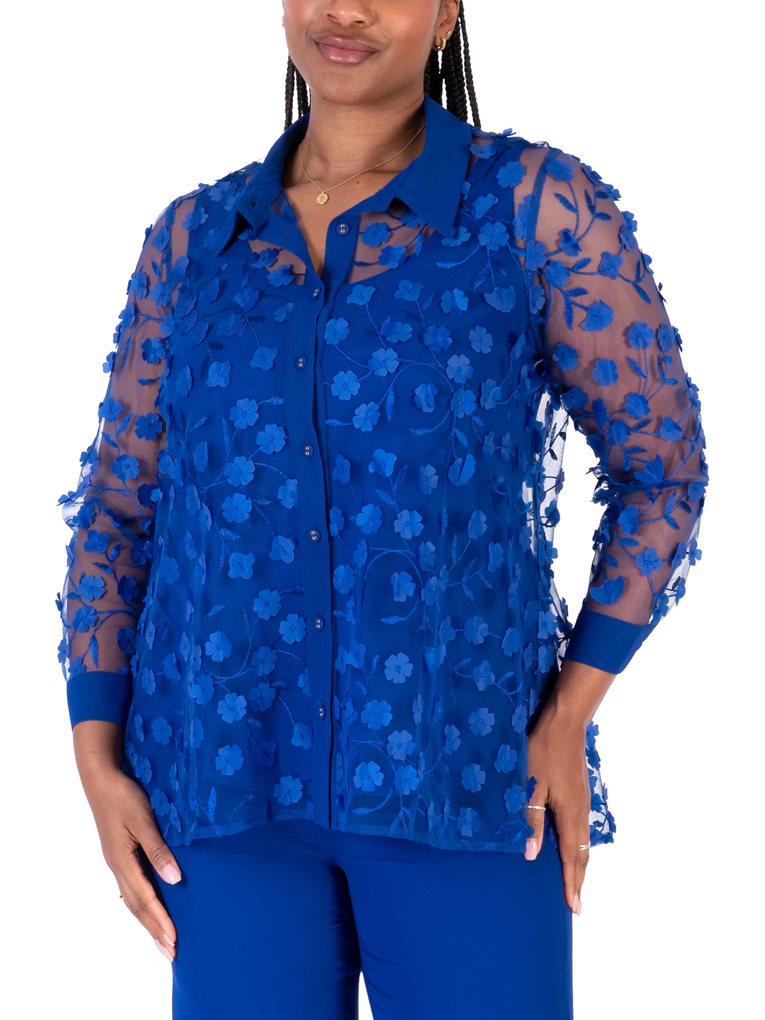 Updating your collection, this exquisite mesh shirt by chesca is adorned with all-over applique daisies and embroidery. Designed with a classic collar neckline and long sleeves, the collar, placket and cuffs are finished in chiffon for a subtle contrast.
