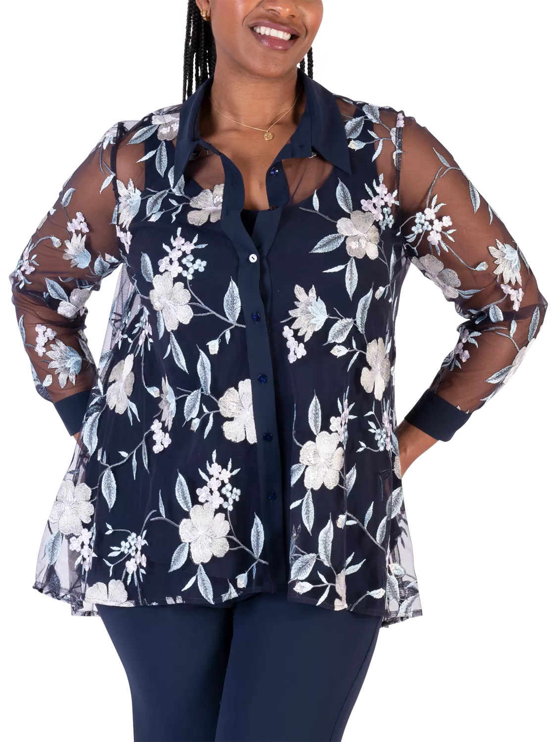 Updating your collection, this mesh shirt by chesca is adorned with an all-over embroidered floral motif. Designed with a classic collar neckline and long sleeves, the collar, placket and cuffs are finished in chiffon for a subltle contrast.