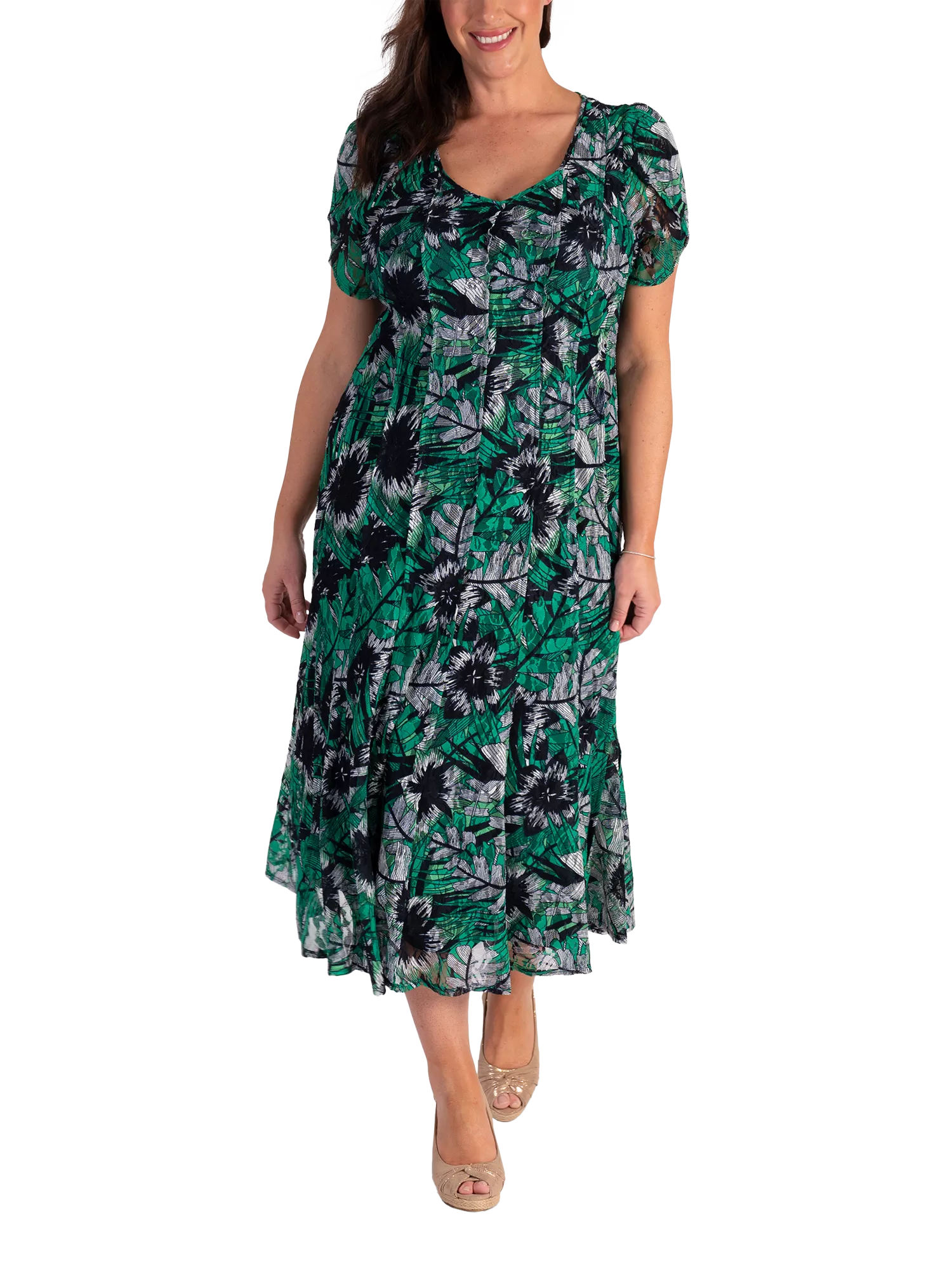 Steal the spotlight with this elegant short-sleeved lace midi dress from Chesca, boasting an all-over graphic tropical print. Showcasing a fit and flare silhouette and graceful sweeping hemline, this panelled design is figure-hugging at the waist and has a natural ruffled effect which cascades down to below the knee. Finished with a figure-flattering V-neckline and feminine tulip-style sleeves, this versatile dress can easily be dressed up or down to suit any occasion.