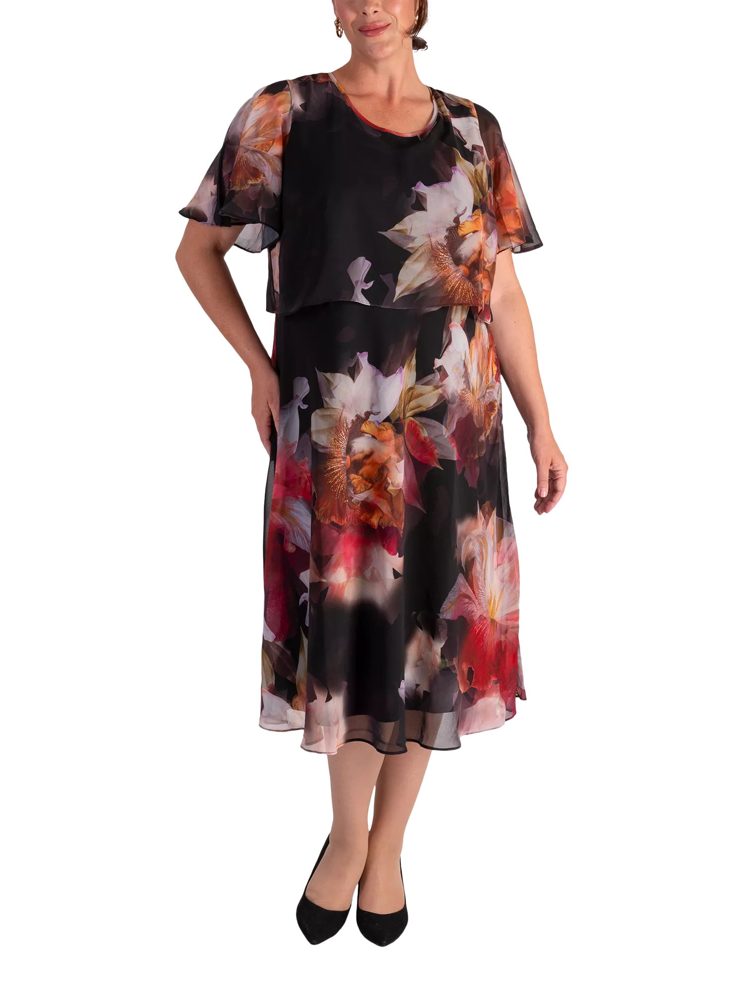 This orchid print layered chiffon dress from Chesca exudes feminine elegance. Crafted from a lightweight and fluid chiffon fabric, this dress falls below the knee in length and features delicate angel sleeves and a round neck. It has a keyhole fastening at the back and a bias cut skirt that gently flares. Style with a chiffon shawl to complete your special occasion ensemble in florals. Dress length 118cm from shoulder neck point to hem.