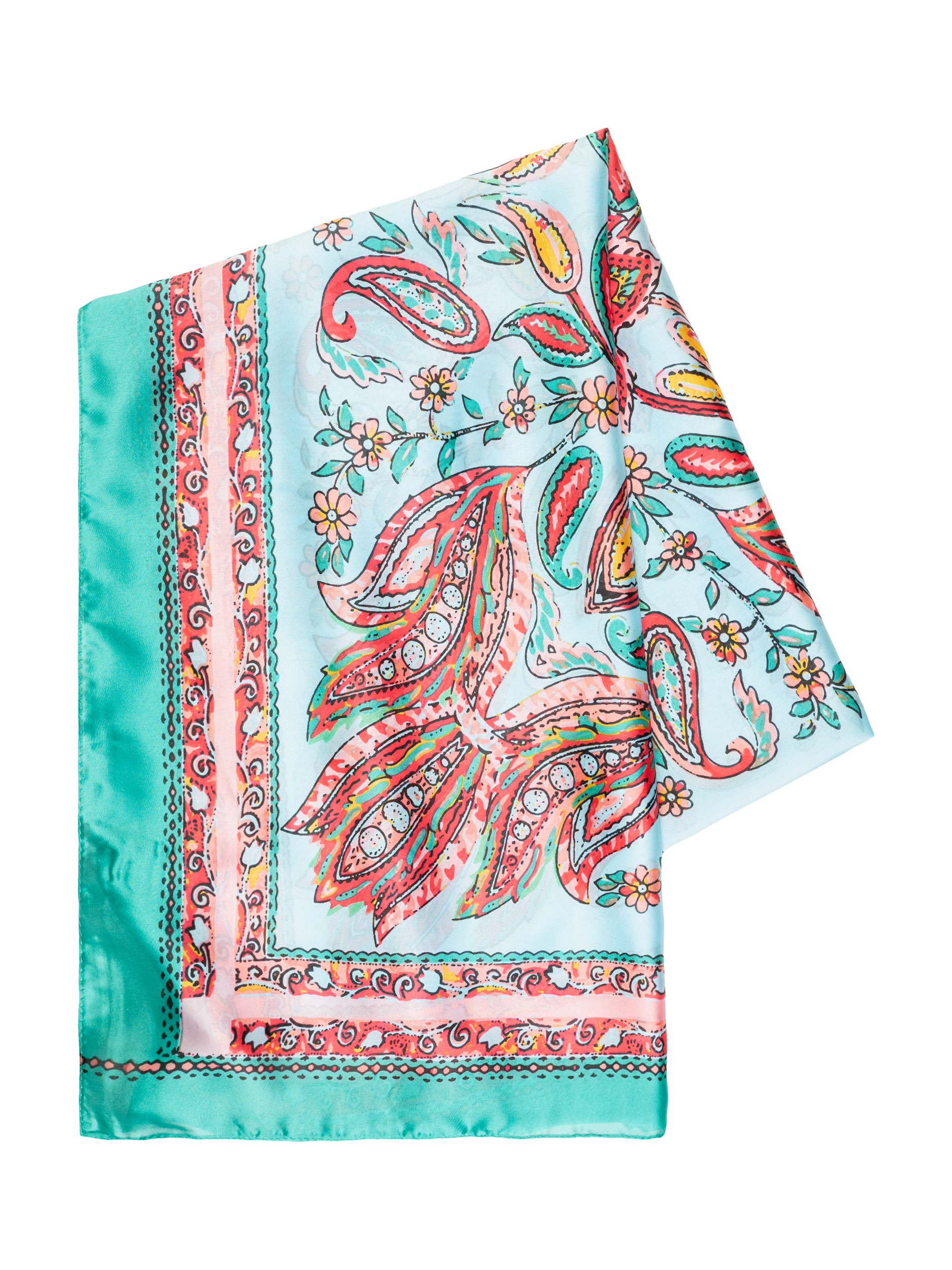 Instantly lifting any outfit, this chic silky finish paisley print scarf is a great way to add a splash of colour to your look. Finished with a colour block border and a straight edge, this vibrant easy to wear lightweight scarf is an ideal accent piece for your spring summer outfits. The generous size makes it versatile for styling.