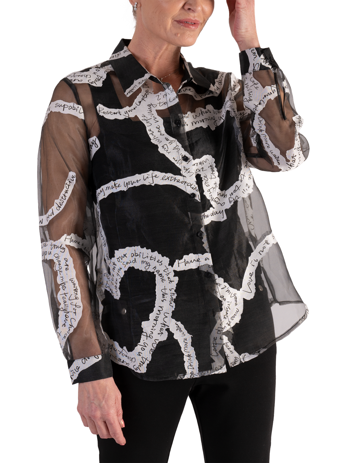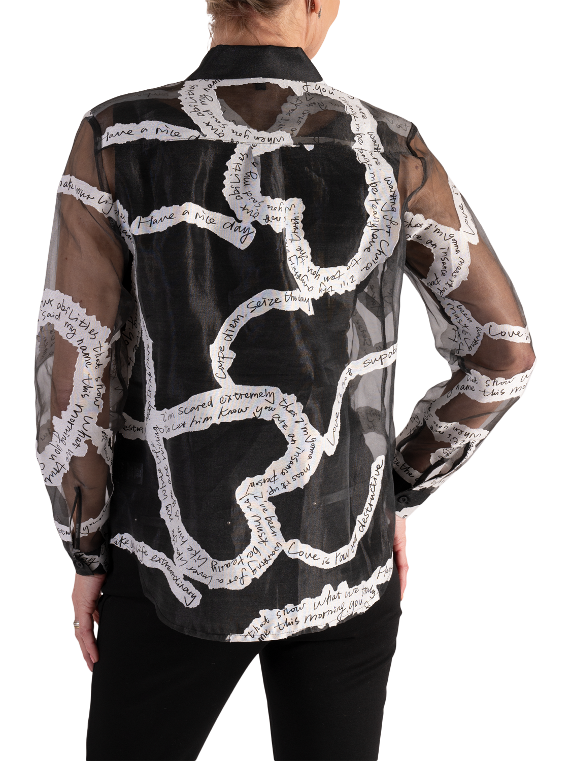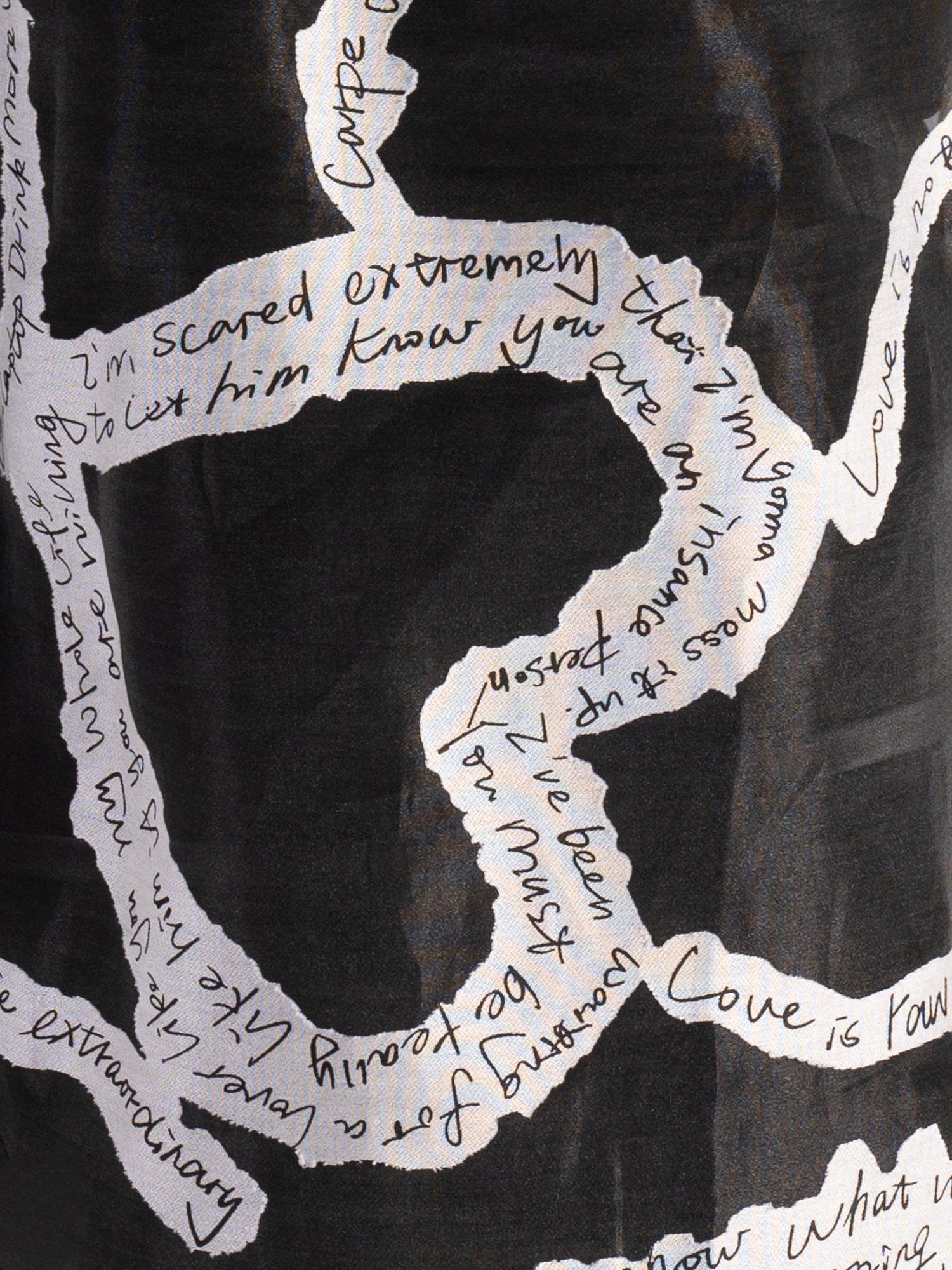 Updating your collection, this contemporary sheer organza shirt makes an instant impact with its all-over handwritten poetic print. With a neat collared neck and long sleeves, it is made with a light yet durable organza fabric and is a chic addition to your repertoire making it an ideal piece to turn heads at after-dark soirées.