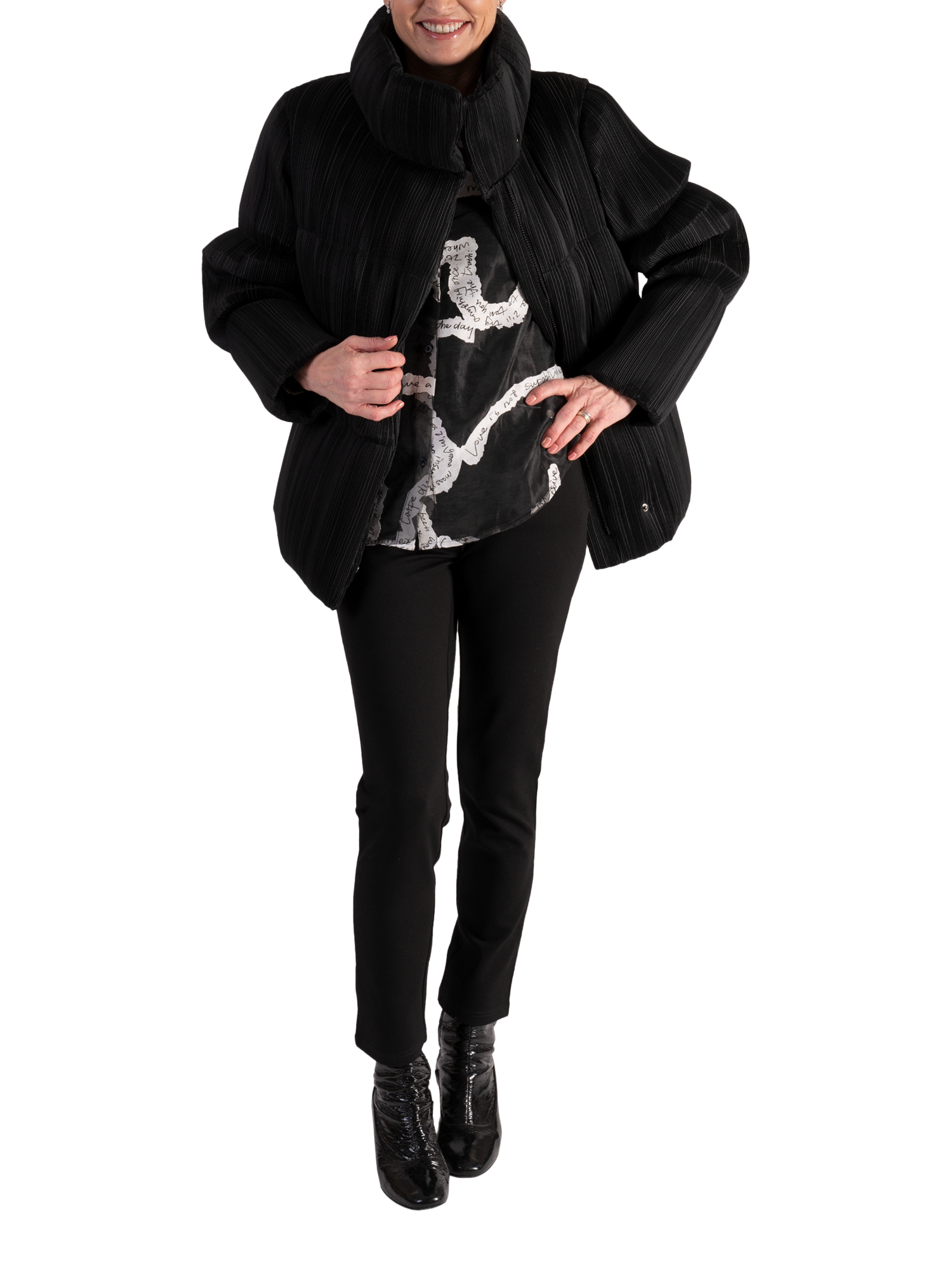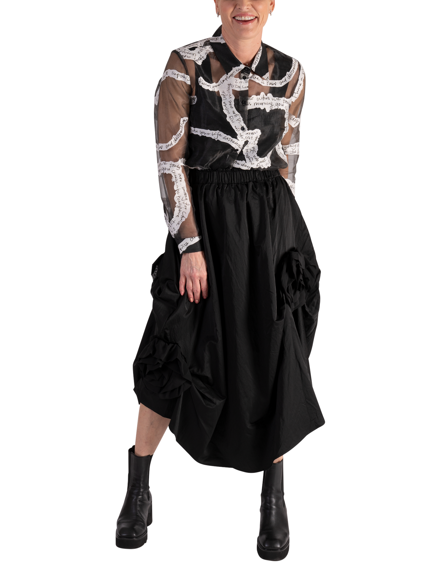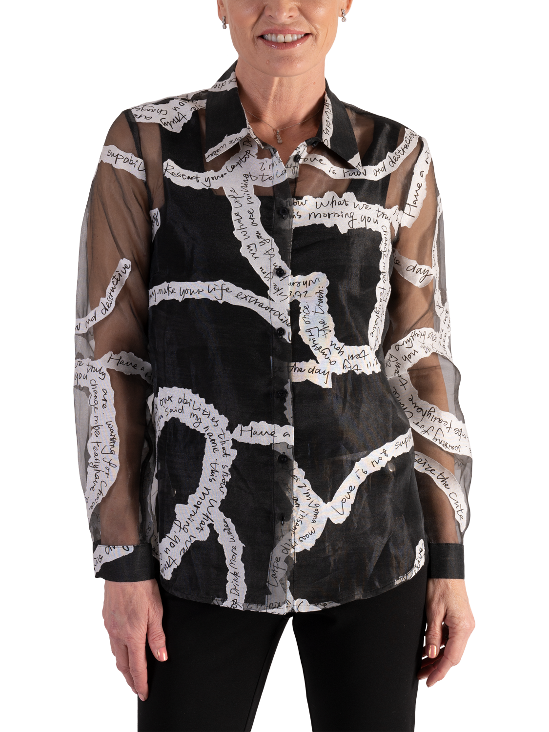 Updating your collection, this contemporary sheer organza shirt makes an instant impact with its all-over handwritten poetic print. With a neat collared neck and long sleeves, it is made with a light yet durable organza fabric and is a chic addition to your repertoire making it an ideal piece to turn heads at after-dark soirées.