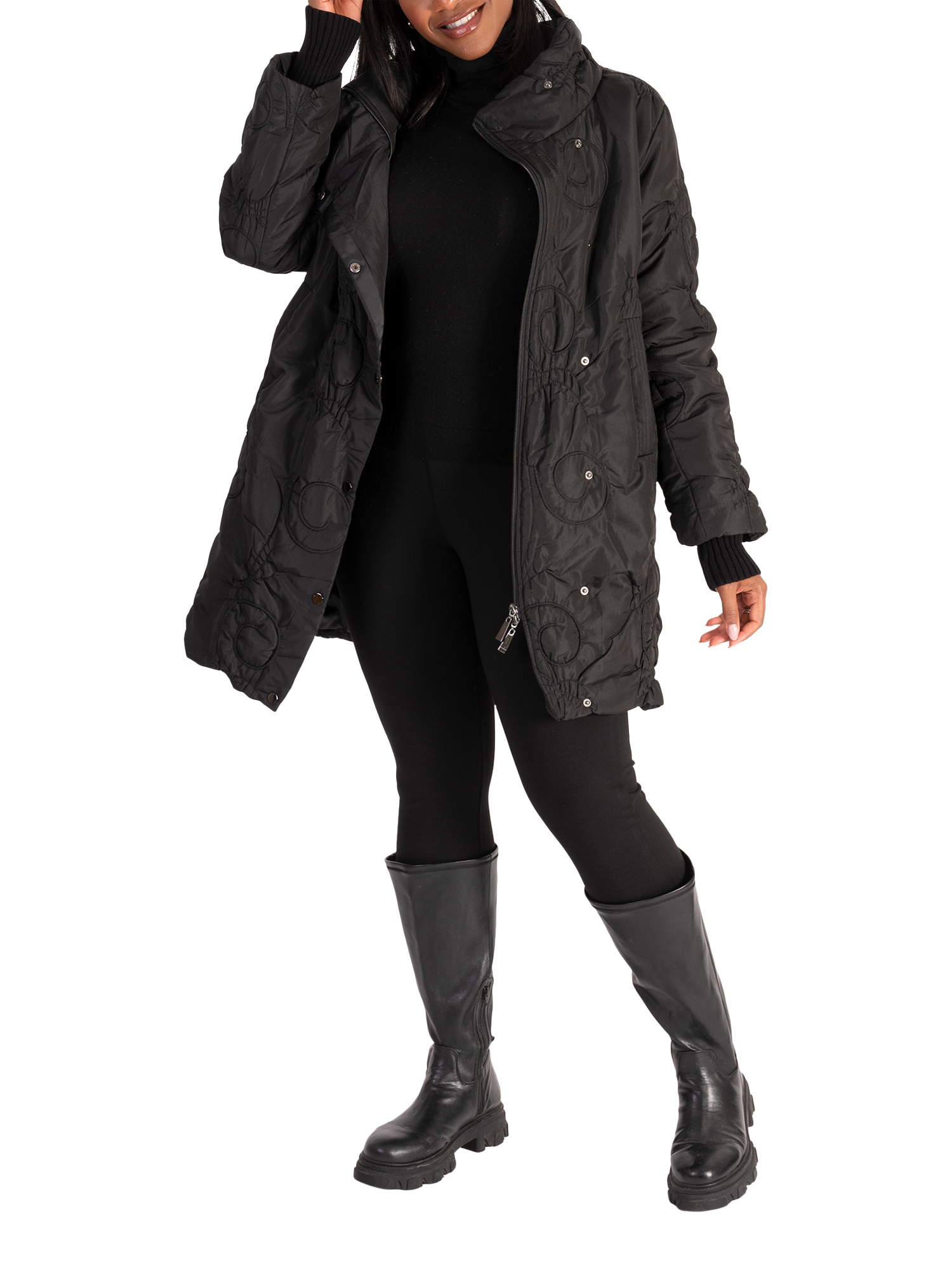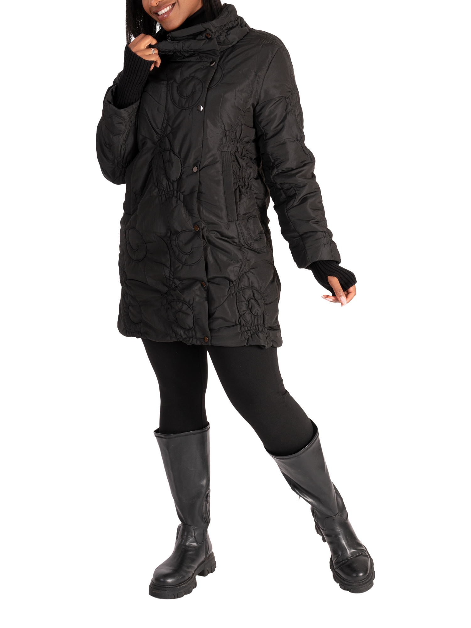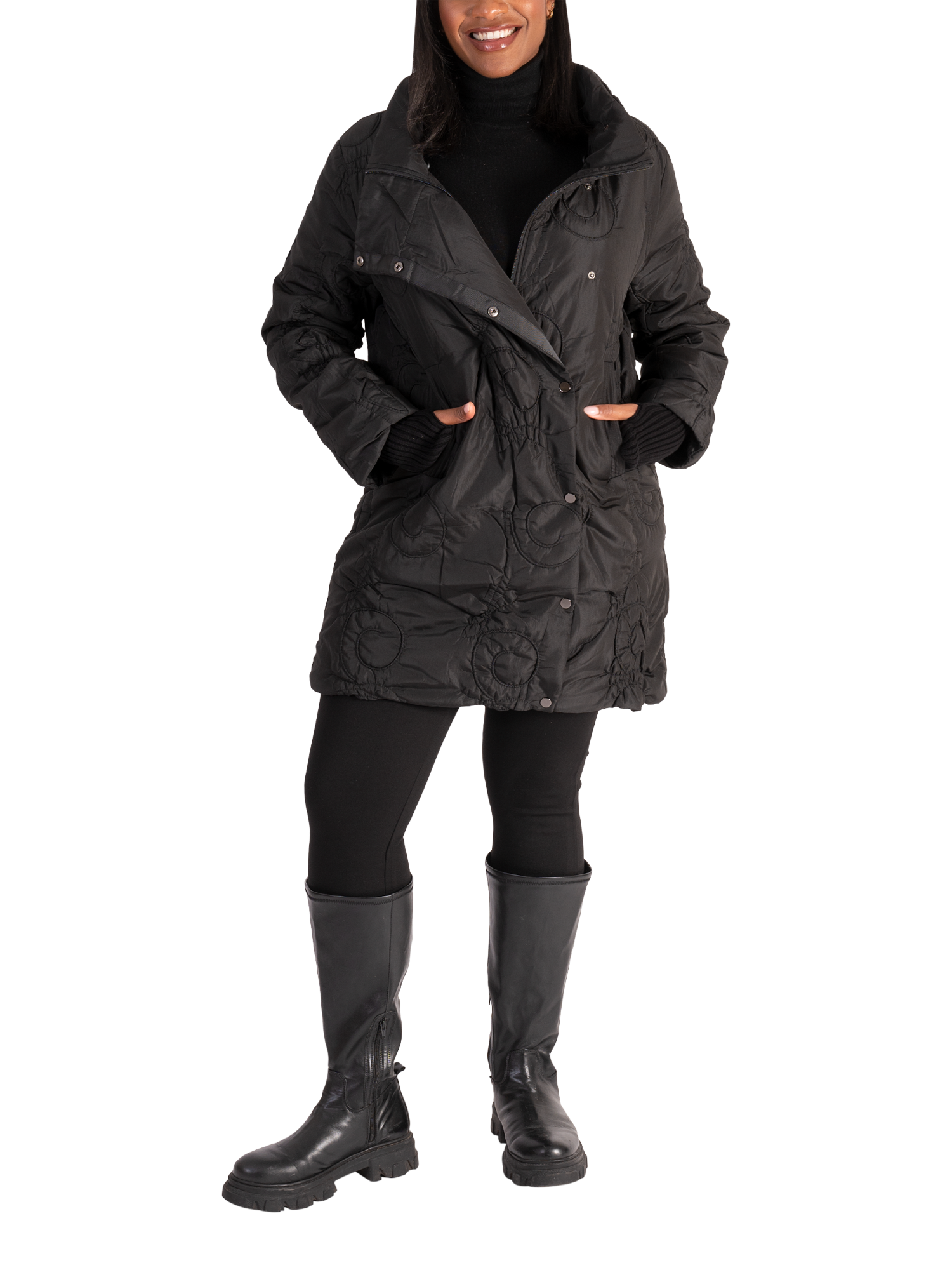Quilted for cosy layering on days that require protection from the elements, this coat from chesca is cut to a mid-length hem for comfortable coverage. Featuring a snug high neckline and detailed with swirly cartwheel embroidery, it is fashioned from long-lasting fabric that will see away the cold in style. Featuring a two-way zip fastening concealed by a poppers and two side pockets, this practical coat showcases a detachable knitted ribbed collar which doubles up as a hood. Two looks in one!