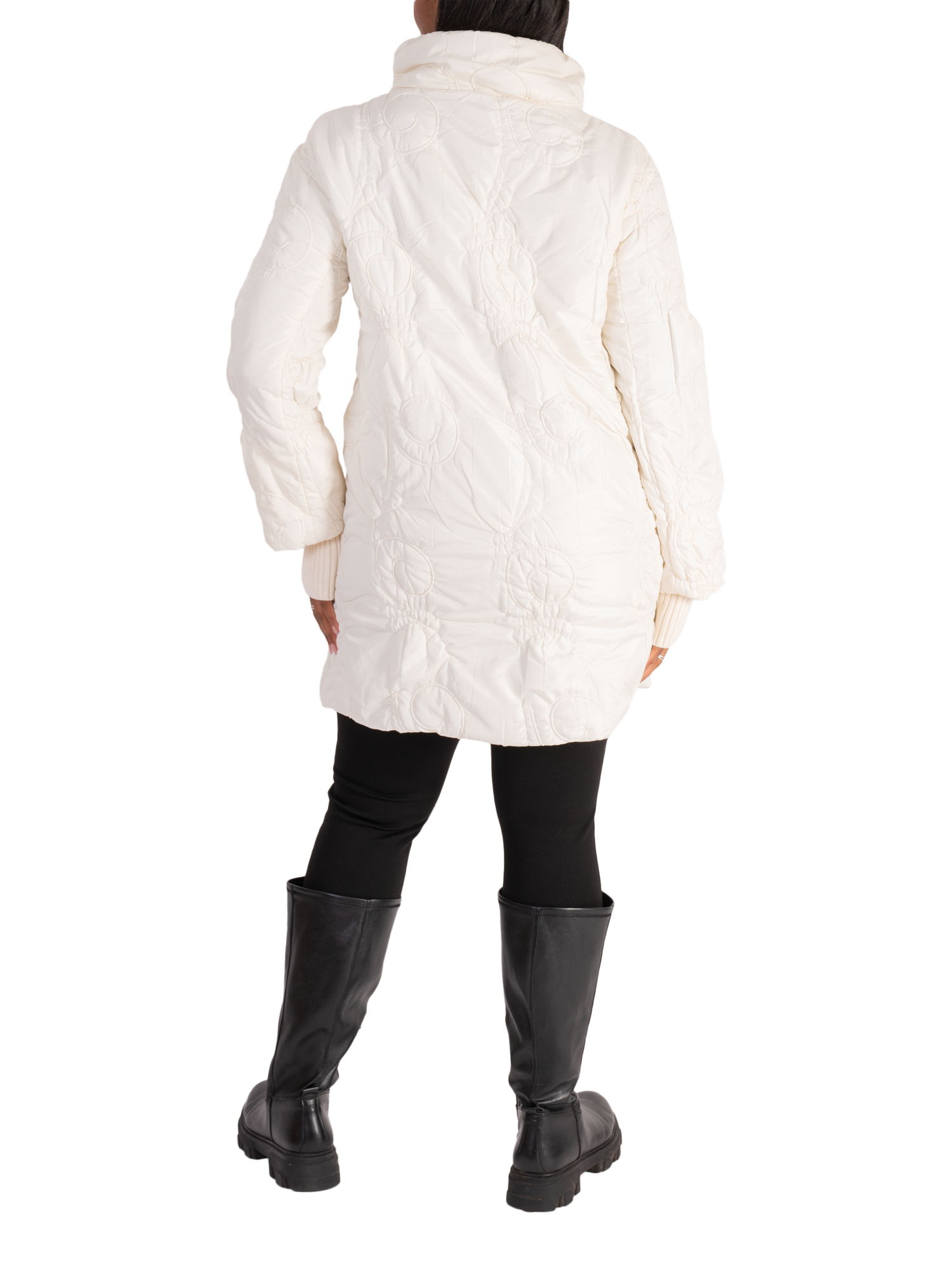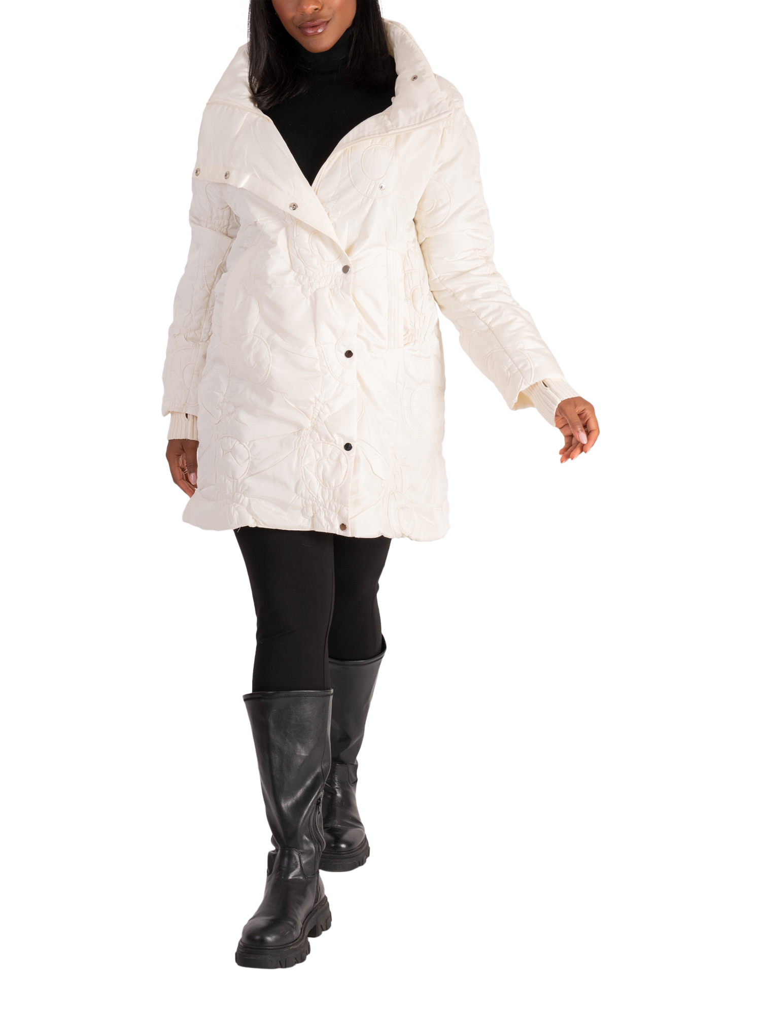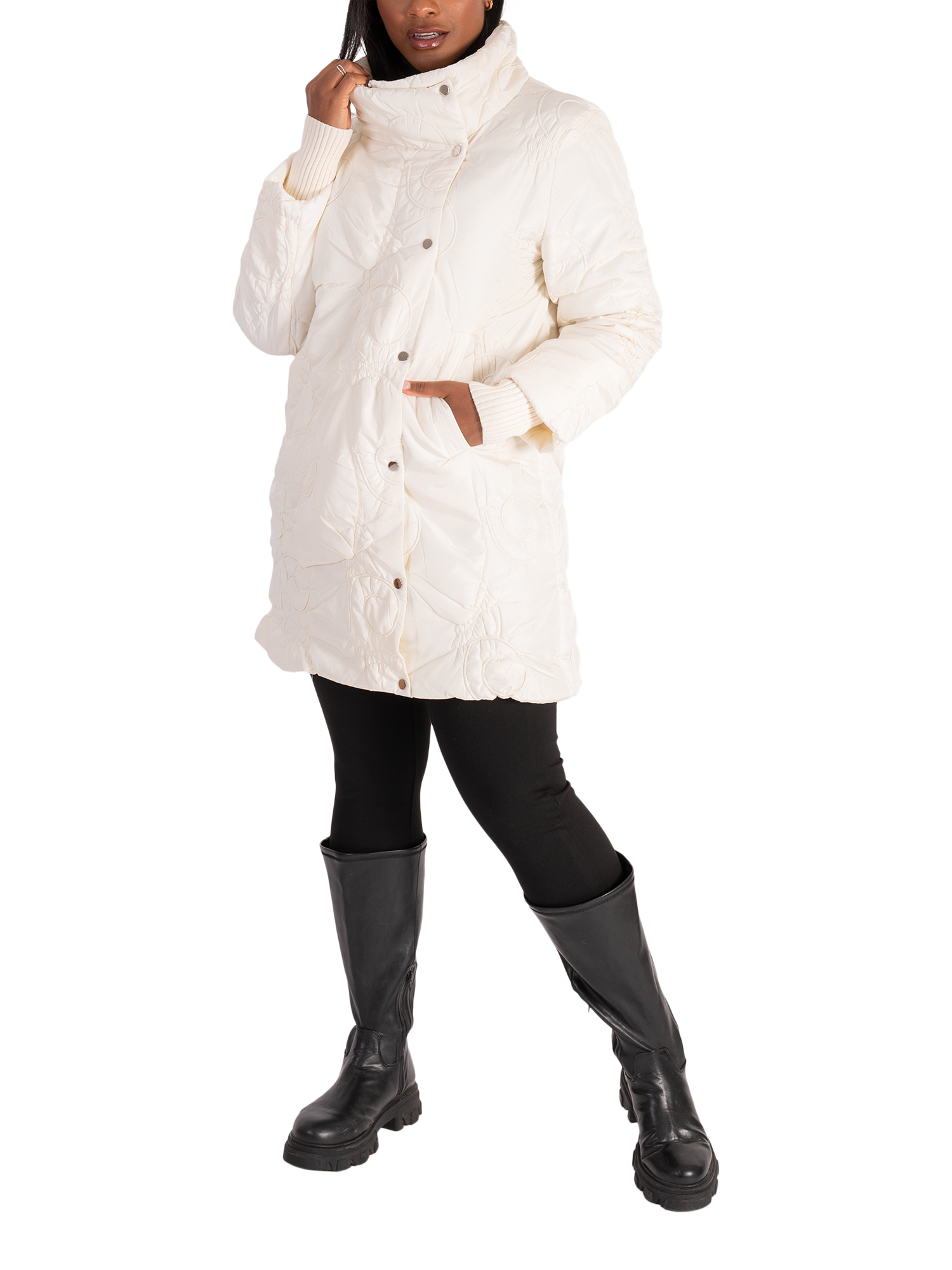 Quilted for cosy layering on days that require protection from the elements, this coat from chesca is cut to a mid-length hem for comfortable coverage. Featuring a snug high neckline and detailed with swirly cartwheel embroidery, it is fashioned from long-lasting fabric that will see away the cold in style. Featuring a two-way zip fastening concealed by a poppers and two side pockets, this practical coat showcases a detachable knitted ribbed collar which doubles up as a hood. Two looks in one!