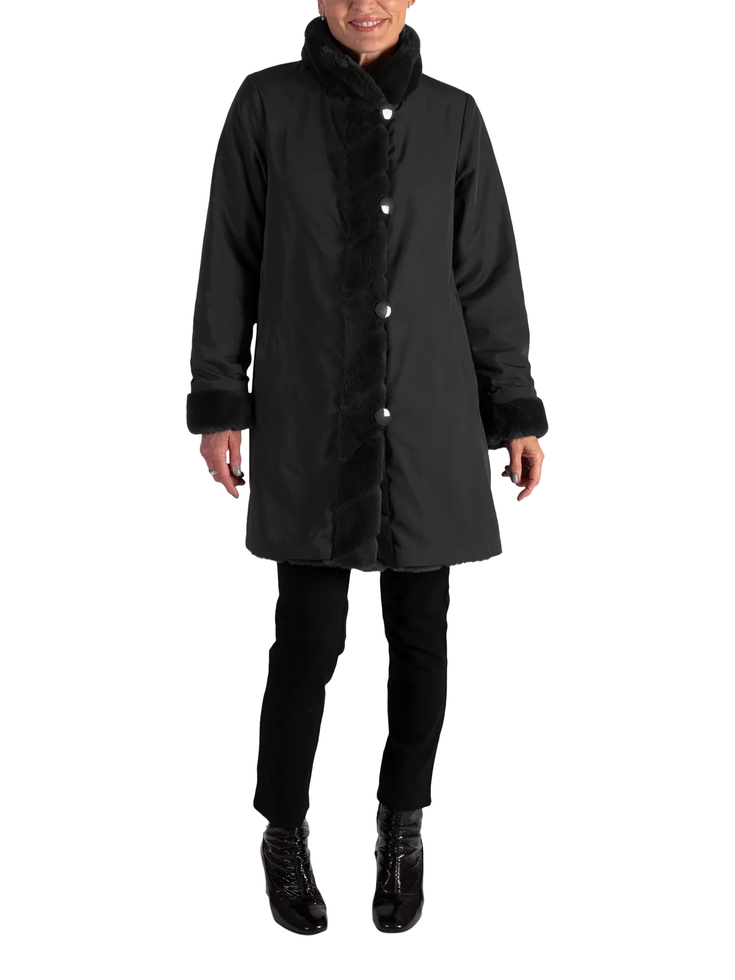 Rendered in luxuriously soft faux fur with diagonal detailing combined with a plain fabric on the reverse. An unstructured shape gives this piece a unique, personal fit, with a rounded collar, two front welt pockets on either side holding all your essentials close by. The central placket and sleeves of the plain side are finished with a faux-fur trim.