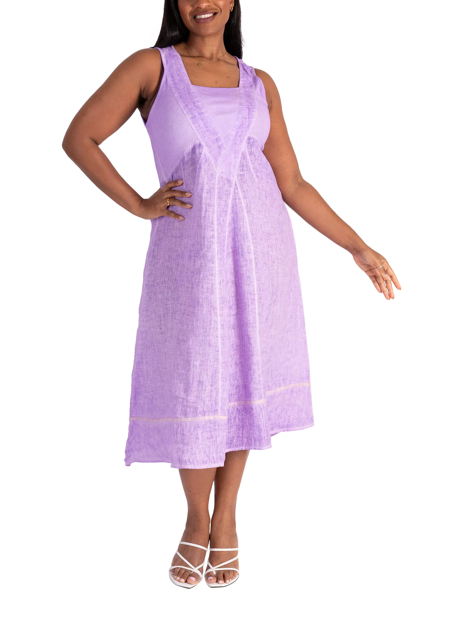 This timeless summer dress is crafted in a luxurious linen and is accented with ribbed panels at the bodice to create a figure-flattering warm weather must-have! This sleeveless dress is finished with a square neckline, two side seam pockets and a crossover front detail, making it a perfect choice for summer days ahead.