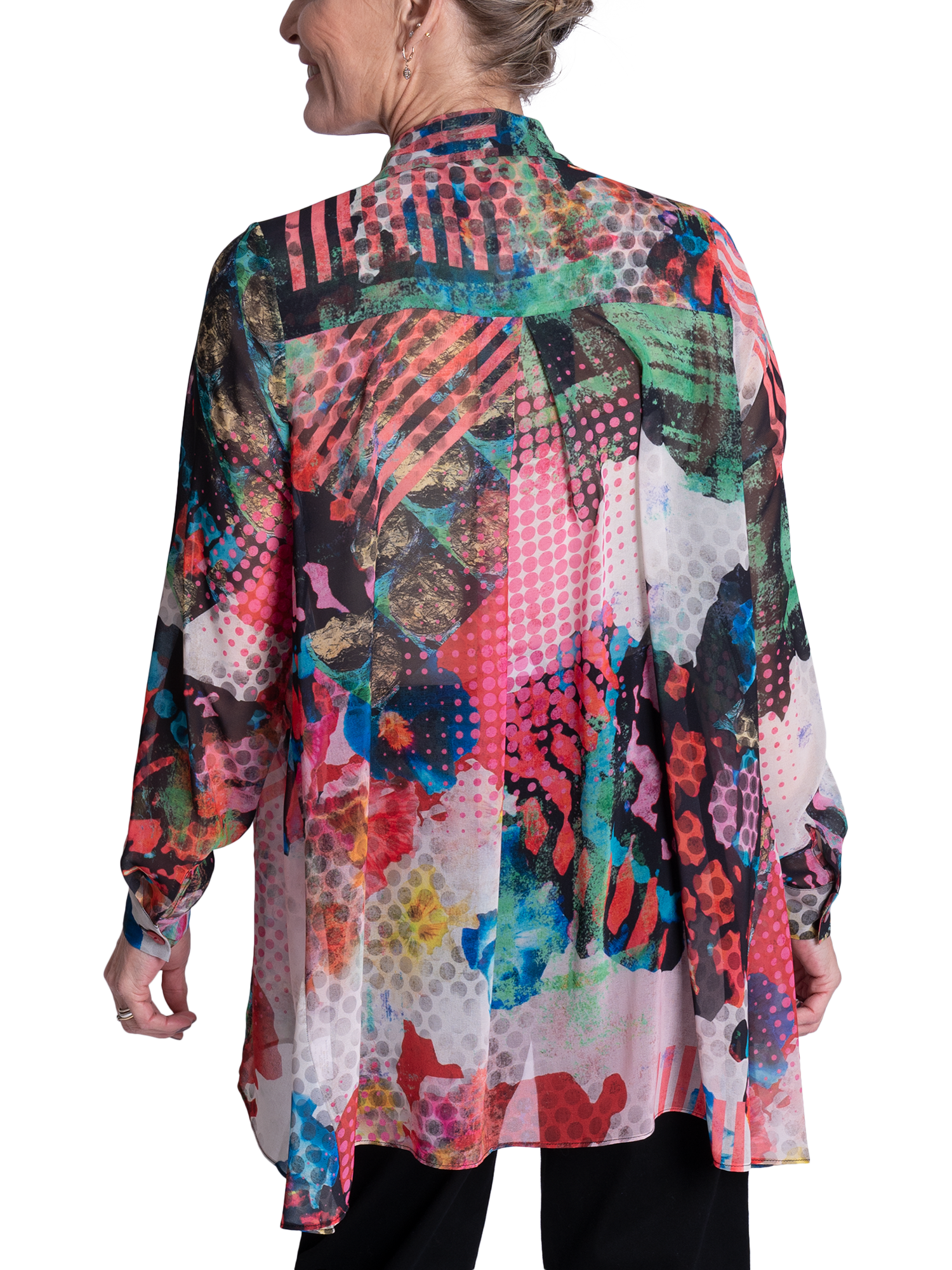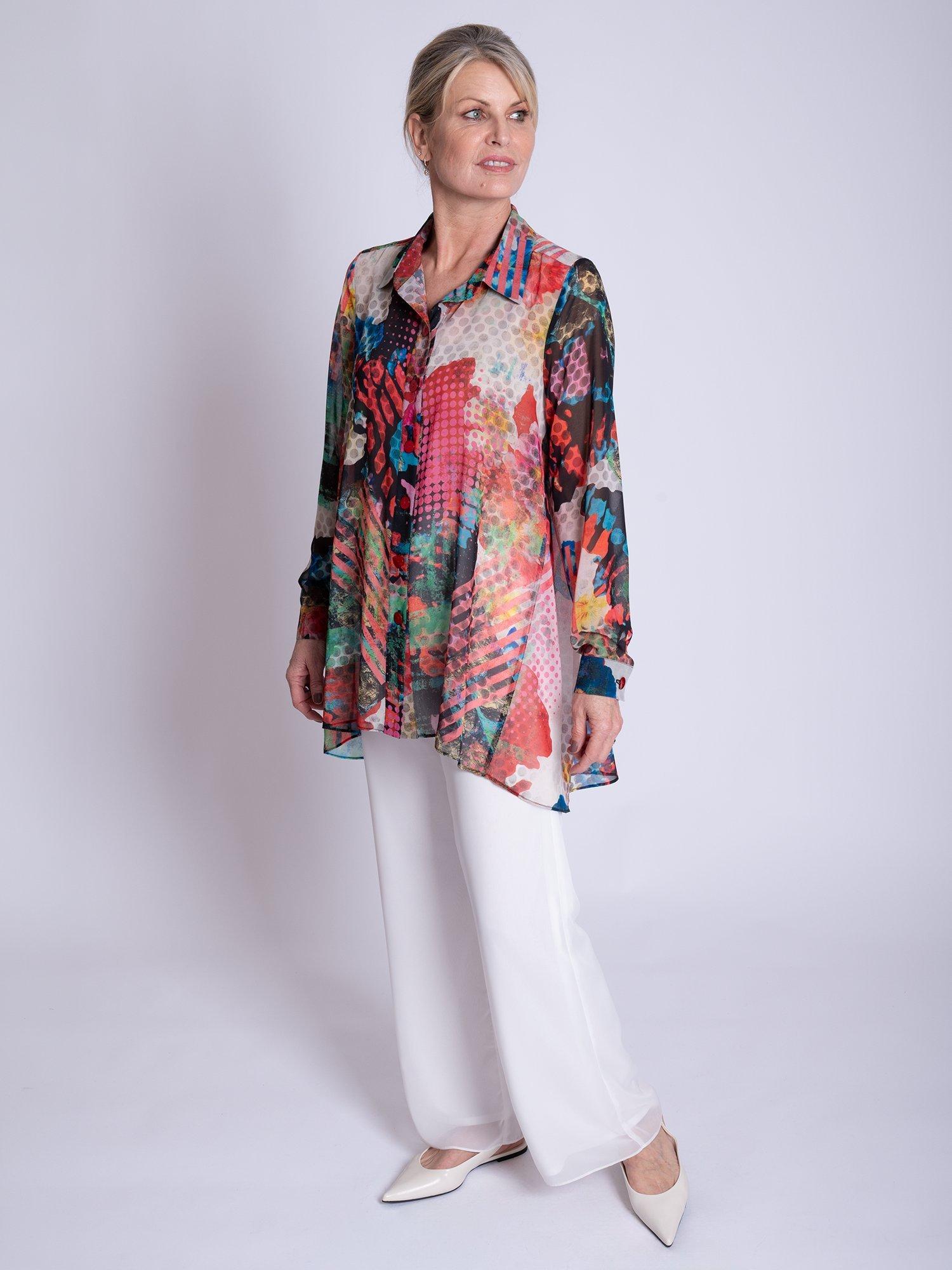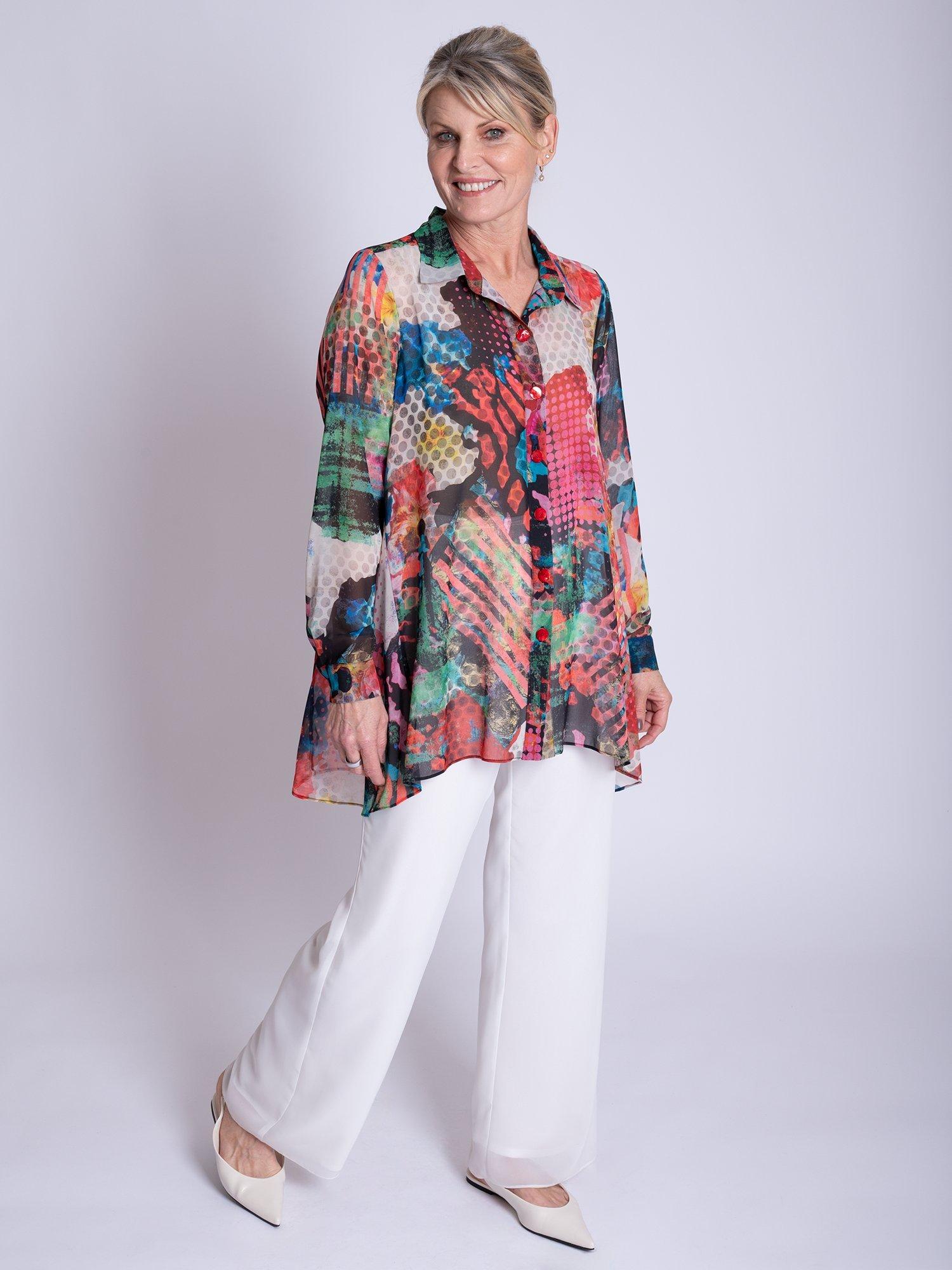 Making an impression on your morning commutes, this swing style blouse will instantly lift your mood with its carnival of patchwork prints. Designed with a crisp collar neckline, long sleeves and high-low curved hemline, it is made from a light yet durable chiffon fabric and is ideal for relaxed daytime wear.