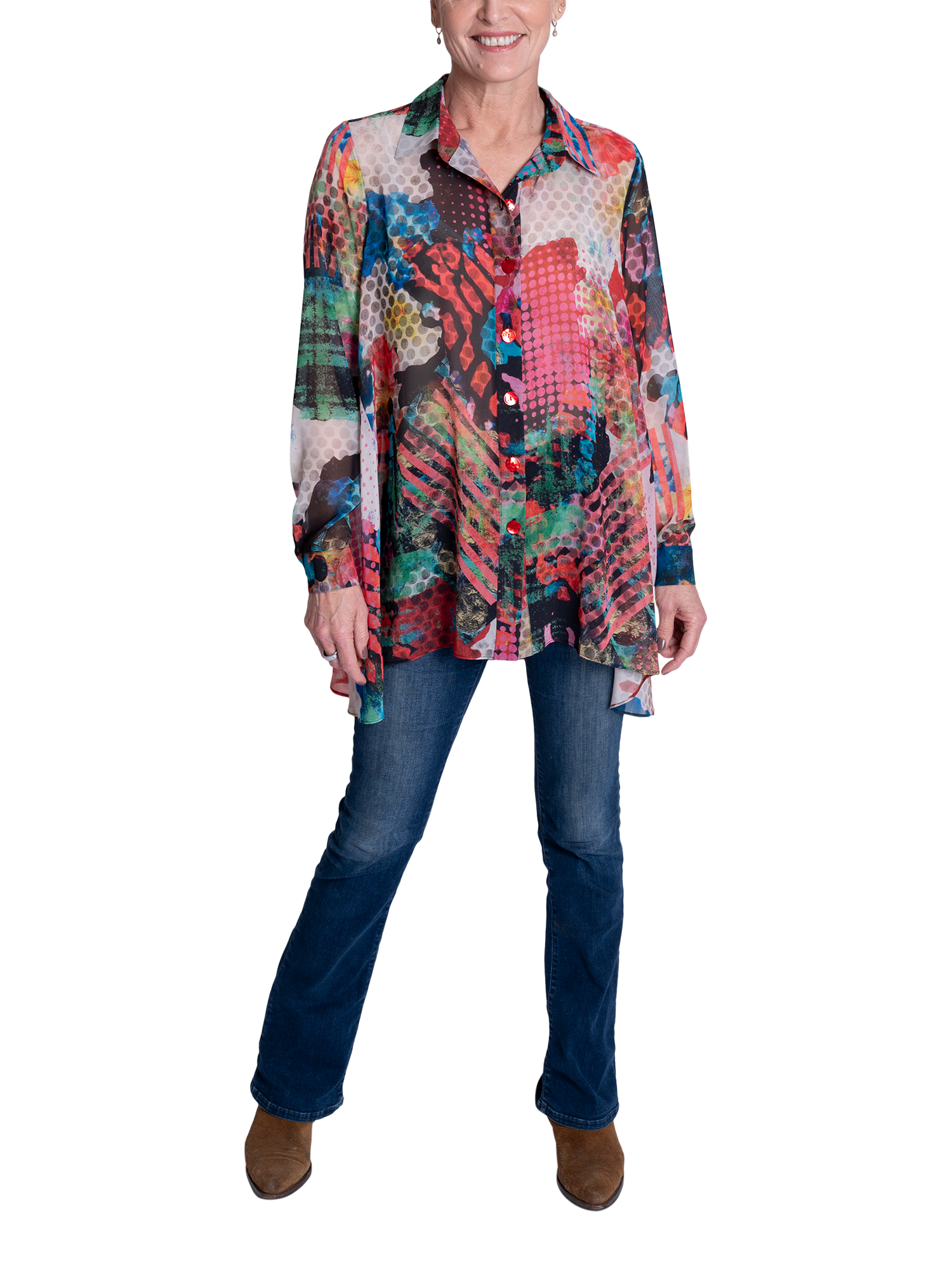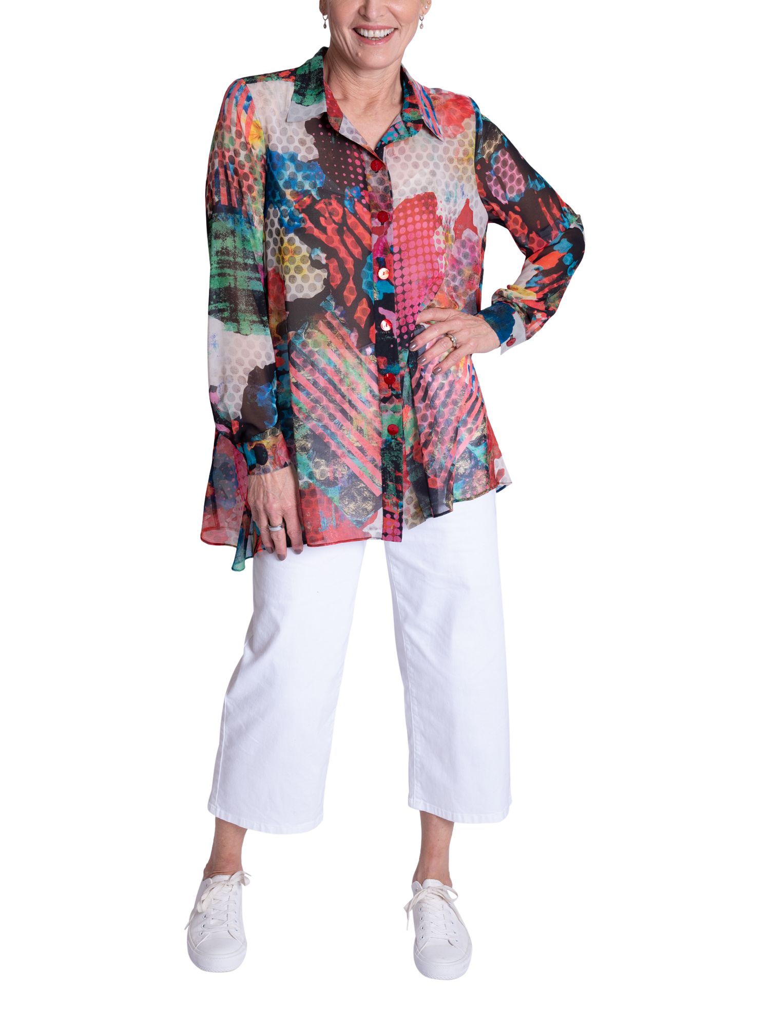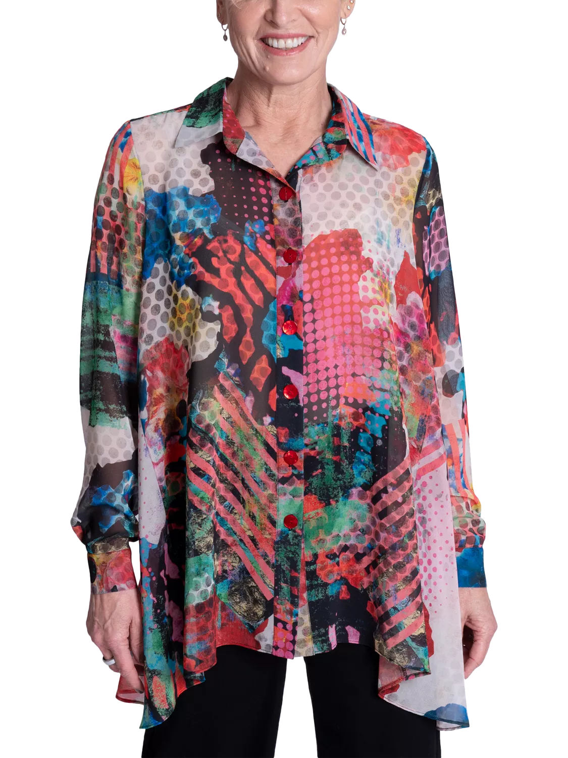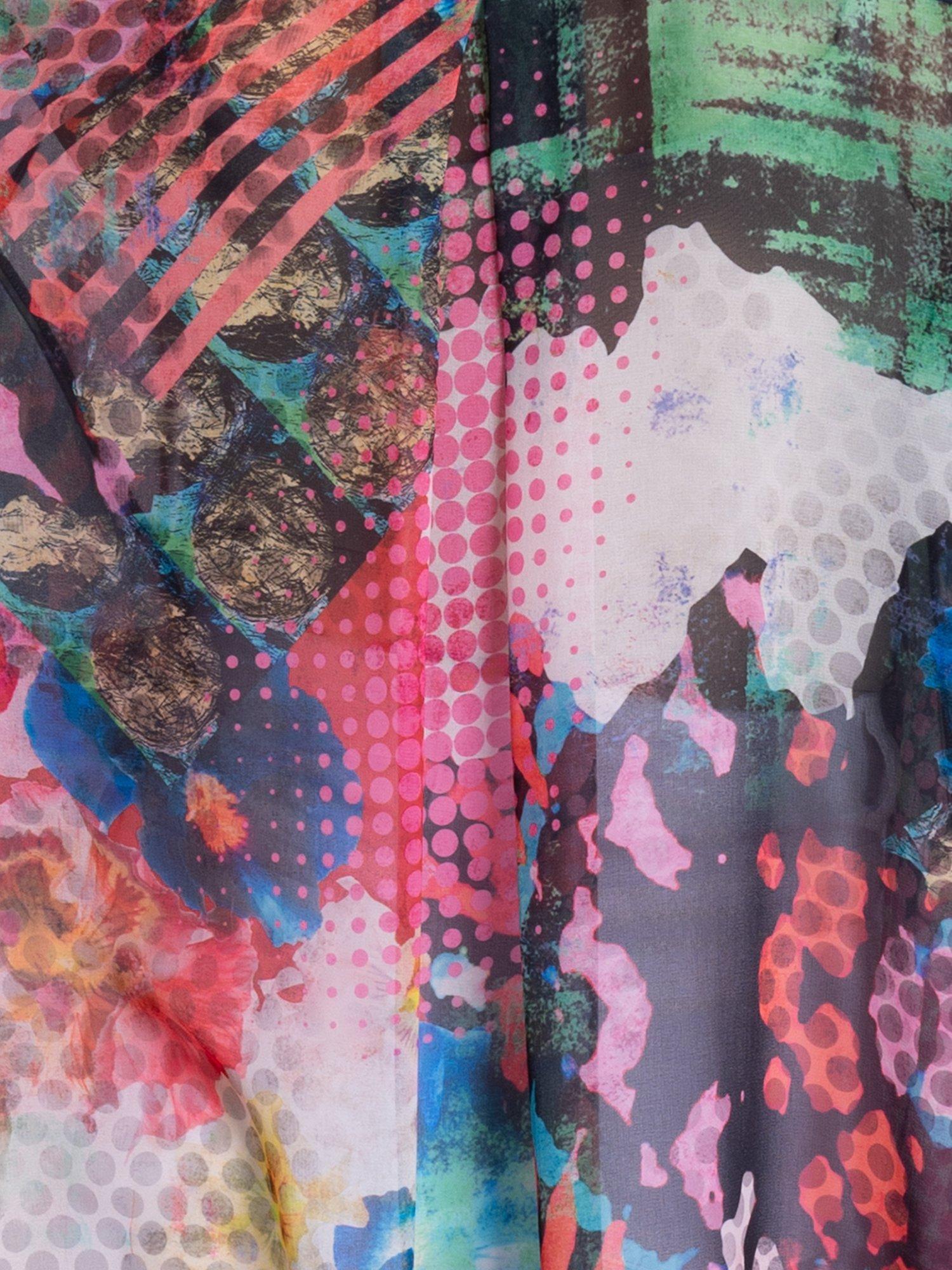 Making an impression on your morning commutes, this swing style blouse will instantly lift your mood with its carnival of patchwork prints. Designed with a crisp collar neckline, long sleeves and high-low curved hemline, it is made from a light yet durable chiffon fabric and is ideal for relaxed daytime wear.