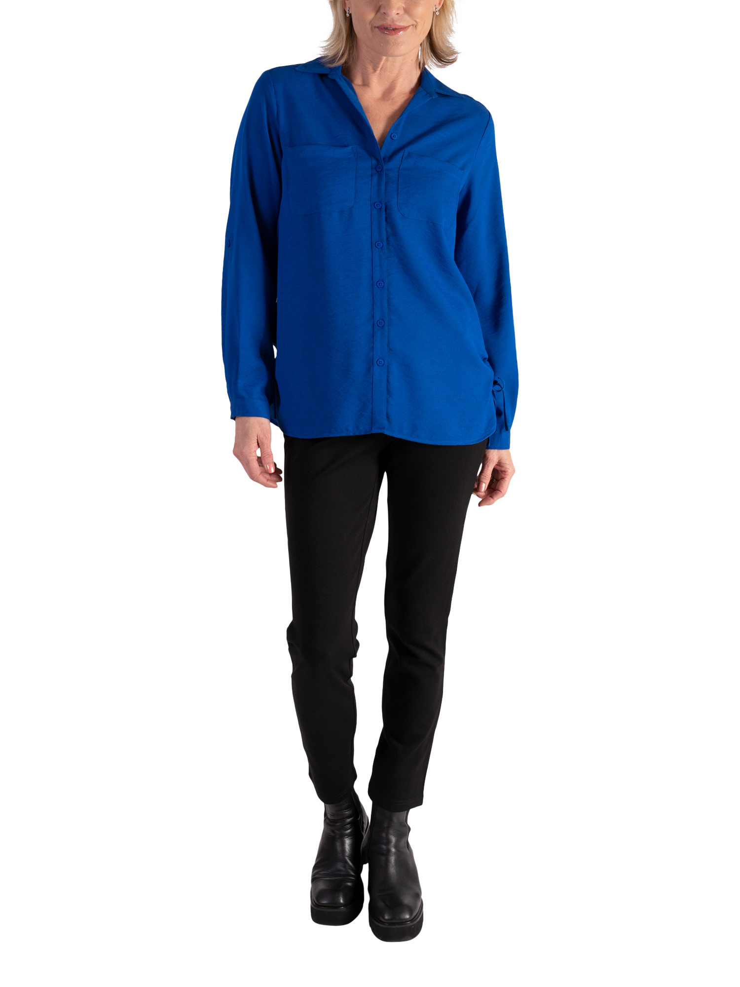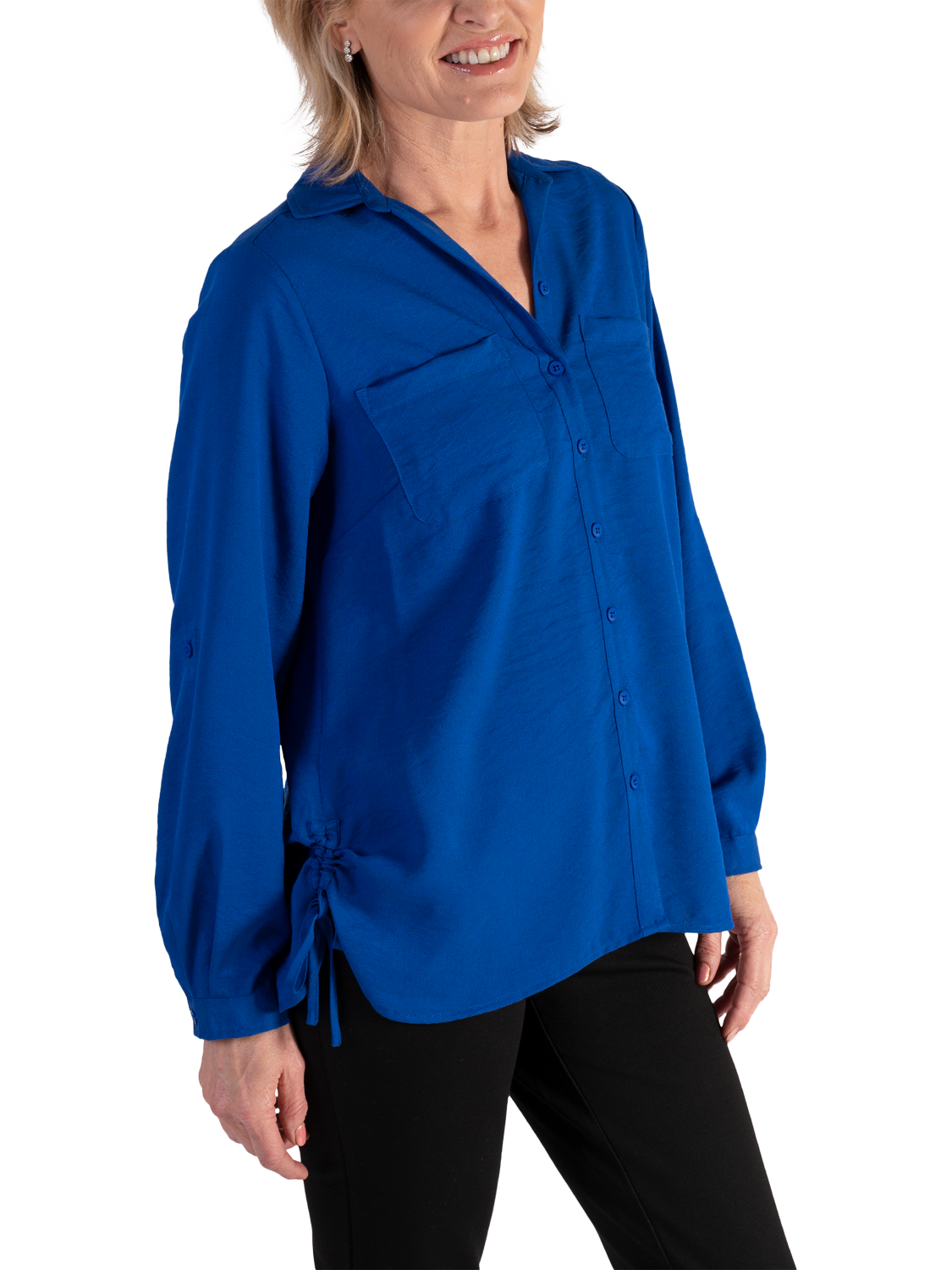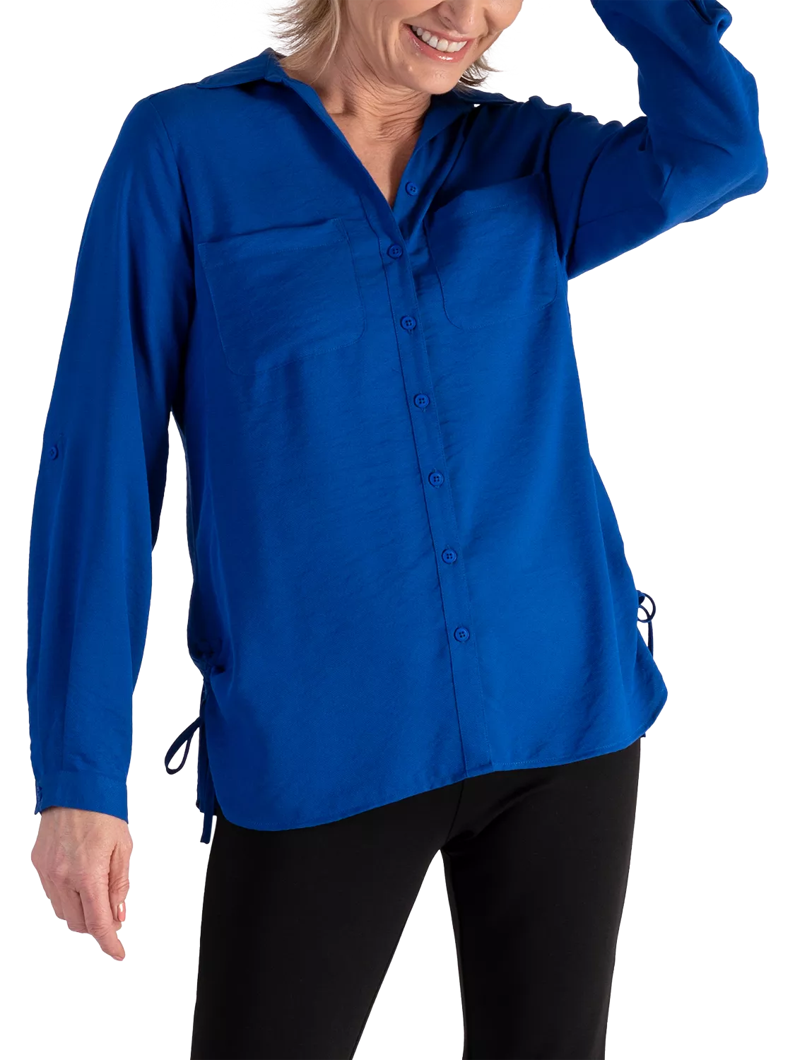 Elevating your everyday, this versatile shirt is crafted from a soft-to-the-touch durable fabric for longevity of wear. Designed with a crisp collar neckline and long roll up sleeves, both sides have a tie that create a ruched detail feature. Ideal for both relaxed daytime wear or smarter occasions.