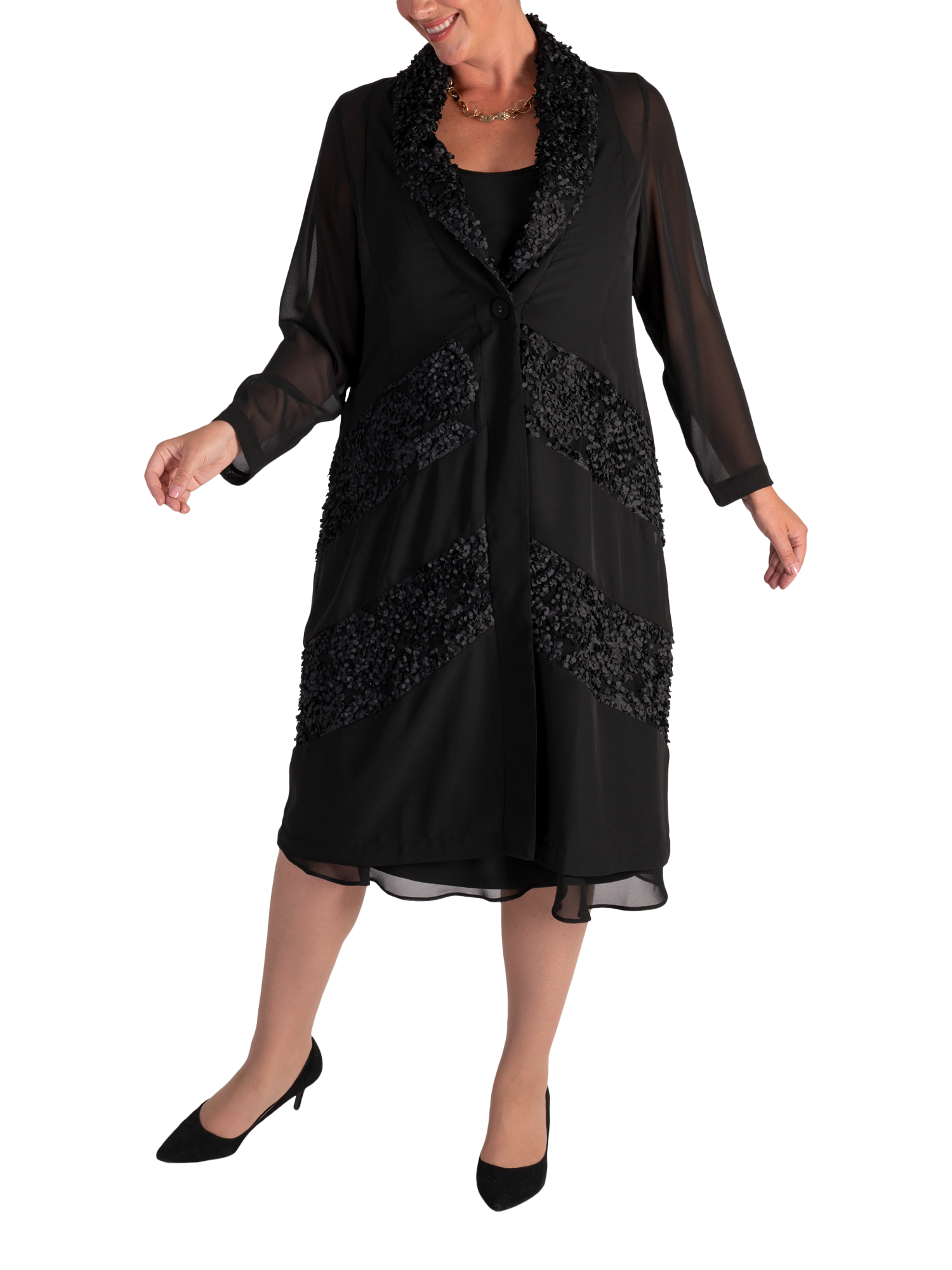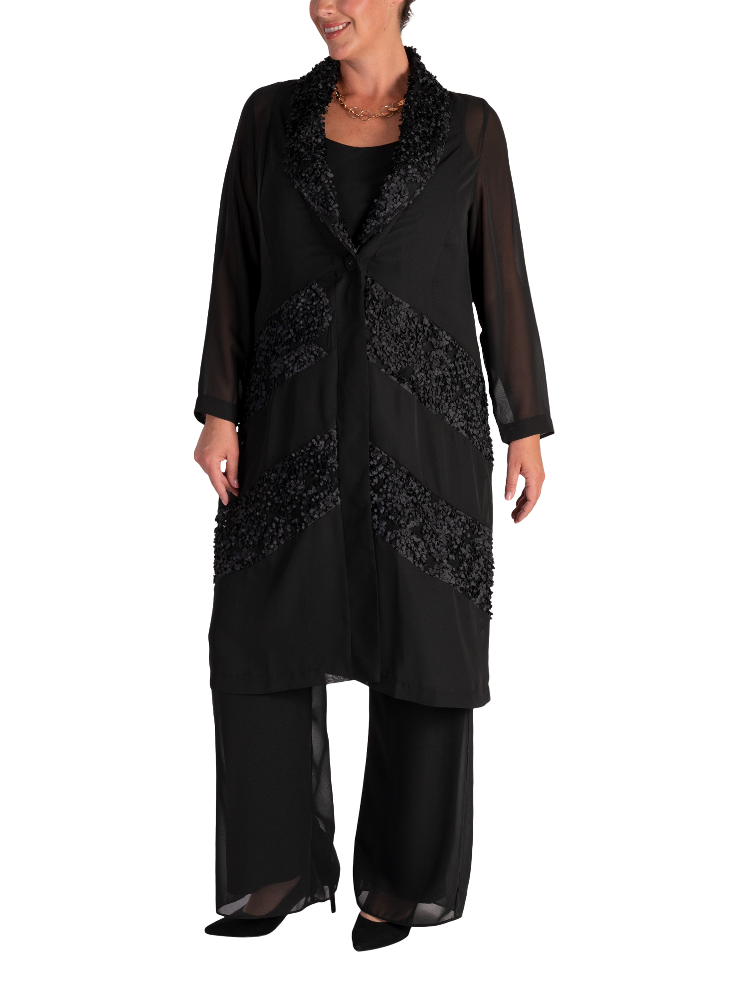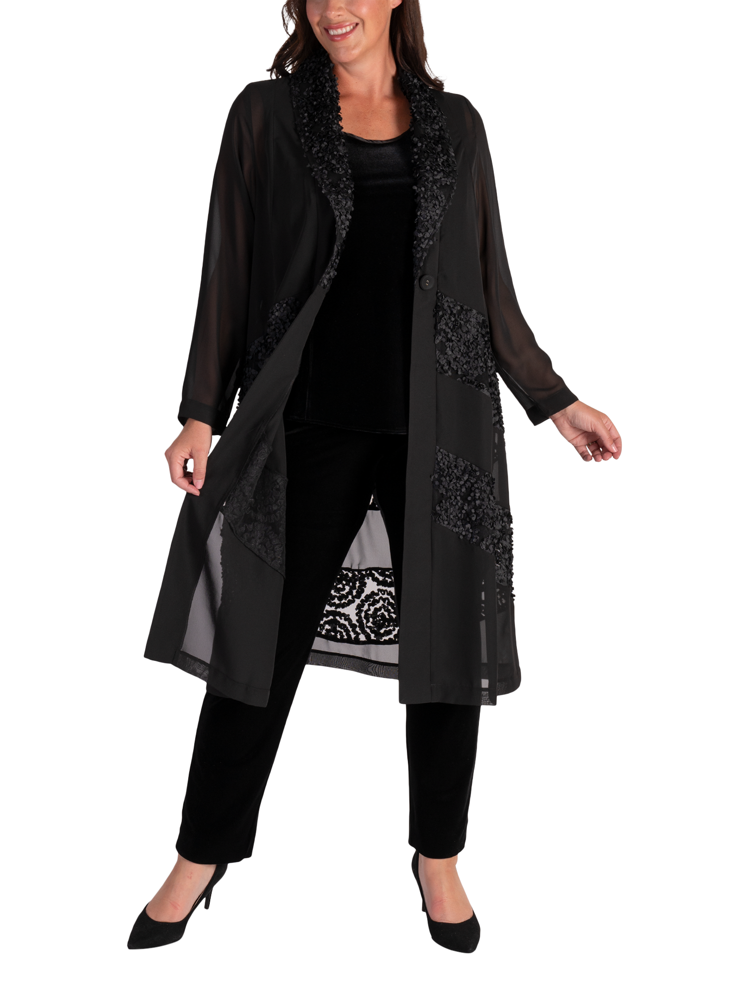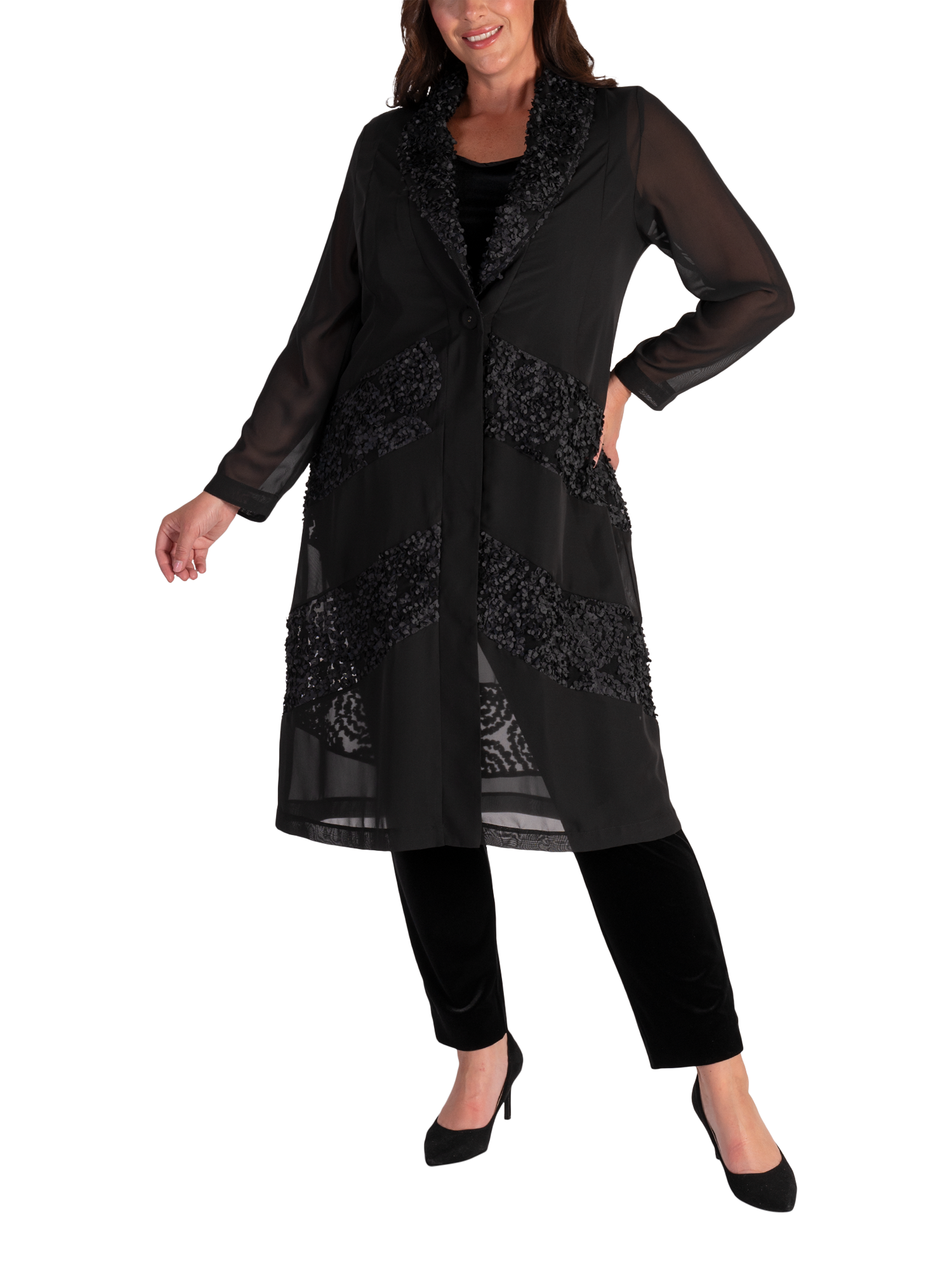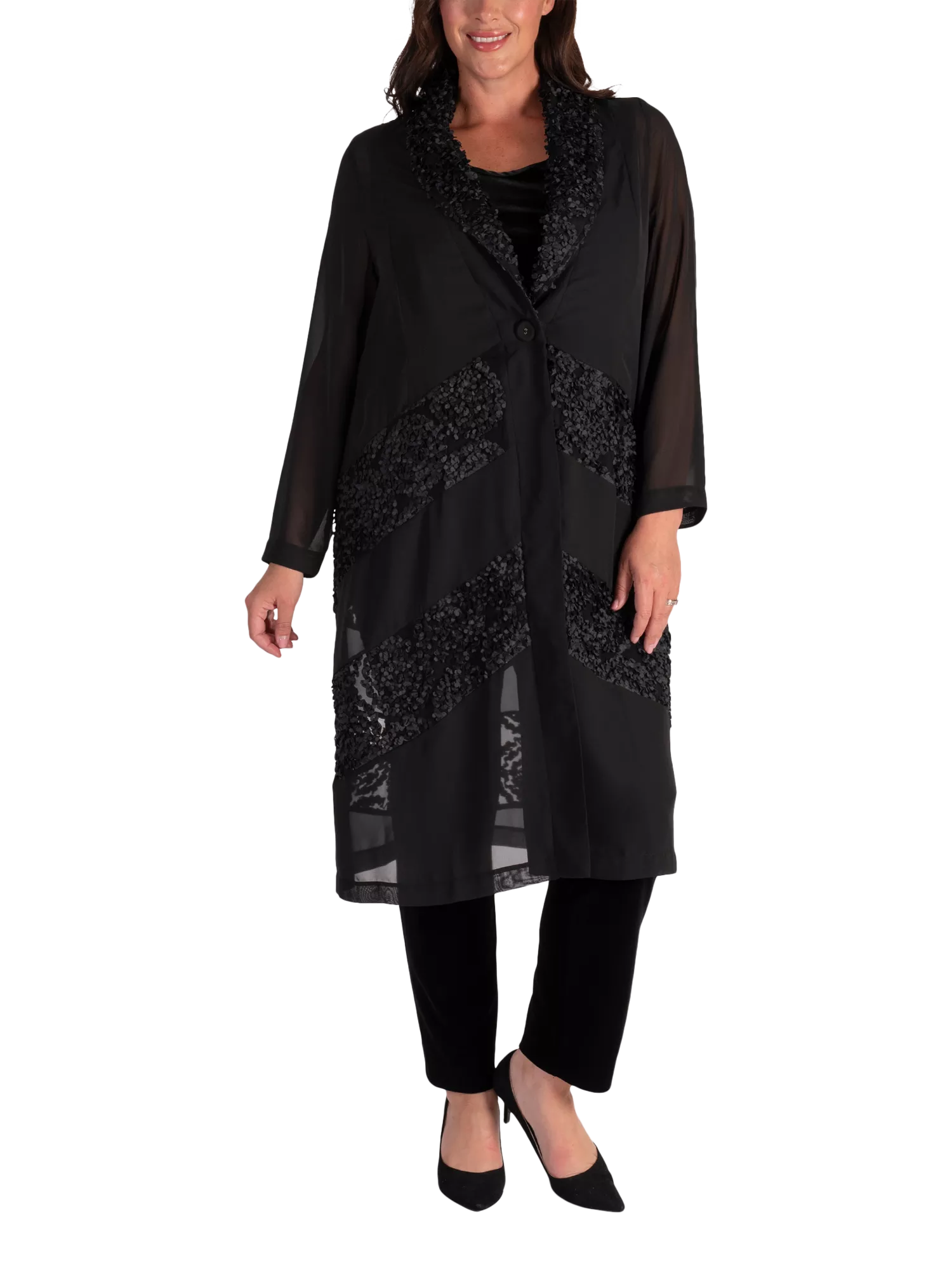 Cut from a lightweight fabric for gracefully fluid wear, this single buttoned chiffon coat from chesca combines stylish coverage with eye-catching chevron insets in a contemporary confetti mesh.