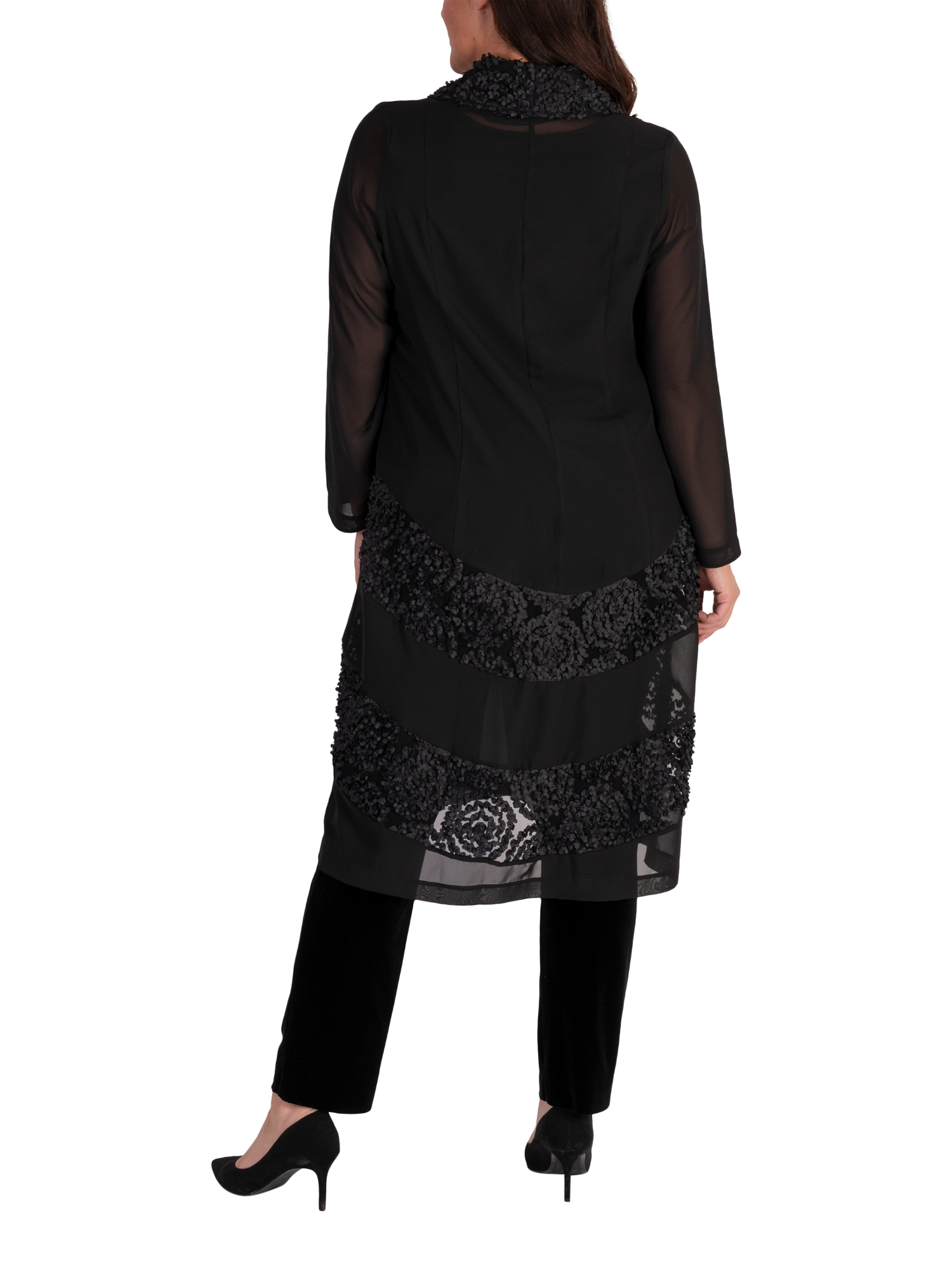 Finished with French seamed panels, long sleeves and a contrast shawl collar, this style instantly flatters with its longline cut.Mix with velvets for stunning party outfit, or match with chiffon trousers and camisole from the collection to create a chic occasion look.