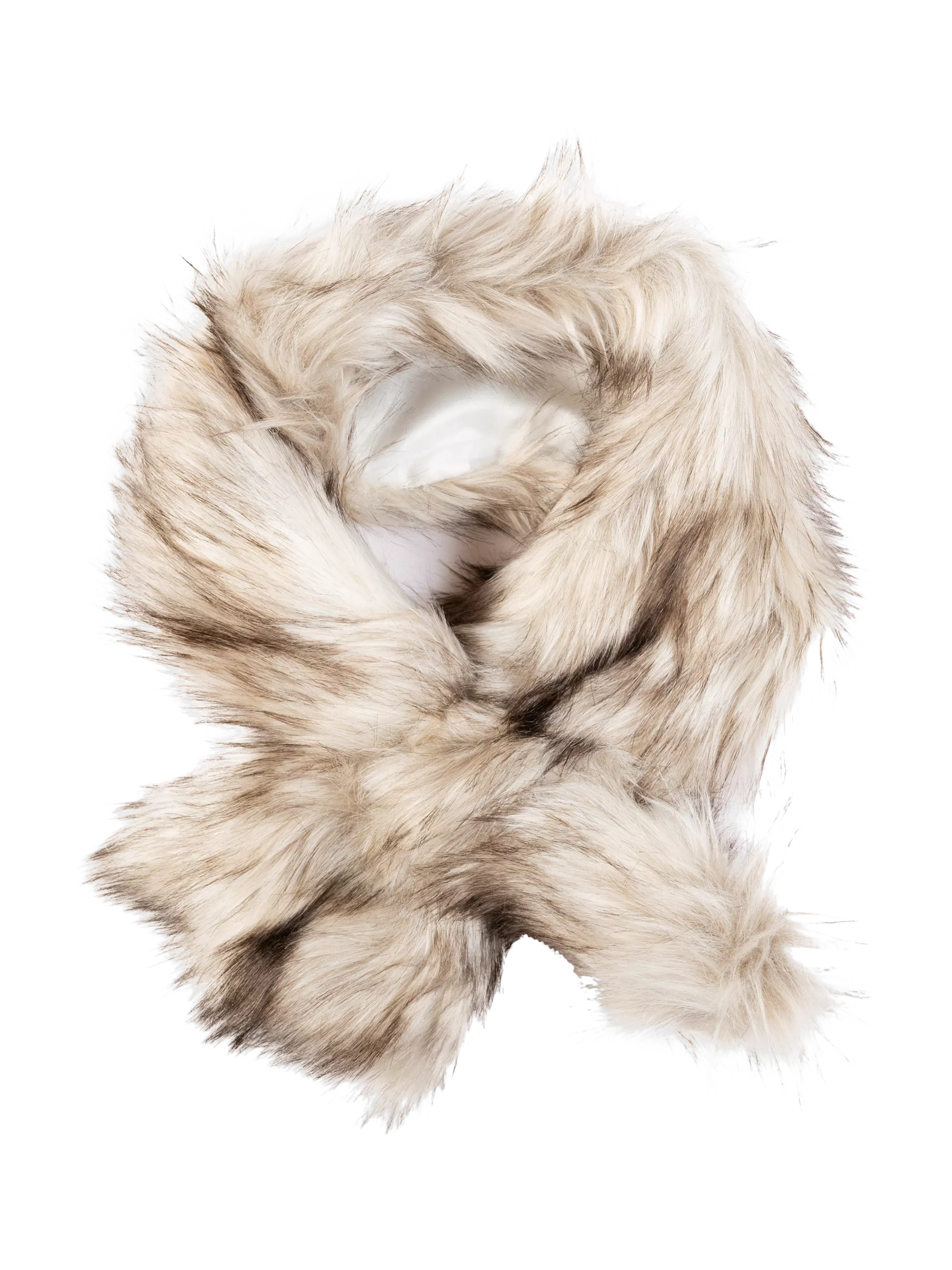 Luxurious tip faux fur wolf scarf. This scarf has a satin underside and a slip-through knot for easy fastening. Wear over your coat or jumper to keep you warm and look glamorous on those cooler winter days.