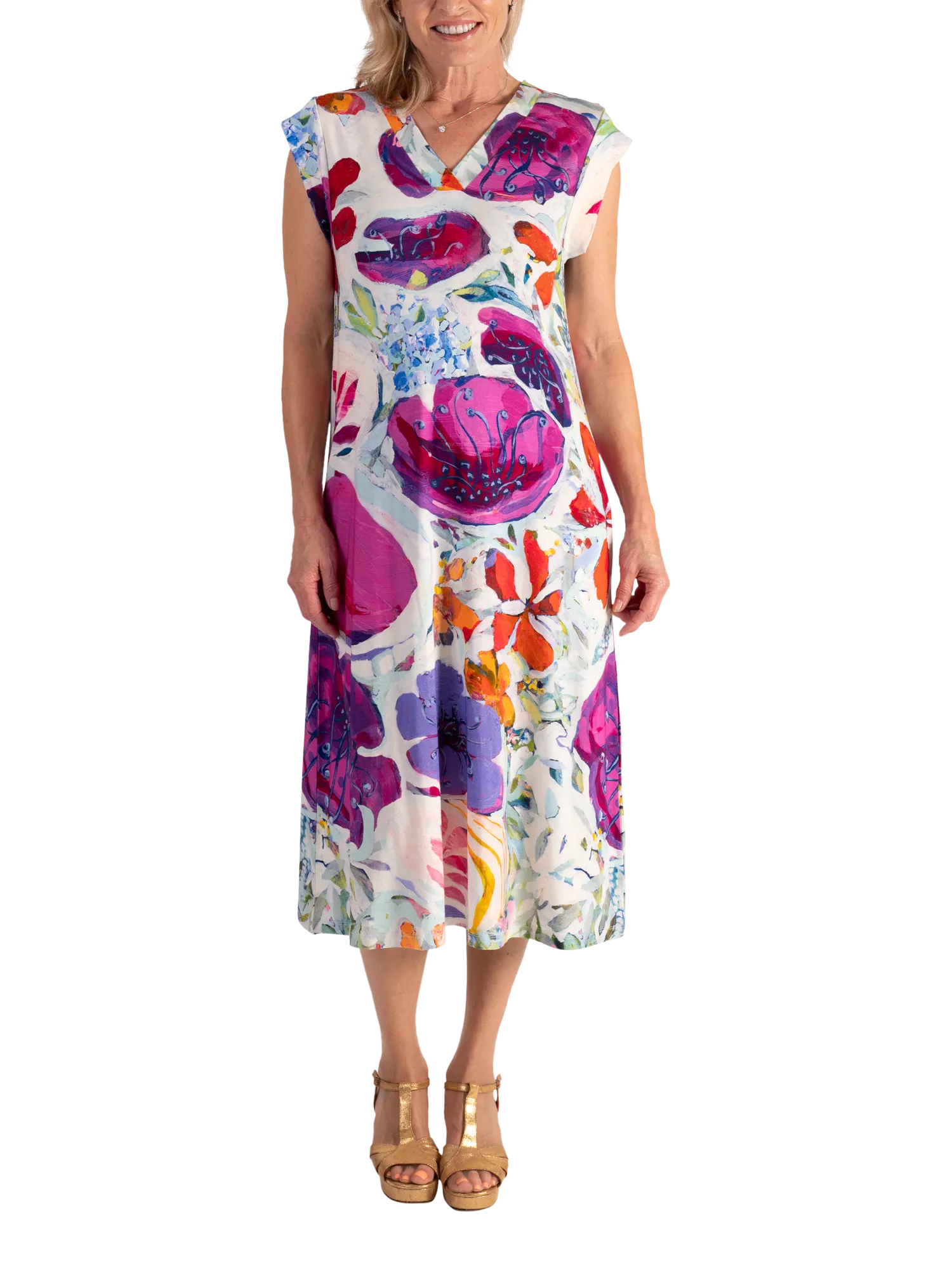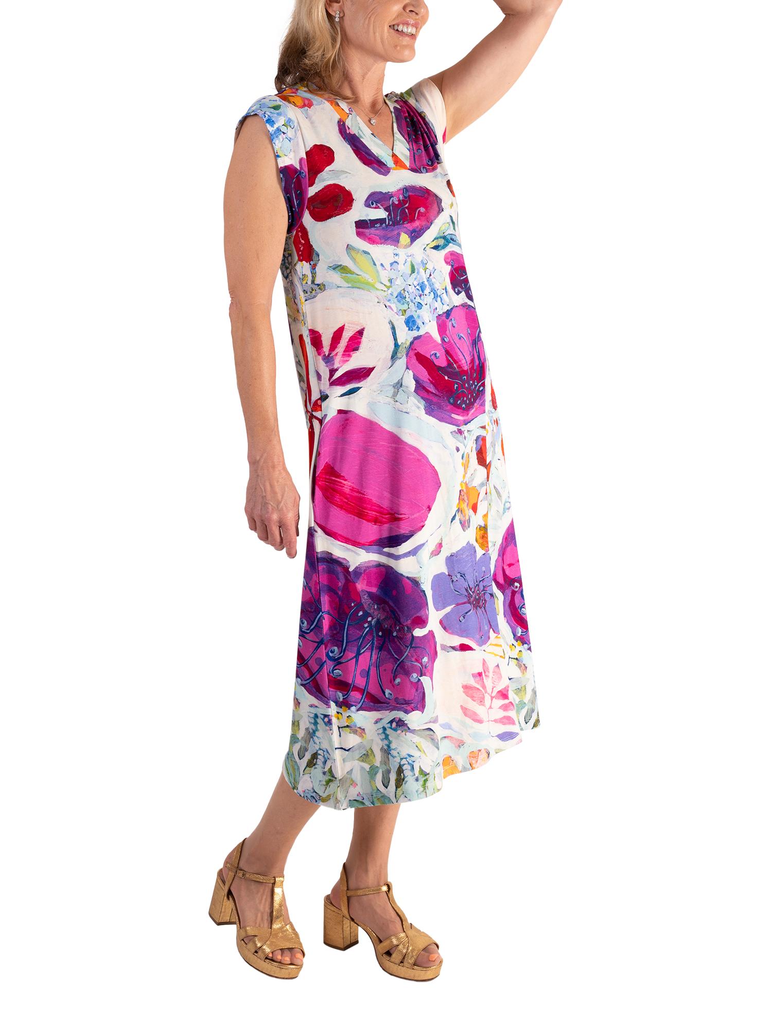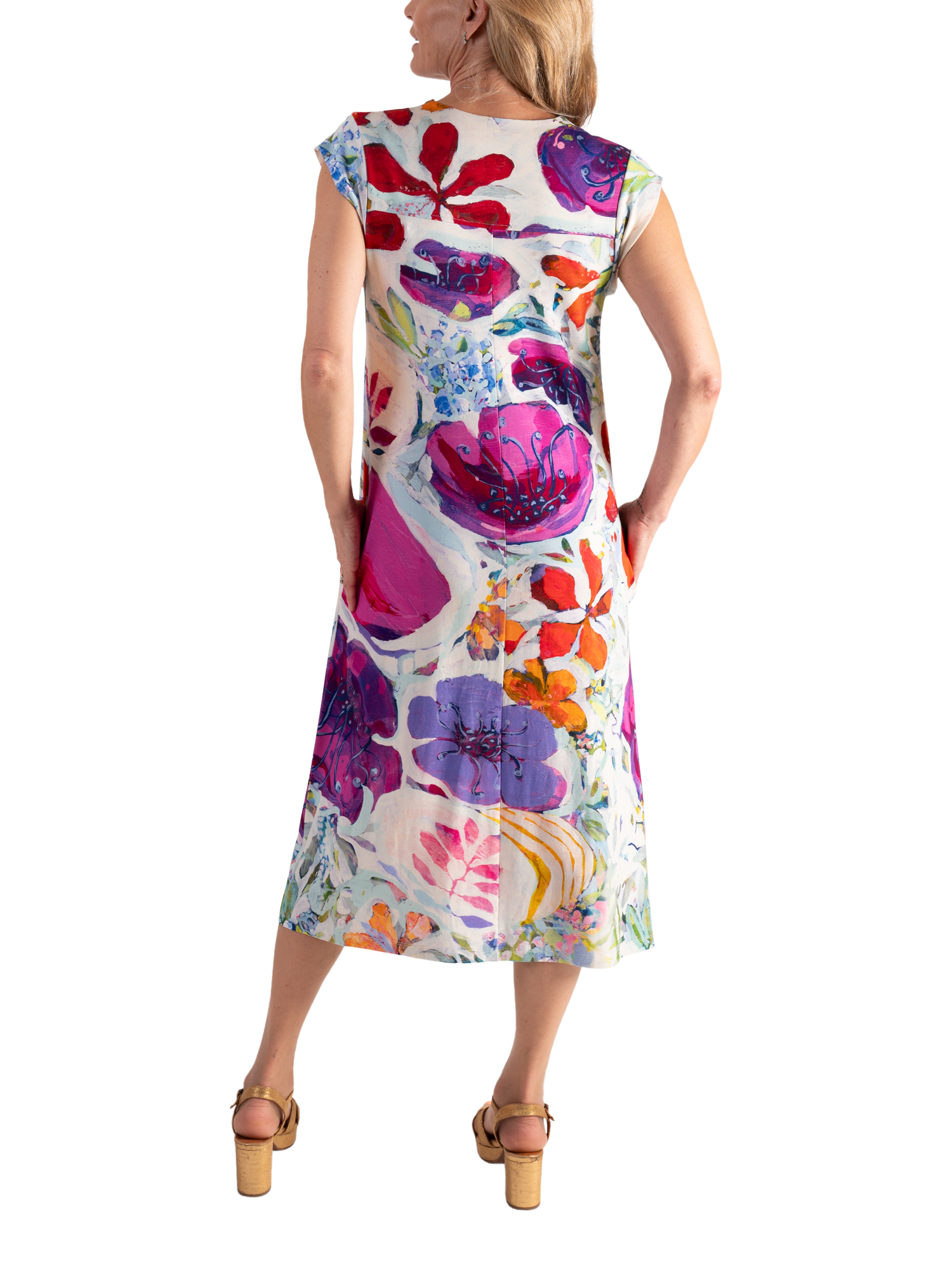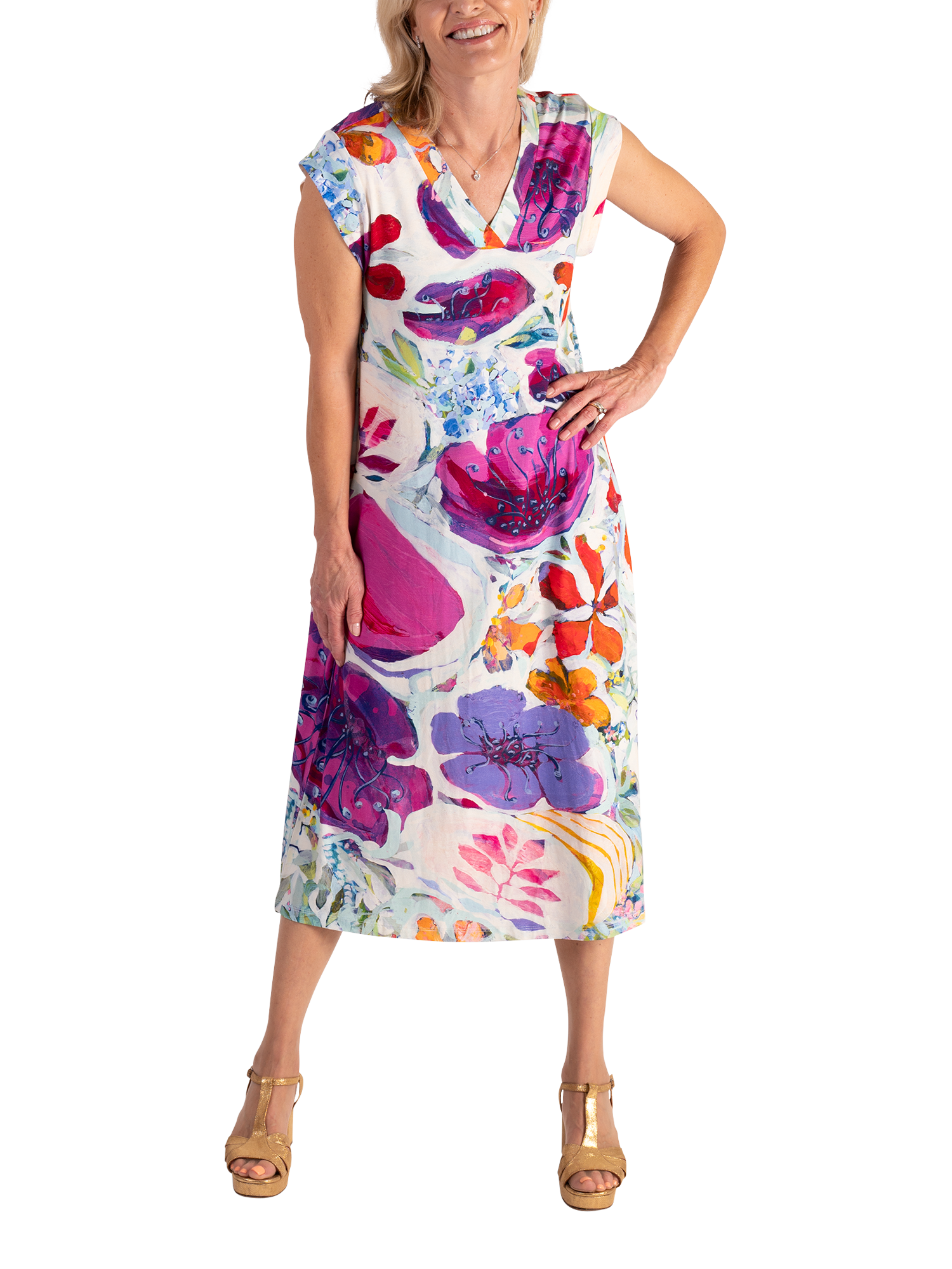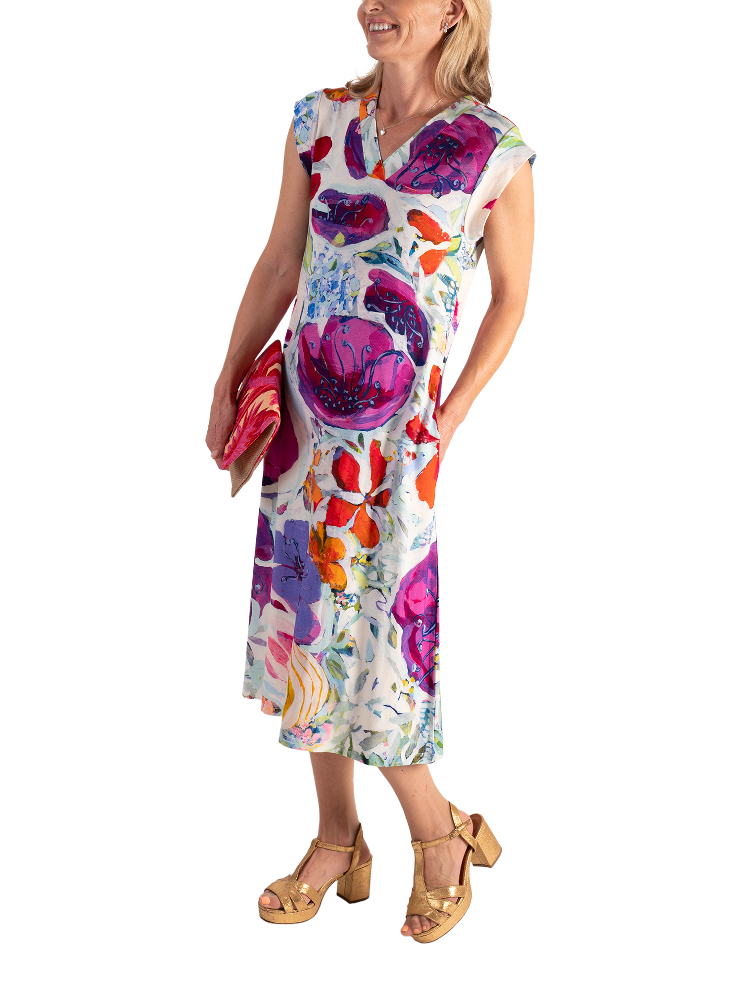 Making everyday dressing effortless, this jersey dress will instantly lift your mood with its vibrant artistic floral print. Framed with a contemporary V-neckline, cap sleeves and finished with two side seam pockets, this piece ensures long-lasting comfort with its soft jersey handle. The stunning floral print makes this dress an ideal choice for any summer event, holidays abroad and summer days in the city.