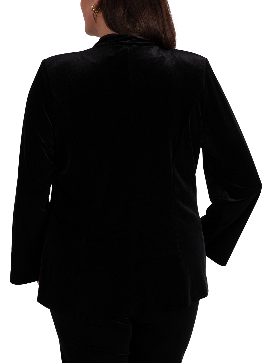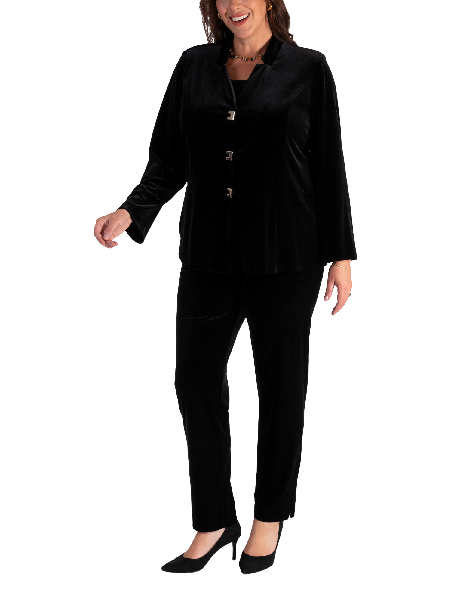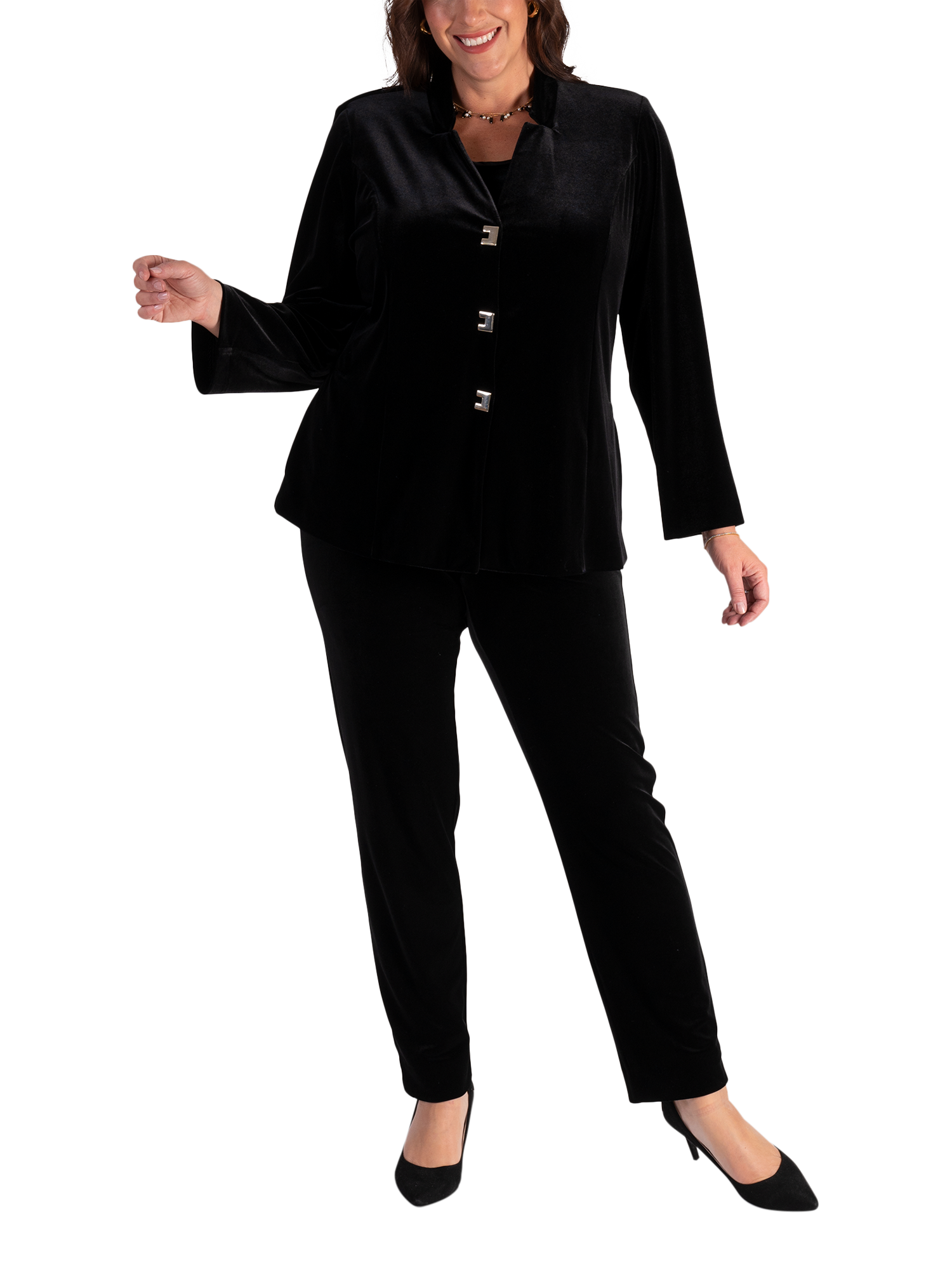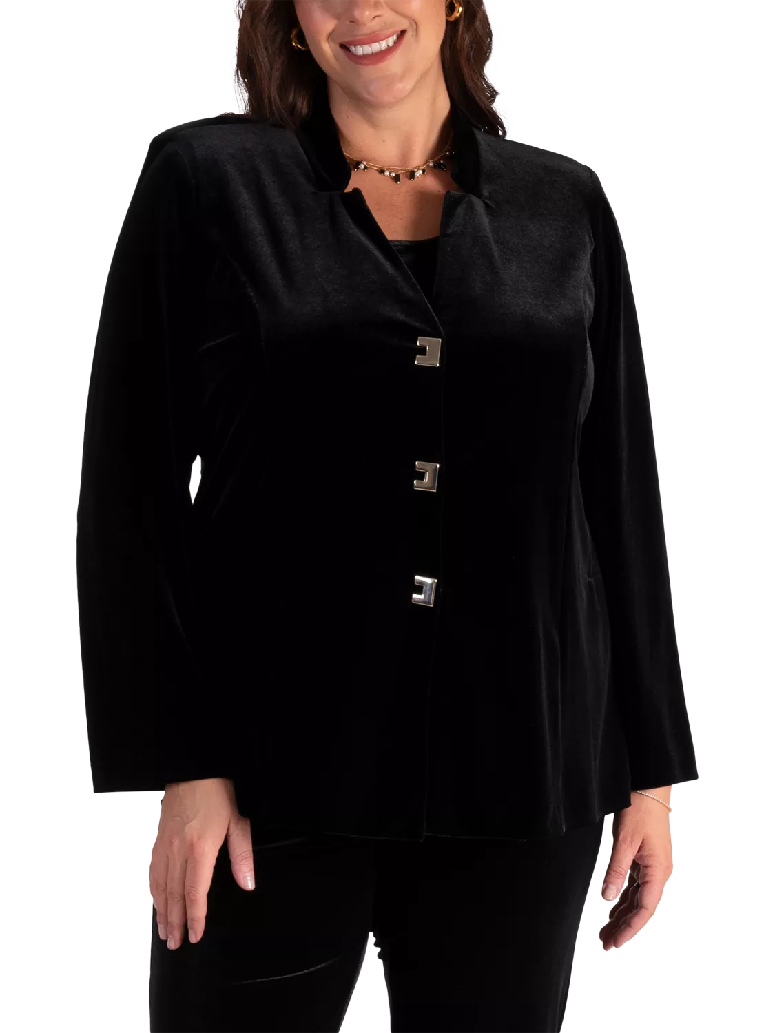 This velvet jacket from Chesca creates instant party style. Crafted from a soft stretch velvet, the jacket has a luxurious aesthetic yet feels comfortable to wear. Designed with a charming notch neckline, this jacket which can also be worn closed as a top, is finished with three gold fastenings for a statement finish.