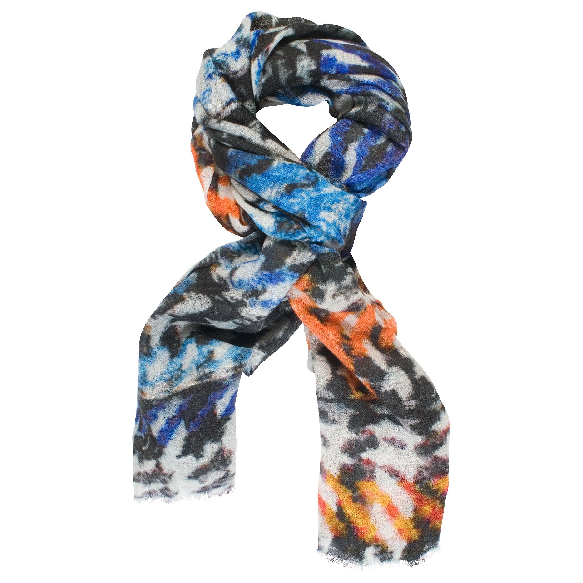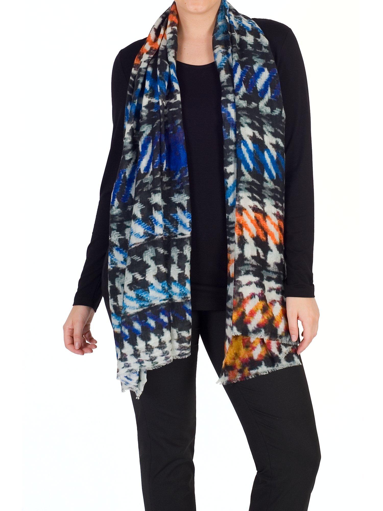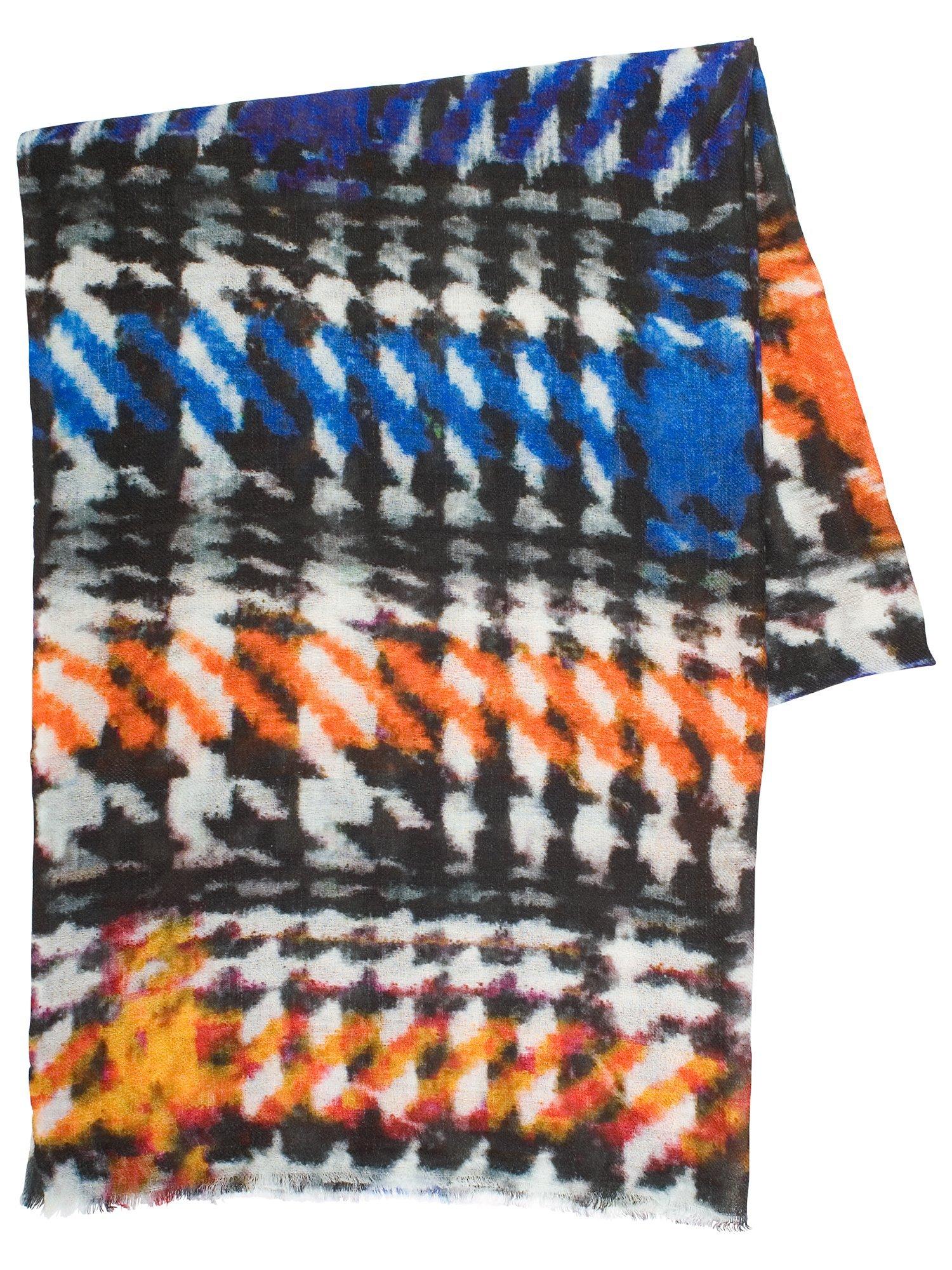 Woven from a luxurious wool and silk blend in a bright abstract take on classic tartan, it is finished with fine tassels at each end.