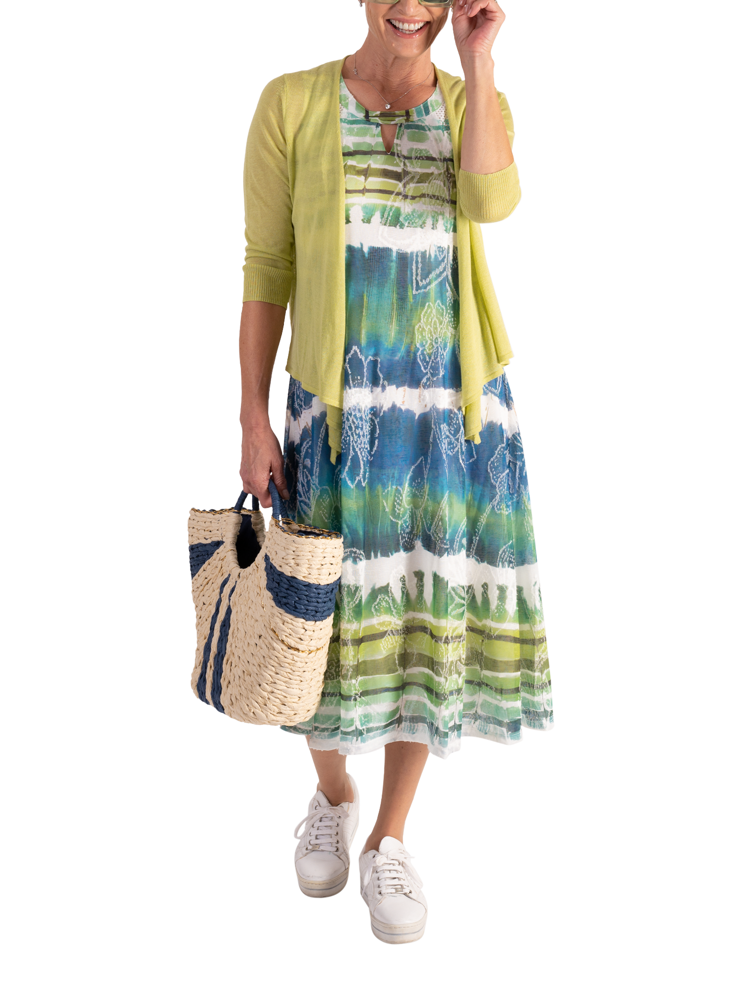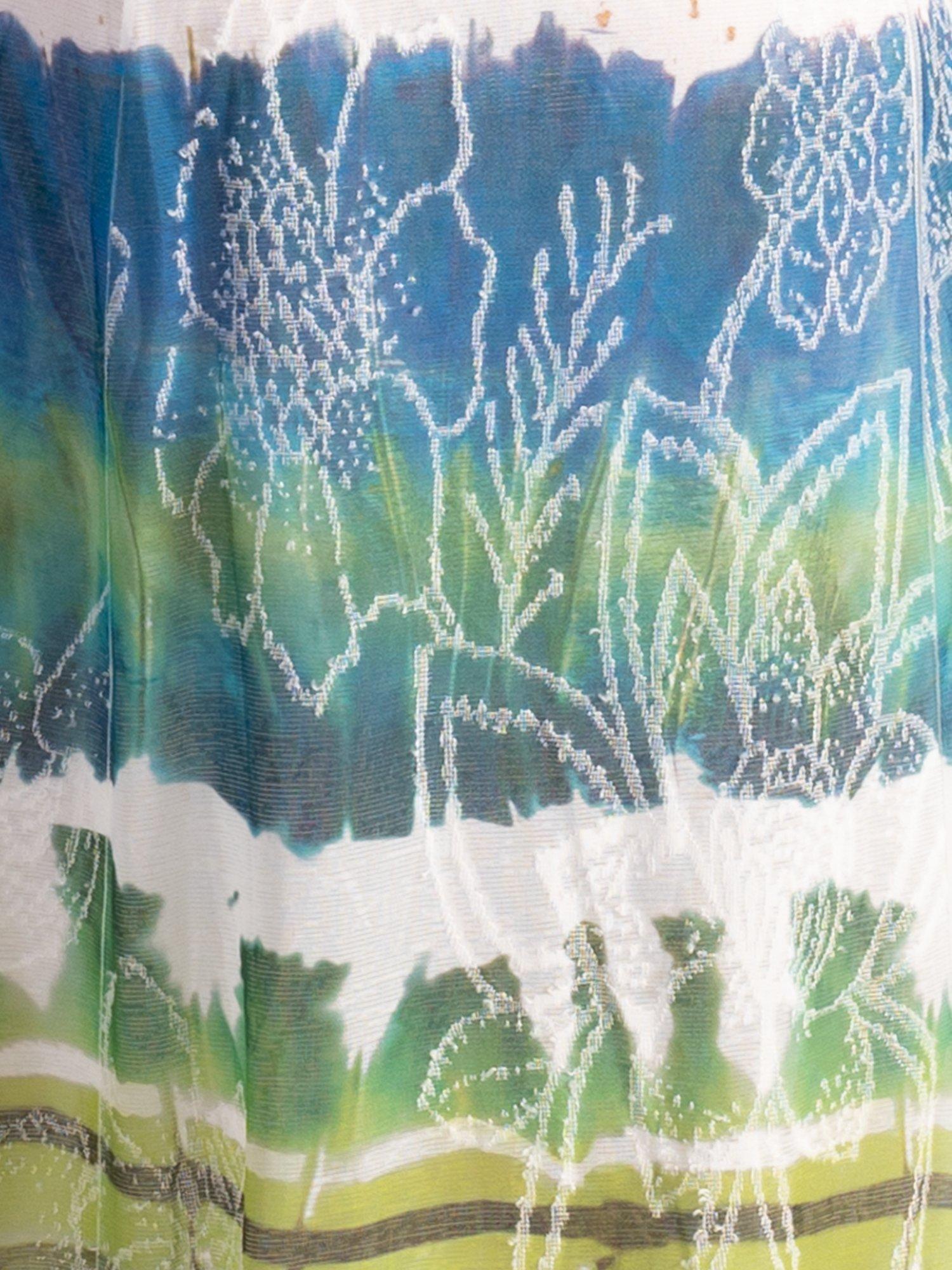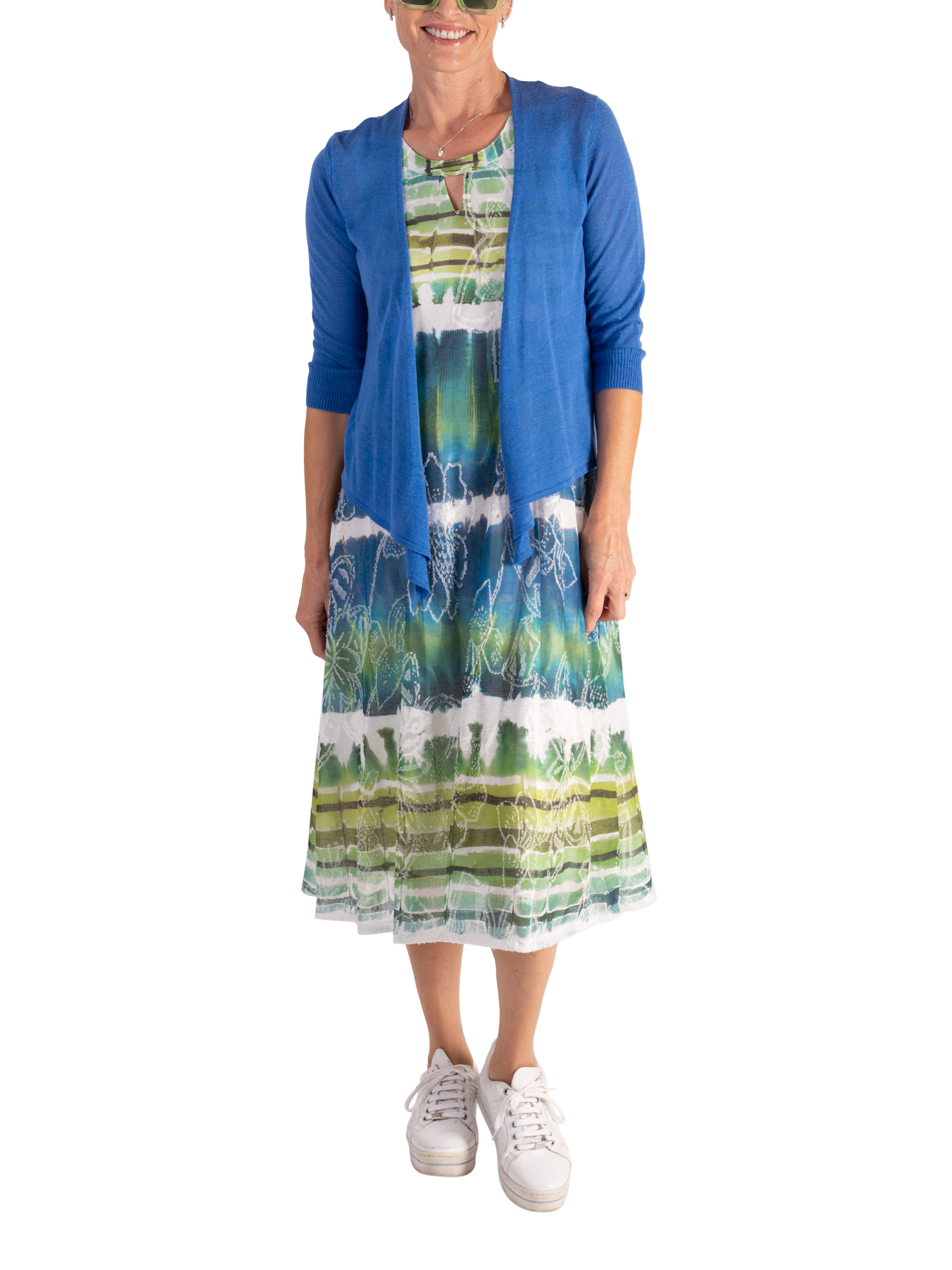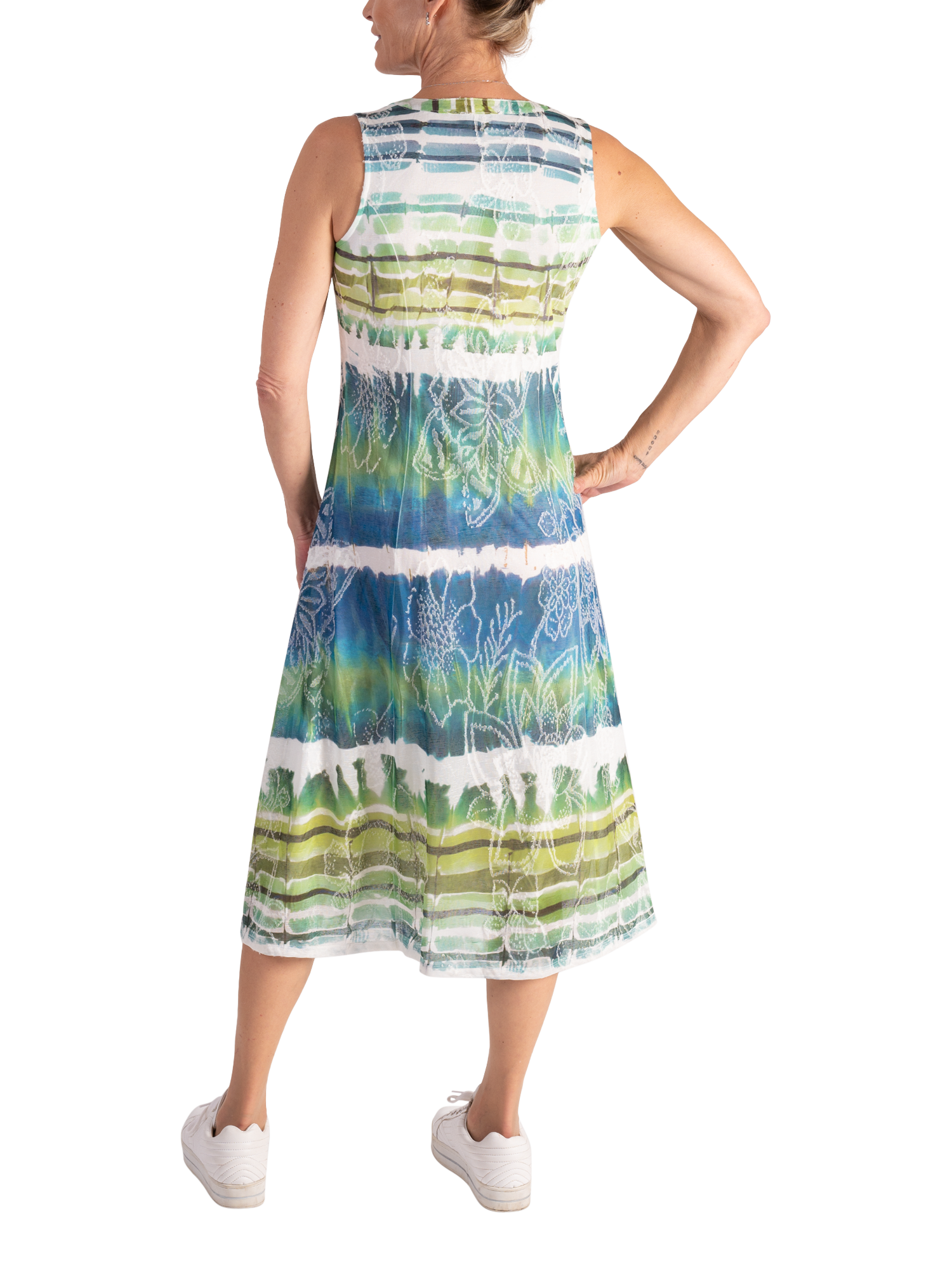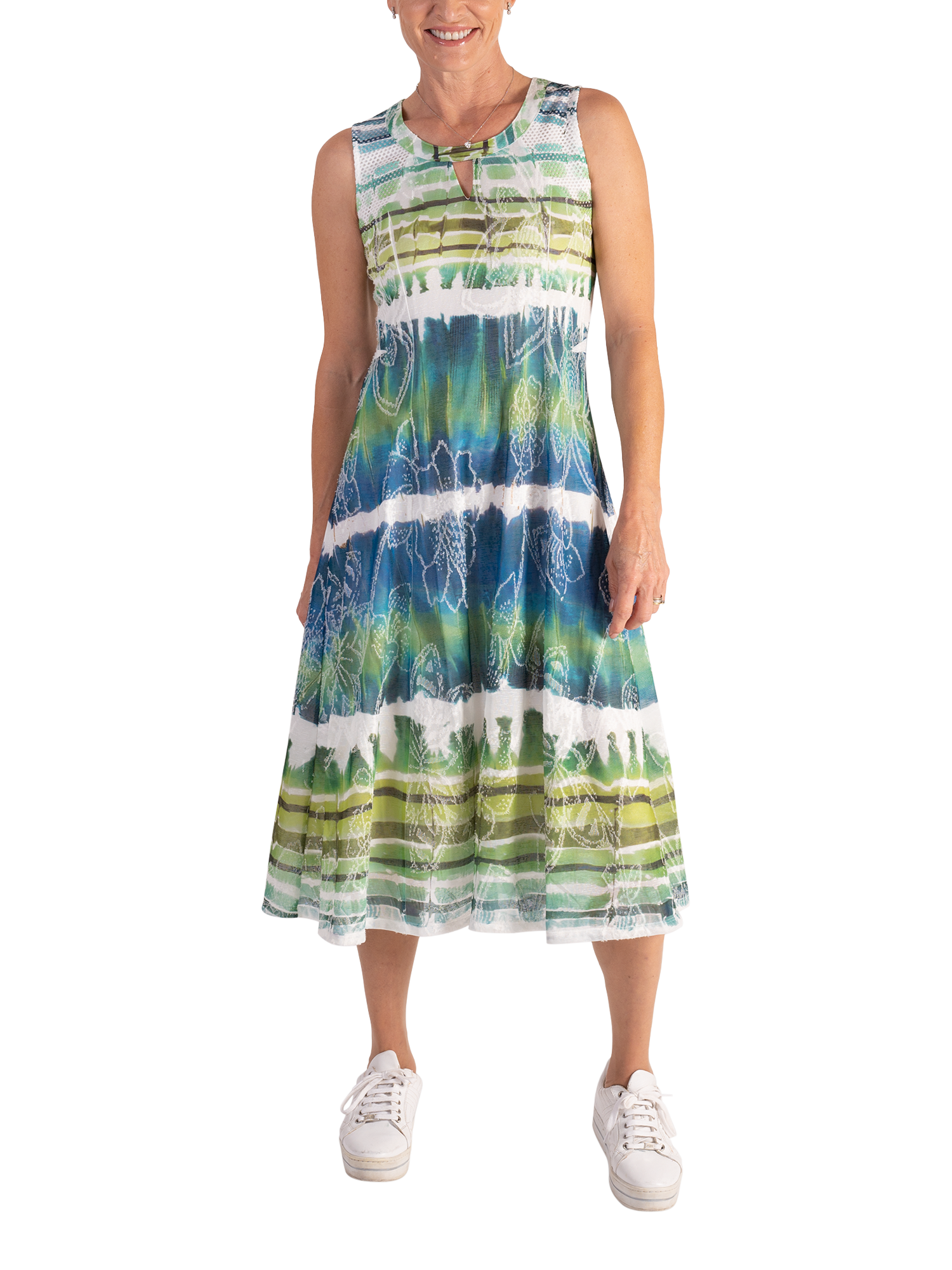 In an A-line silhouette, this midi dress is decorated with an abstract tie-dye effect striped print in tranquil hues combined with a floral jacquard detail for added charm. Sleeveless, and framed with a cut-out neckline, it pairs easily with a shawl or bolero for any summer's social event.