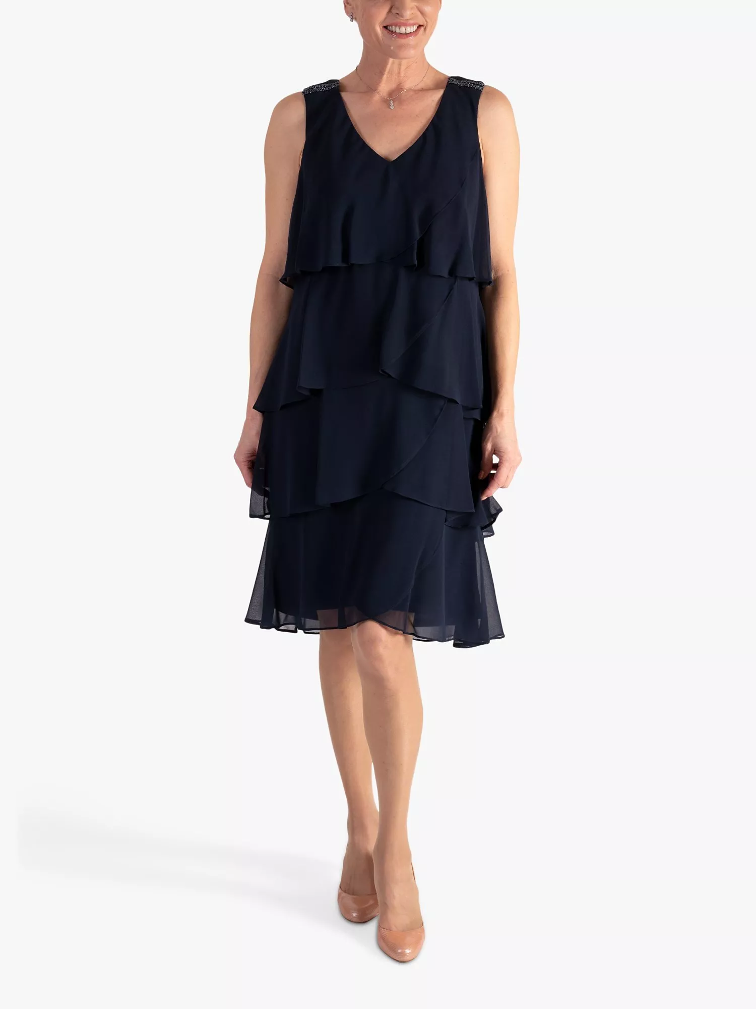 Designed in a classic, shift shape, this knee length dress from chesca is made from a resilient fabric. With a universally flattering v-neckline, this sleeveless style is all about letting the embellishments shine.