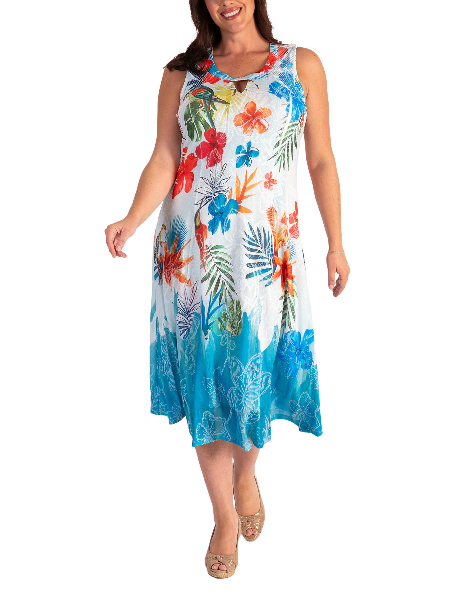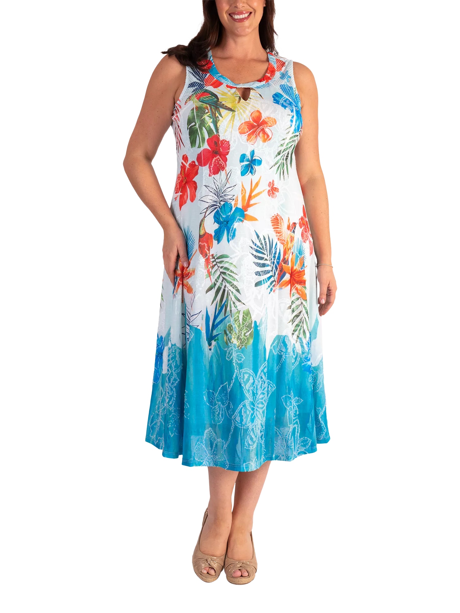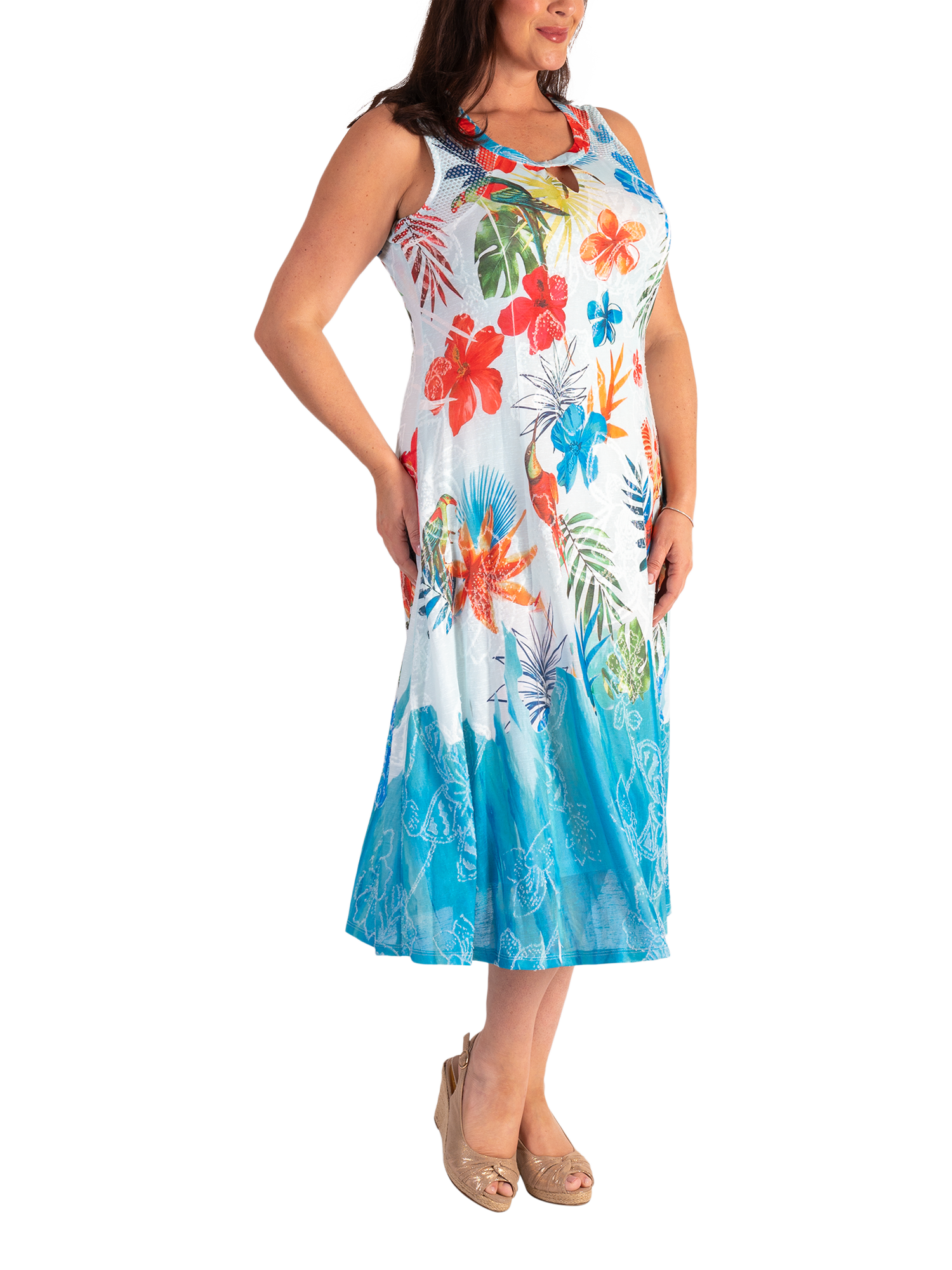 Set in a simple, A-line shape, this midi dress is crafted from a comfortable and breathable fabric for ease of wear. Featuring a round neckline with modern cut-out detailing on the neckline, this sleeveless style is offered in an eye-catching exotic floral and parrot jacquard print.