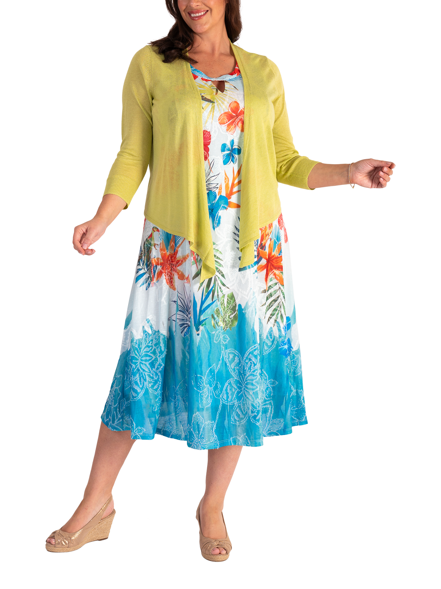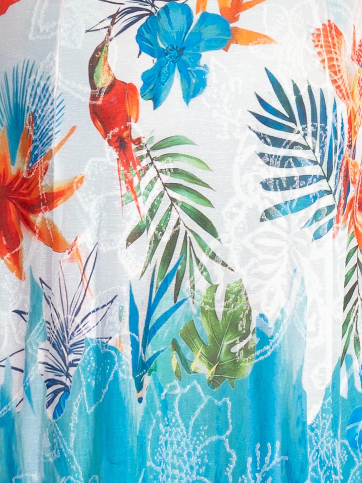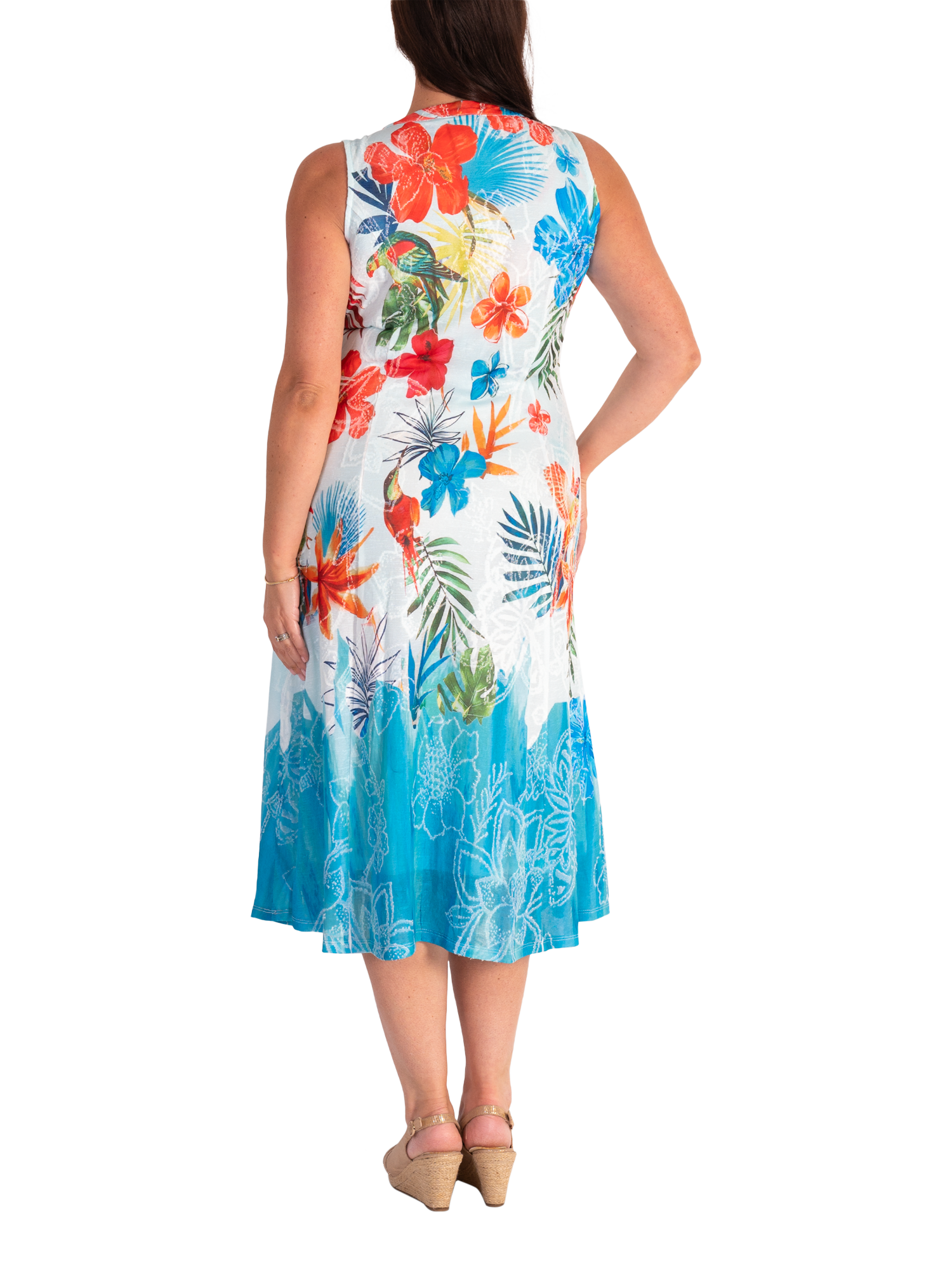 Set in a simple, A-line shape, this midi dress is crafted from a comfortable and breathable fabric for ease of wear. Featuring a round neckline with modern cut-out detailing on the neckline, this sleeveless style is offered in an eye-catching exotic floral and parrot jacquard print.