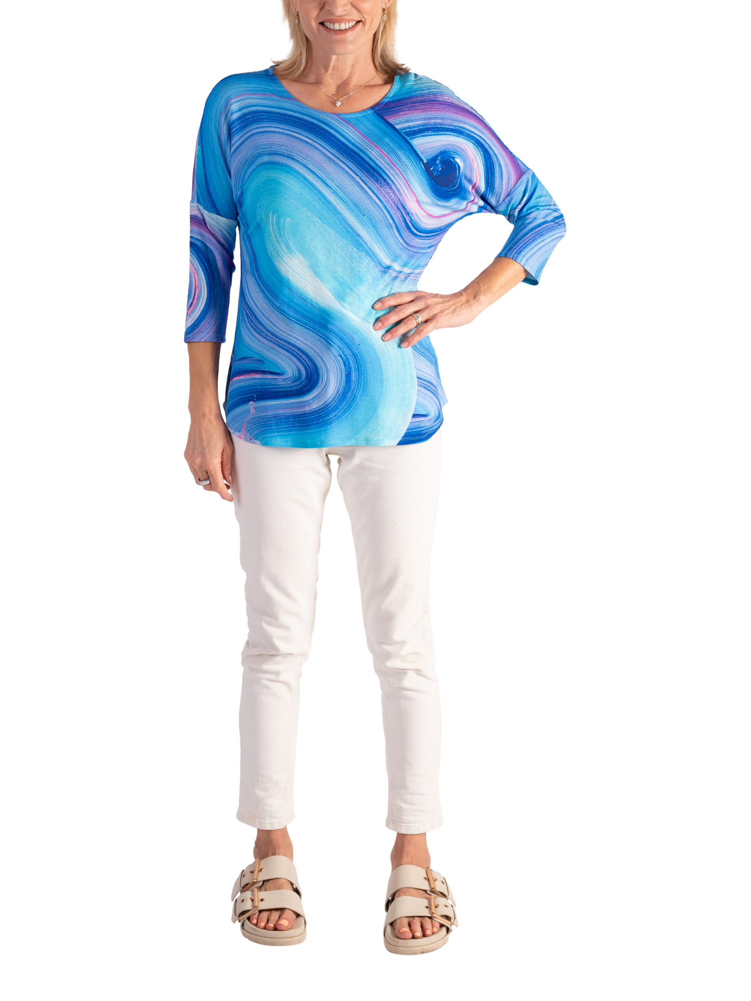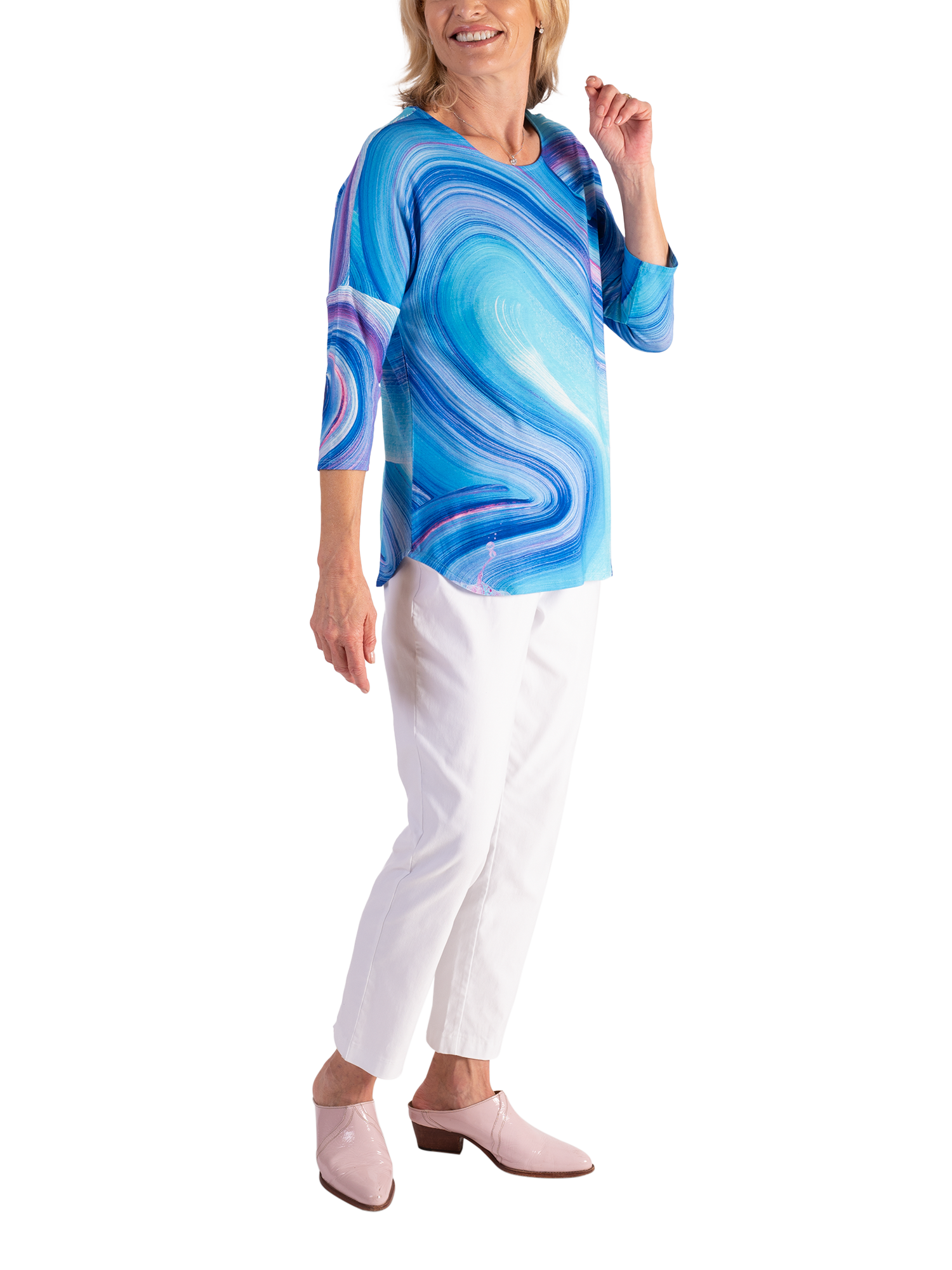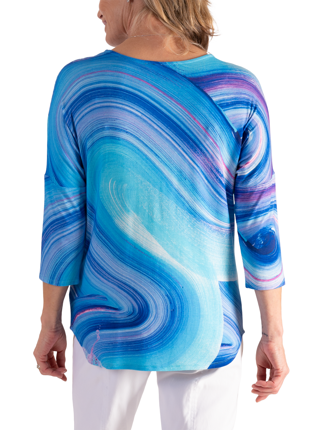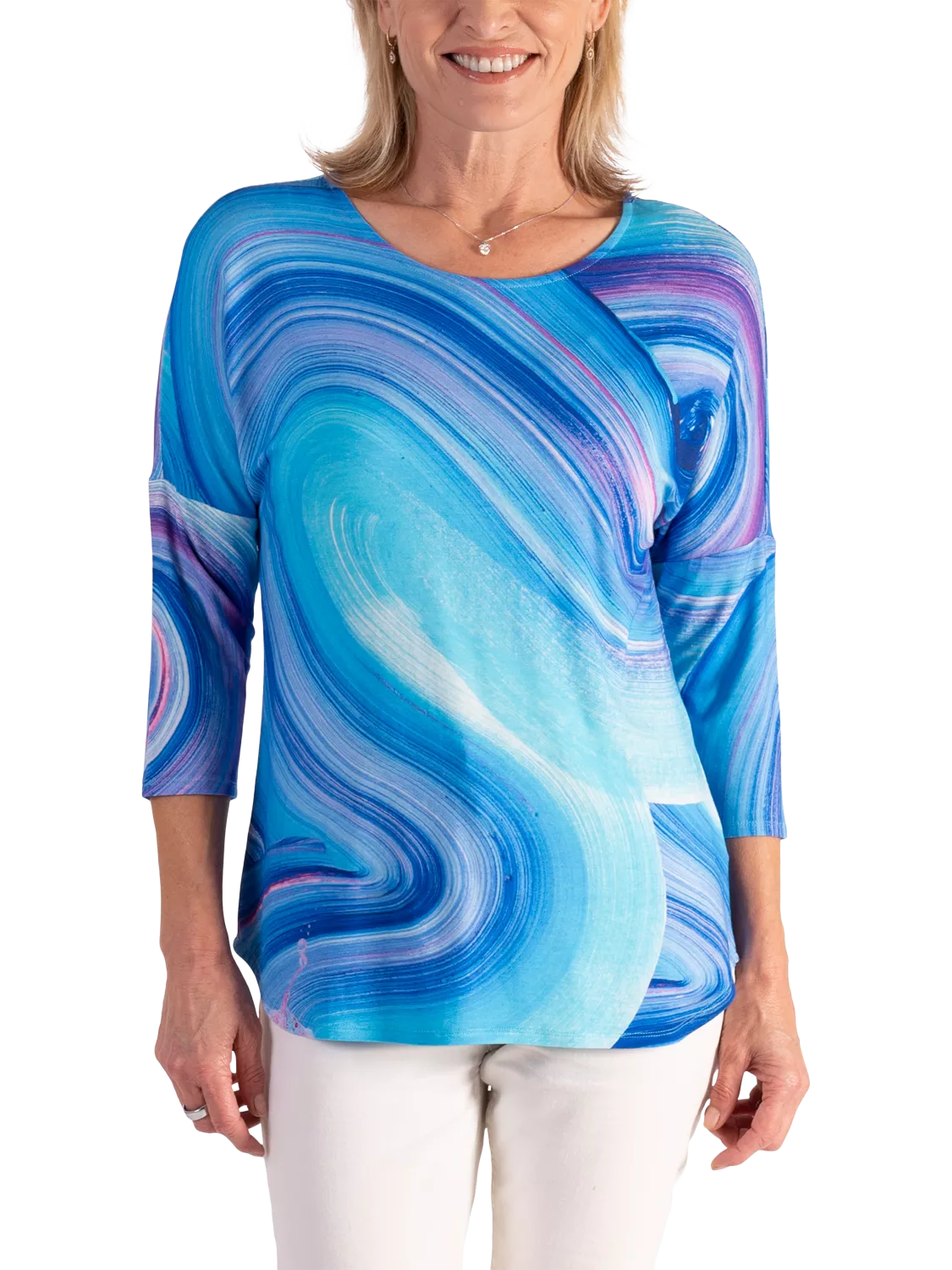 An all-year essential, this jersey top makes an impact with its sweeping artistic wave print. Cut with a boat neckline, curved hem and three-quarter length dropped sleeves for a relaxed look, it is made from a light yet durable fabric and will make everyday dressing effortless.