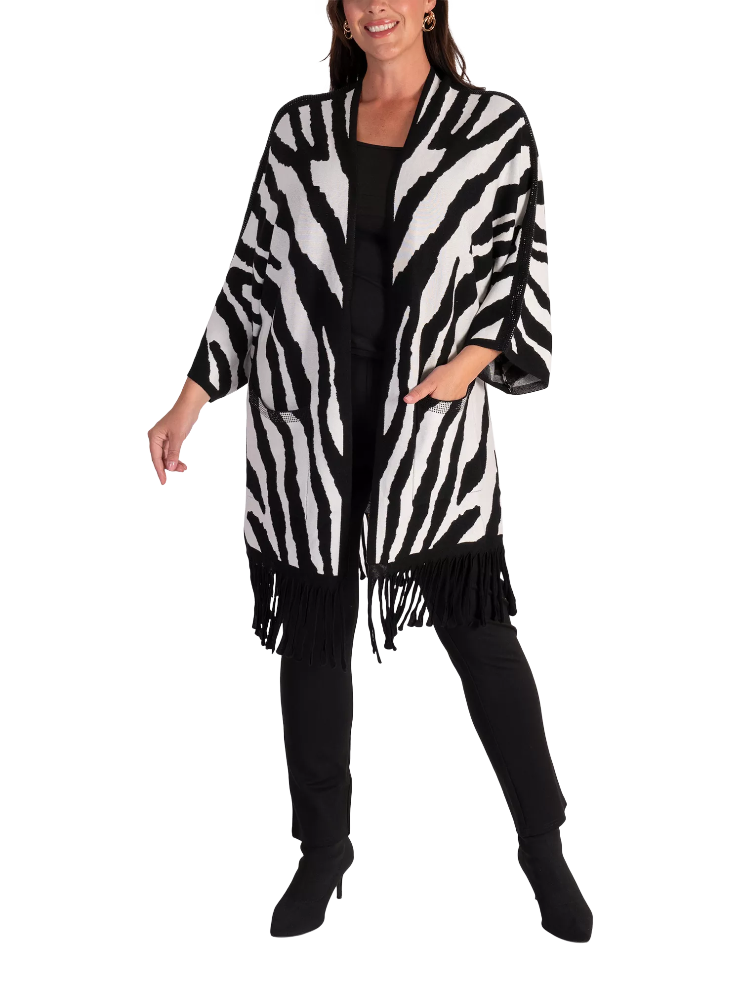 A handy piece for when the temperature cools, this longline kimono-style cardigan is adorned with an allover zebra pattern and finished with a tasselled trim. Finished with rows of diamanté detailing on the batwing sleeves and patch pockets for added sparkle, this relaxed fit knitted cardigan is easy to layer with its open neckline and is made from long-lasting fabric that will see you through season after season.