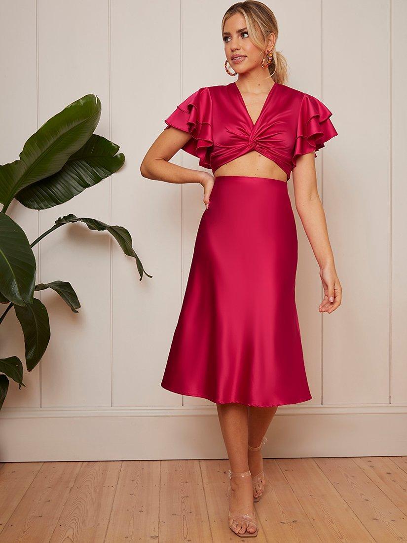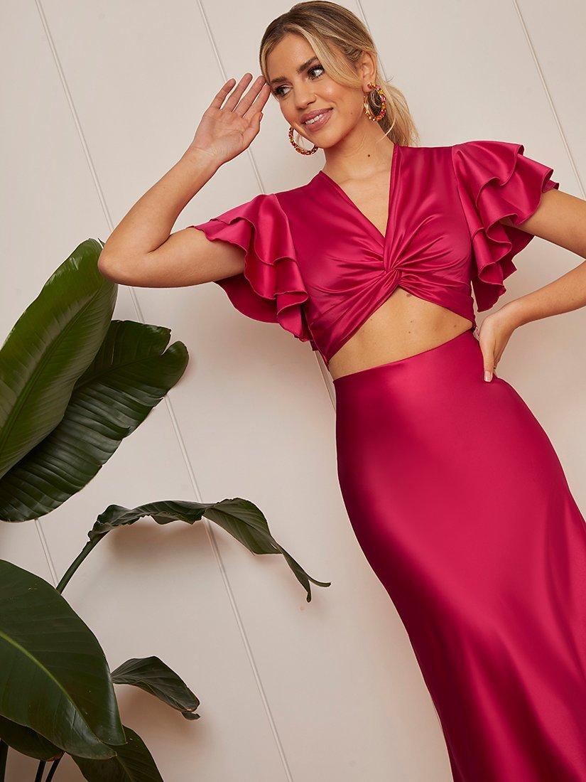 Chi Chi LondonFrill Sleeve Satin Twist Crop Top, Pink