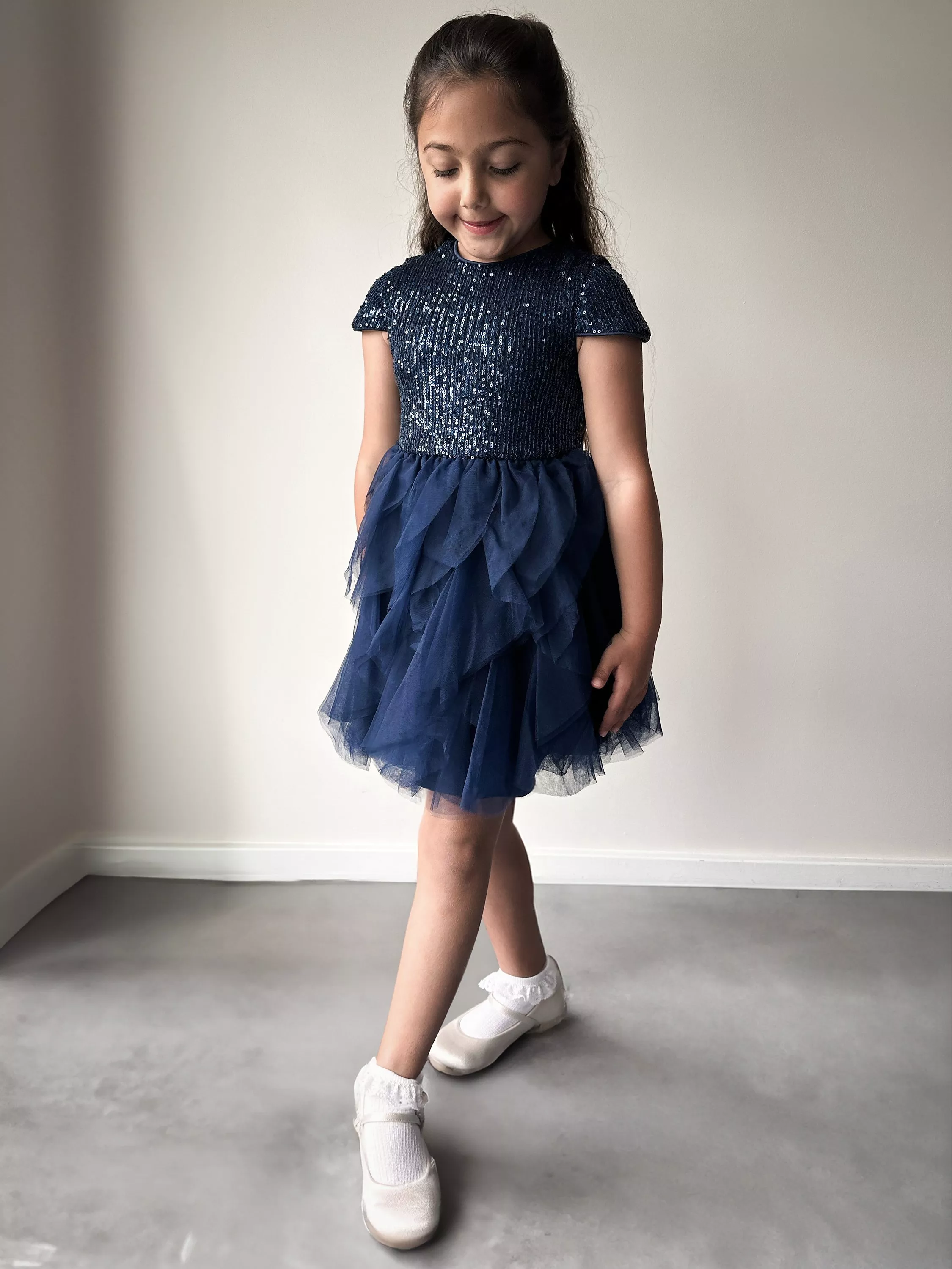 Perfect for parties and special occasions, this knee-length dress has a sparkly sequin top and ruffled tulle skirt. They'll be ready to hit the dance floor with their best disco moves.