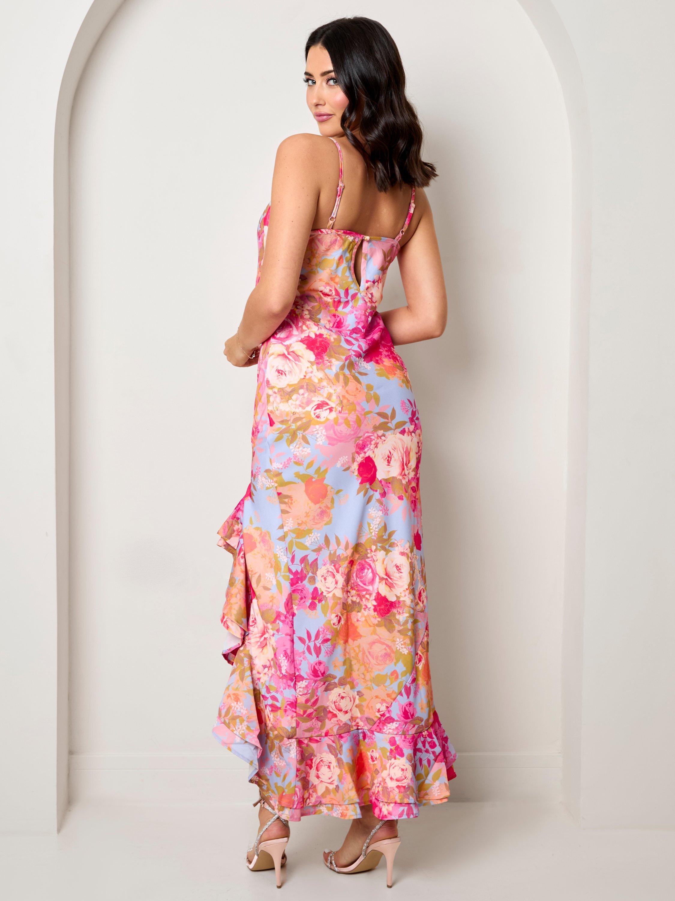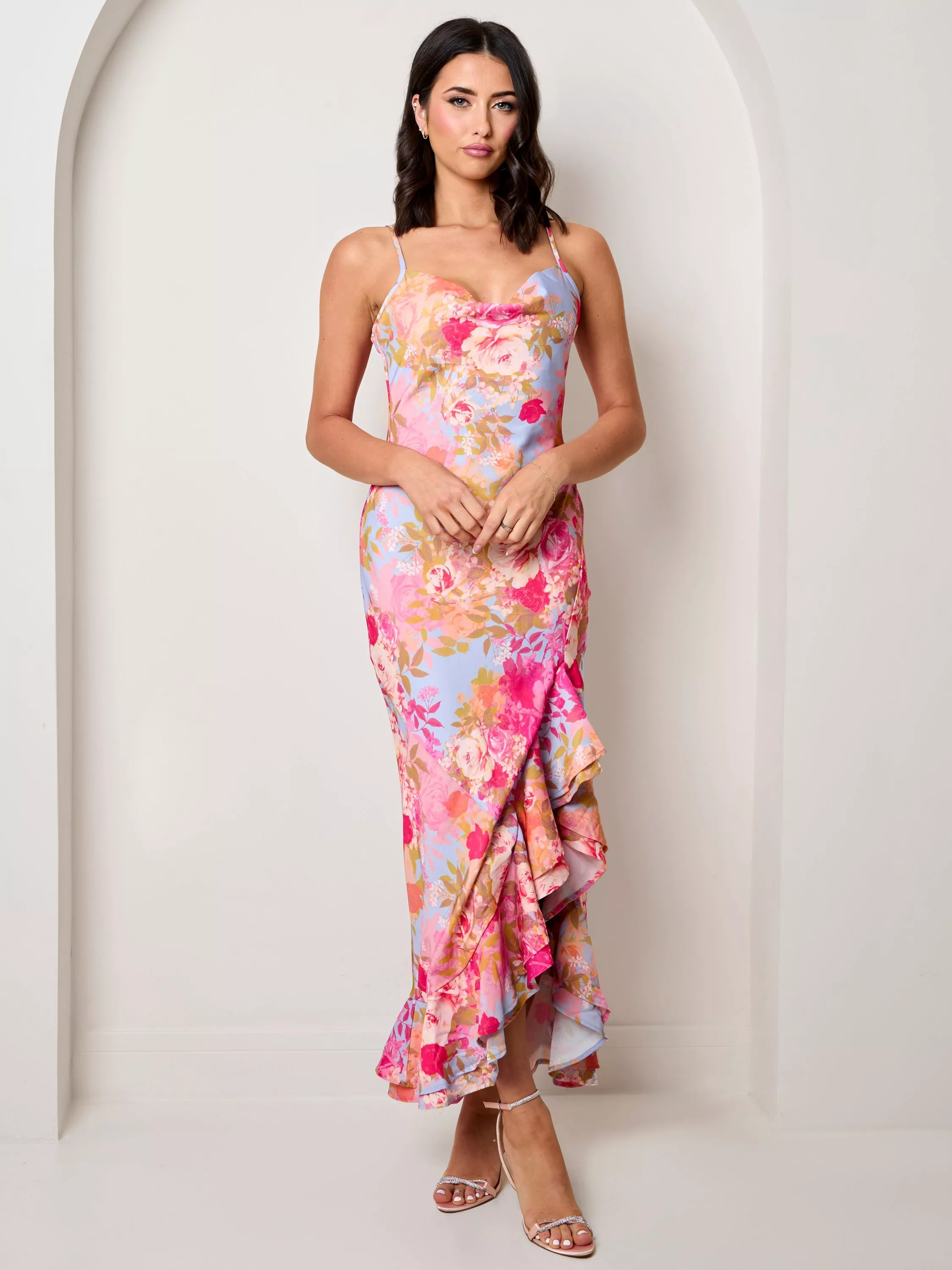 Highlighting the curves and contours of your silhouette, this maxi dress from Chi Chi London features a cowl neckline, a waterfall high low hem and an all-over floral print. Complete with espadrille sandals.