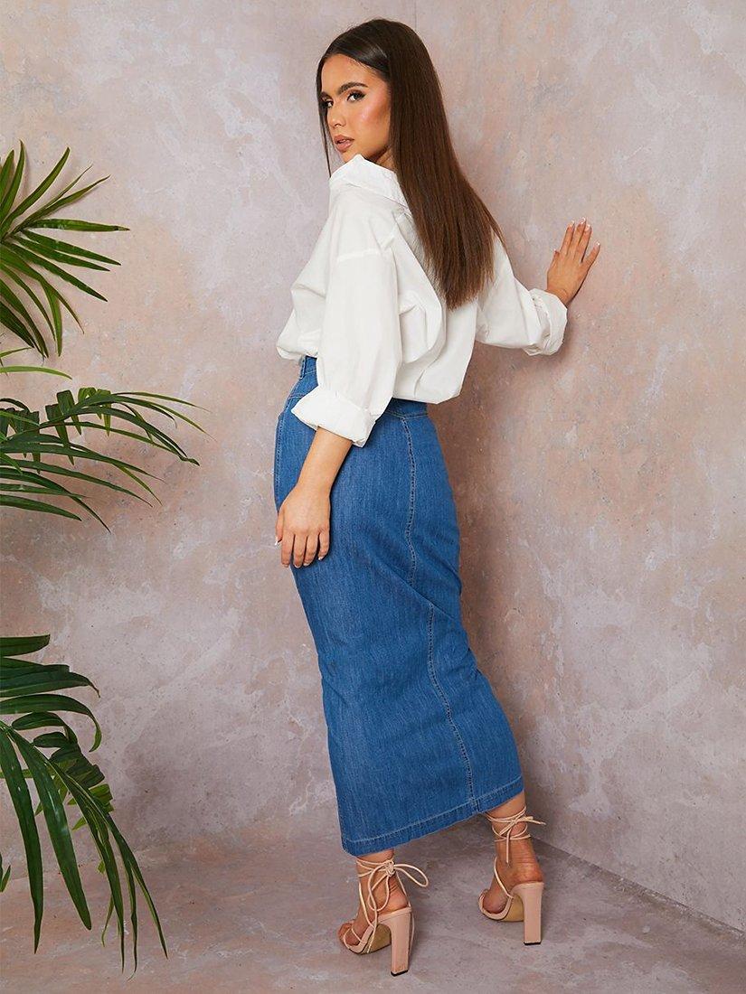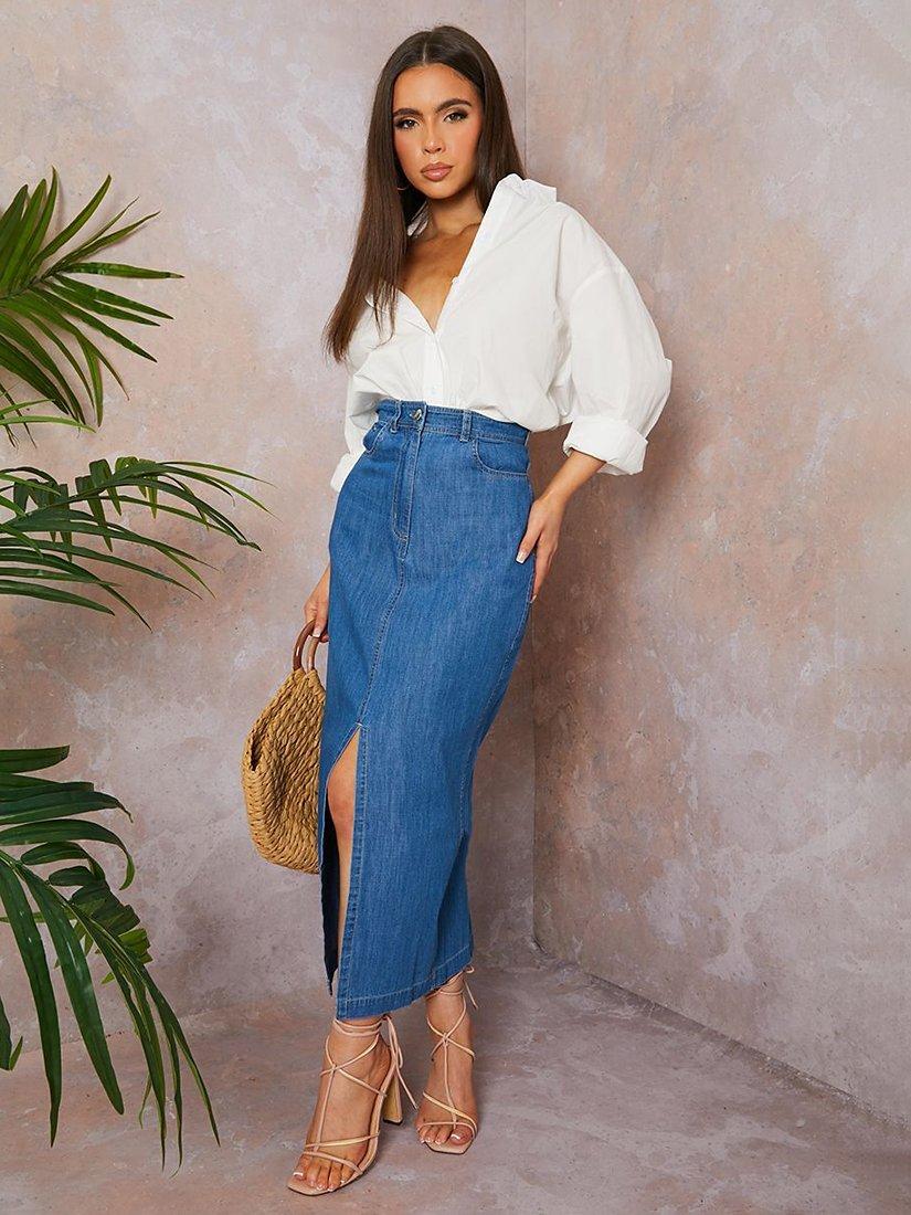 Chi Chi LondonSplit Hem Denim Maxi Skirt, Blue
