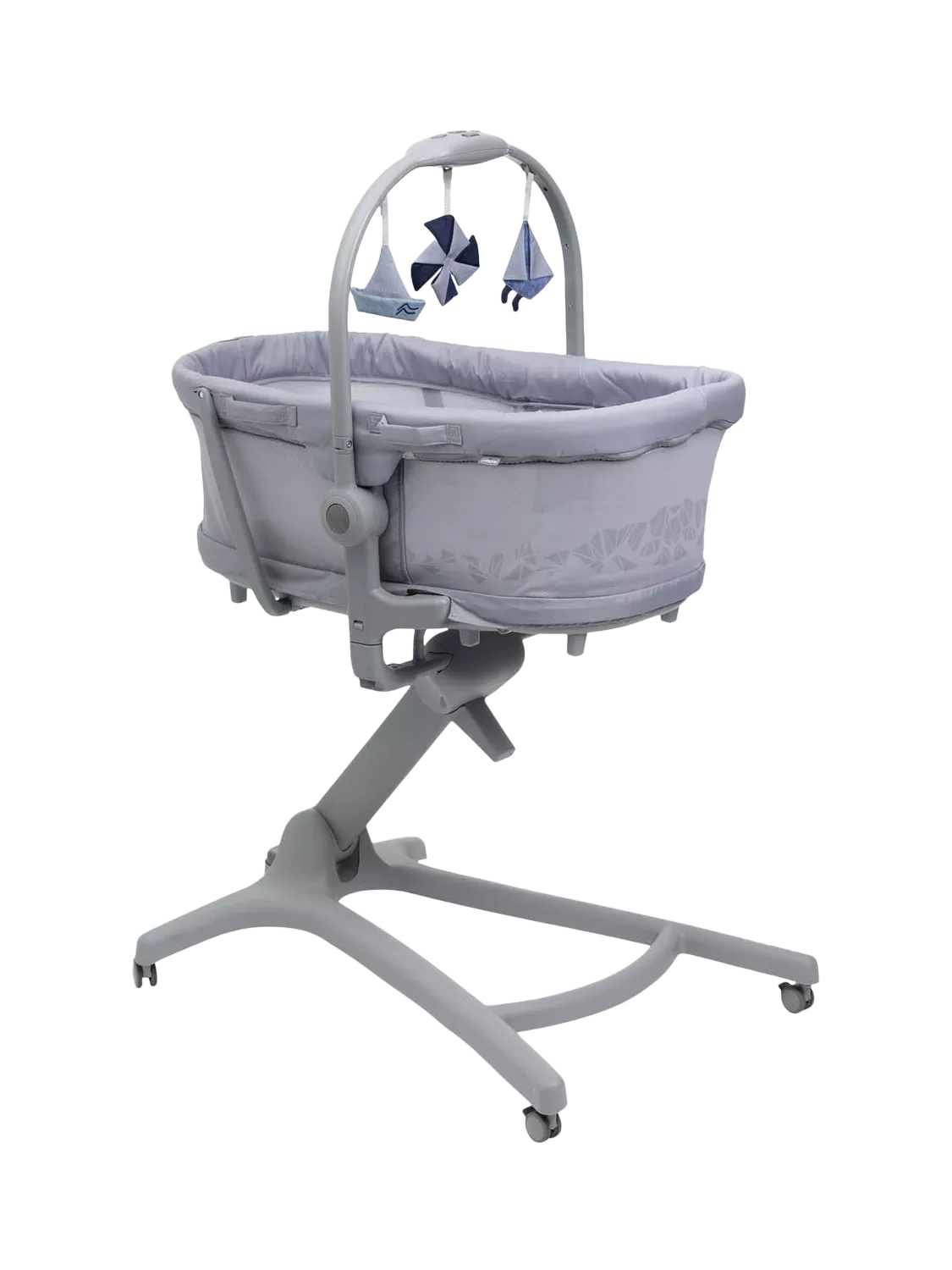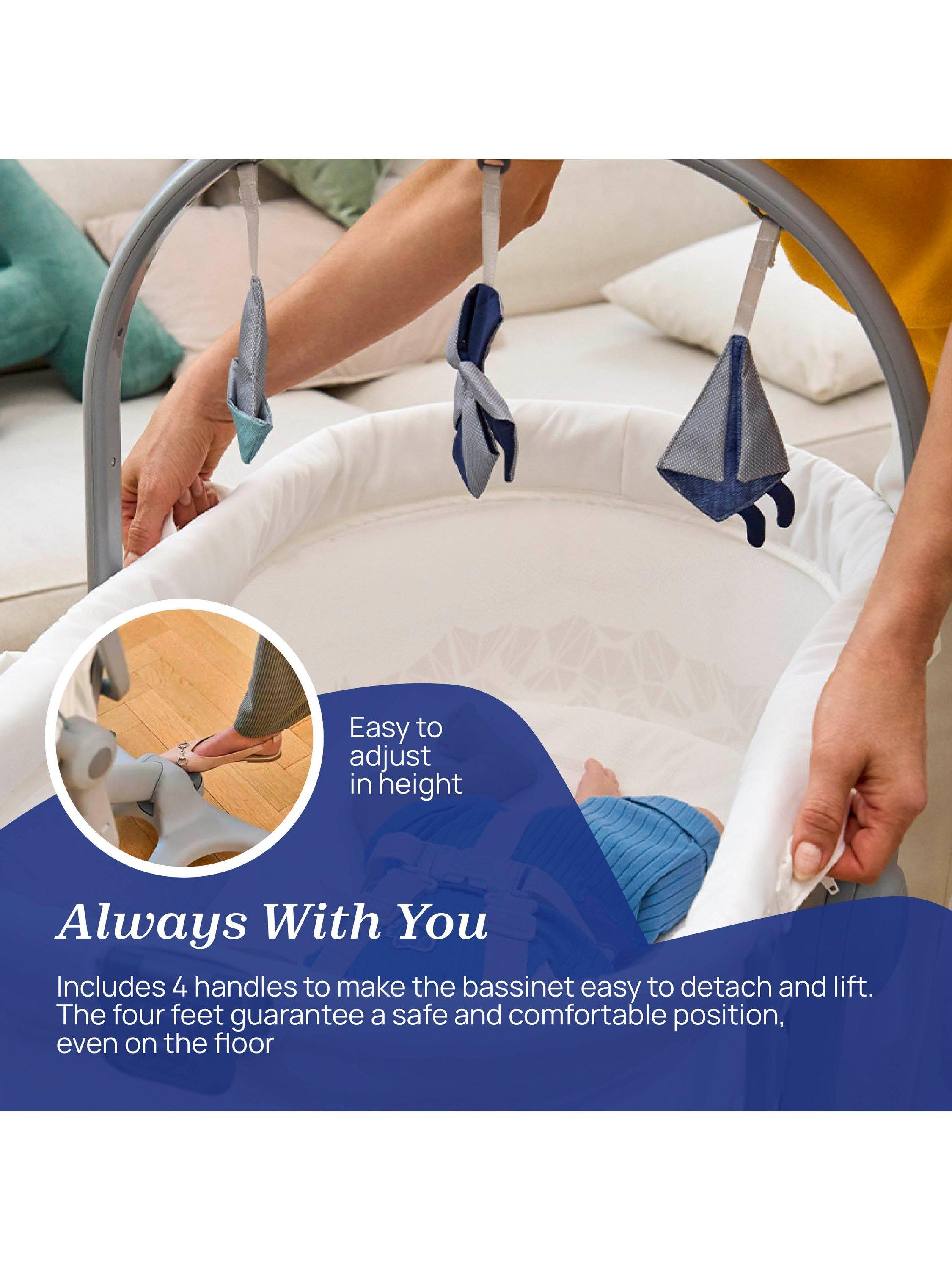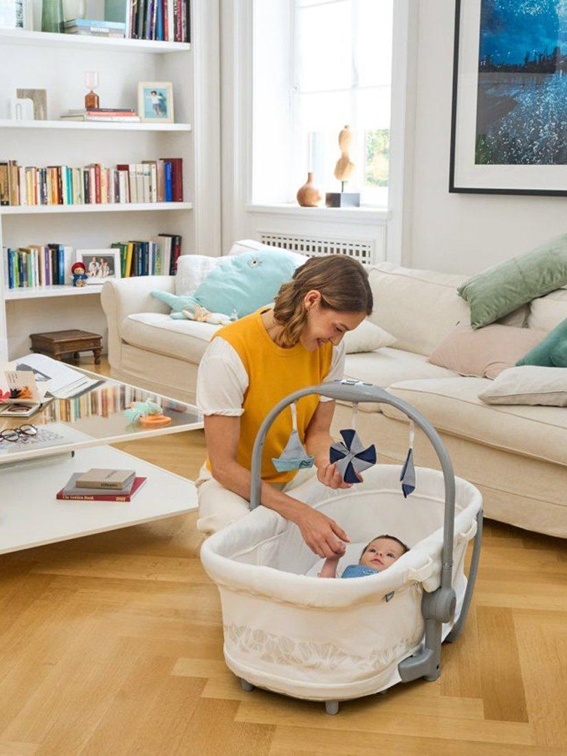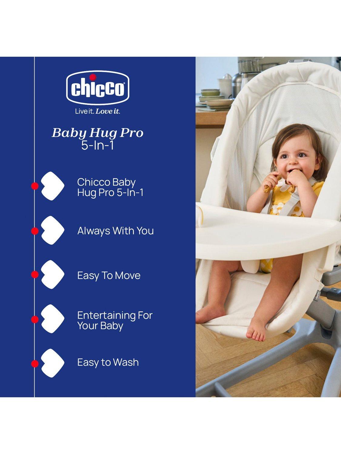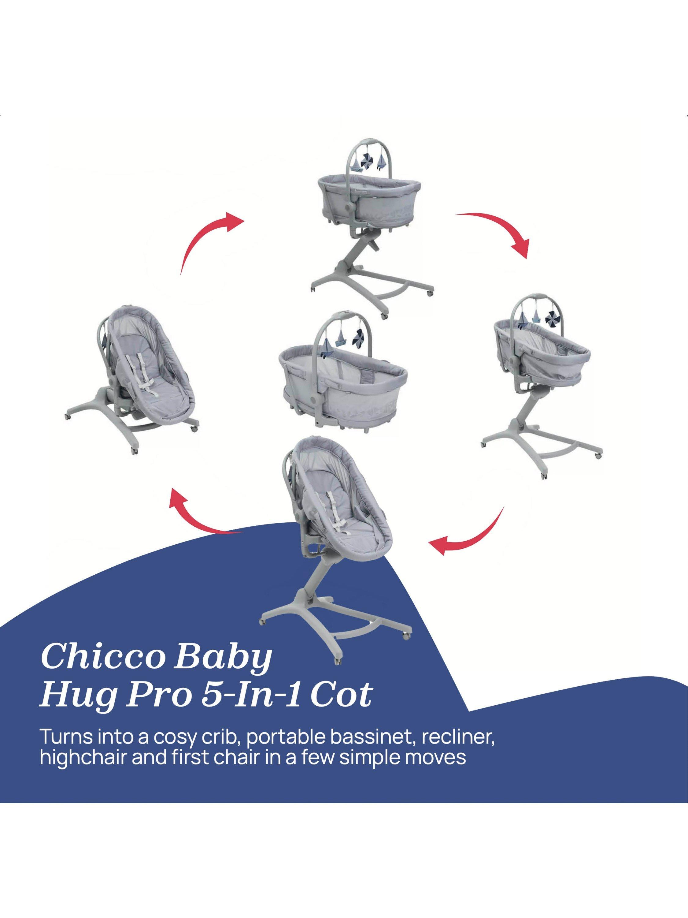 Simplifying life as a parent and cutting down the purchases before baby arrives, the Chicco Baby Hug Pro transforms from independent crib to self-standing bassinet, to raised bouncer, to high chair and to first chair. It helps you manage your baby from 0 to 36 months, all within the space of only one square metre.