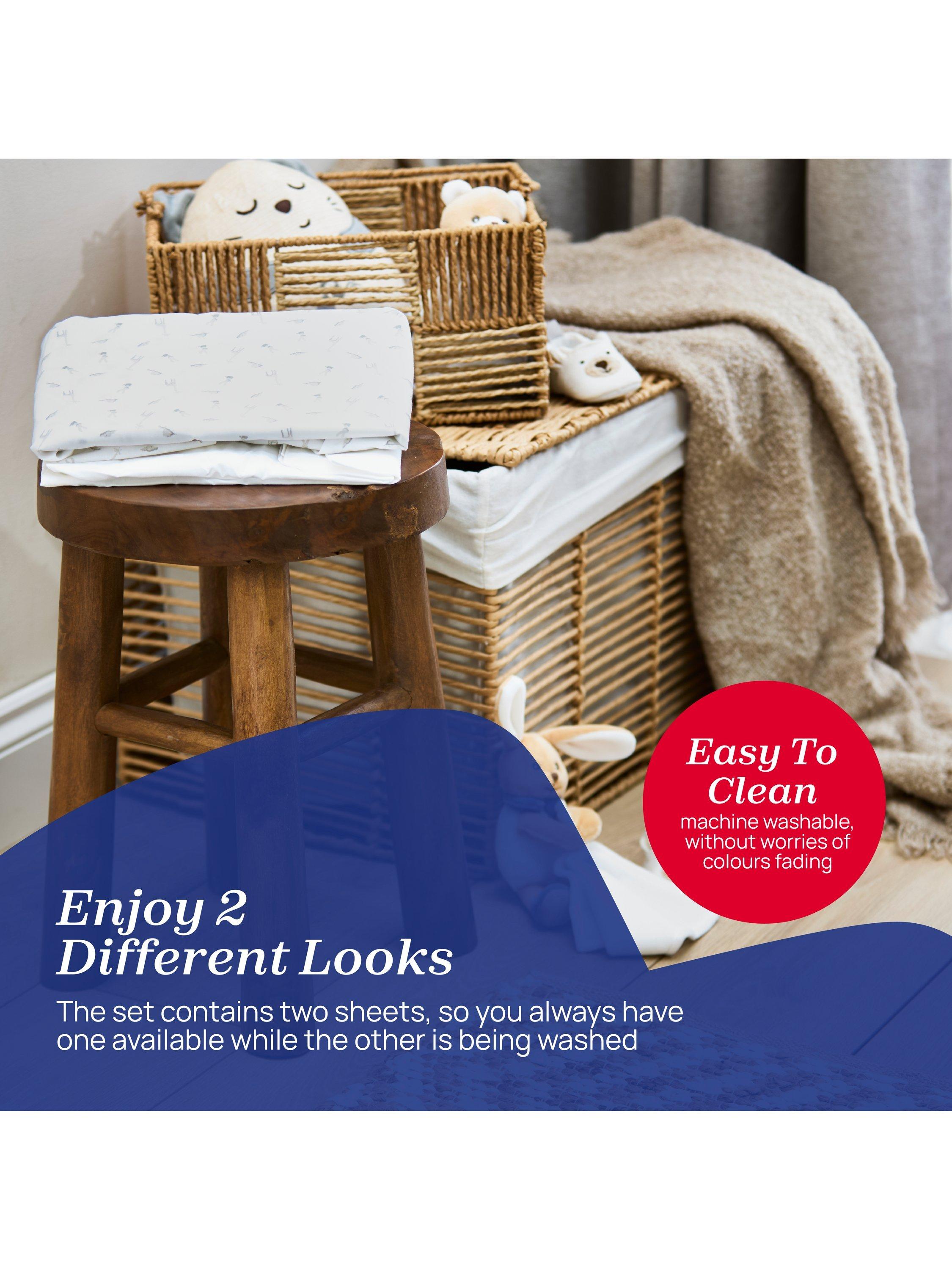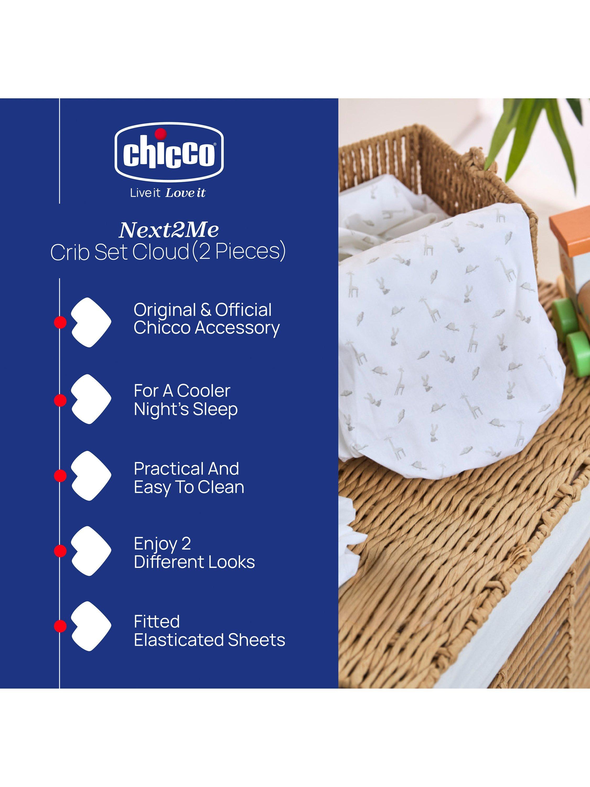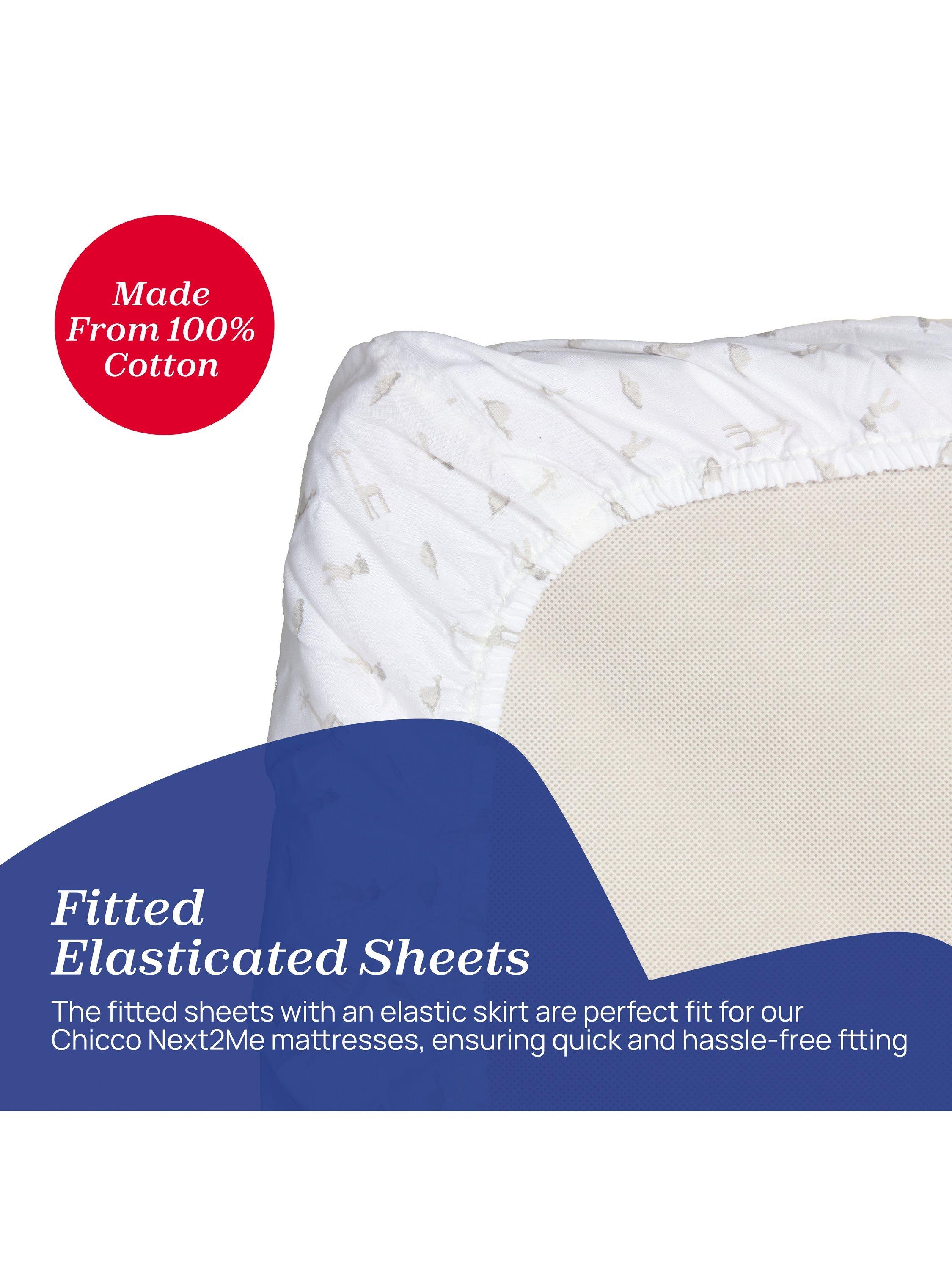 These Chicco Next2Me fitted sheets are the only original and official ones from Chicco that fit all the Next2Me models (except for Next2Me Forever). They're made from 100% cotton, which offers the unique ability to aid temperature regulation, helping keep your little one’s sleep surface cool and hygienic. Machine washable at 30°C without worries of colours fading, suitable for ironing and sold as a pack of 2.