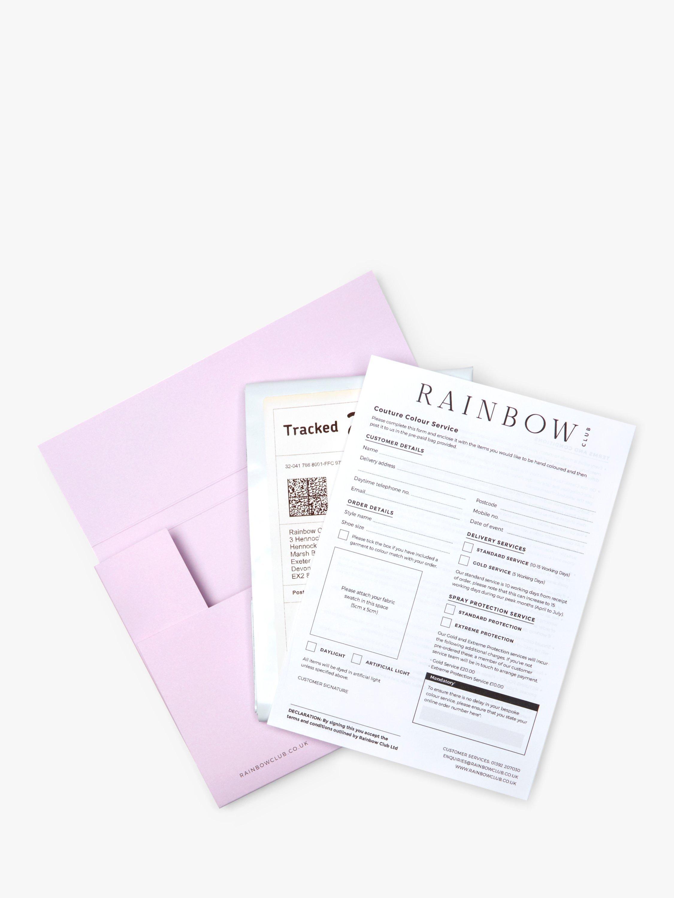 Step 3 Once you have received your shoes and colour pack, try your shoes on to ensure they are the perfect fit. Complete the order form and attach your fabric swatch and send back to Rainbow Club in the pre-paid bag provided. Once they have received your order, their colour studio will work their magic and will mix, match and colour your shoes and accessories and send them back to you.