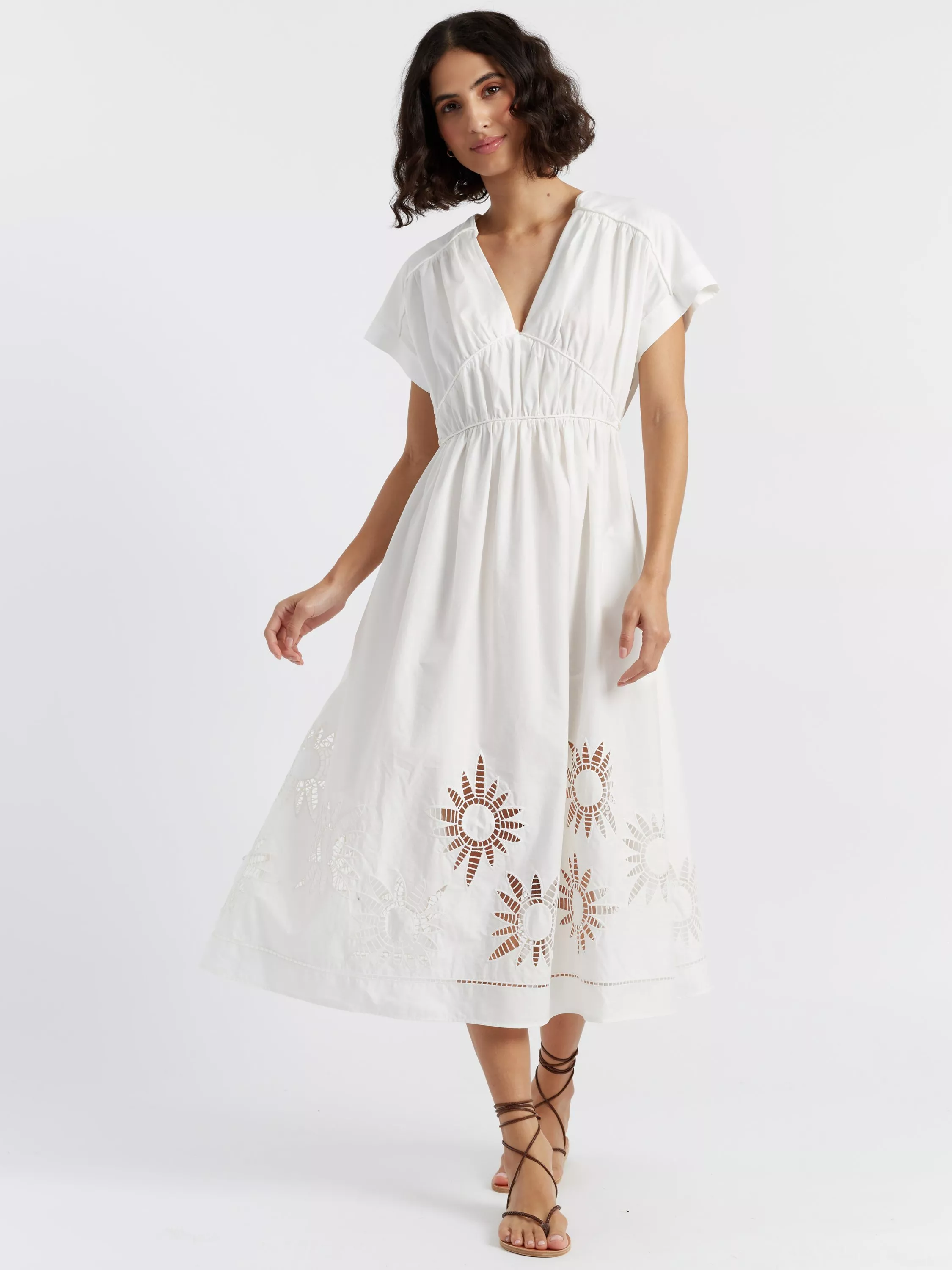 This Broderie dress, crafted from 100% pure cotton offers timeless elegance and comfort. Featuring a flattering V-shaped neckline and an elasticated waist, it creates a graceful silhouette that accentuates the natural shape while providing ease of movement. The delicate Broderie detailing adds a touch of texture, elevating the dress to a sophisticated level. charm and effortless style.