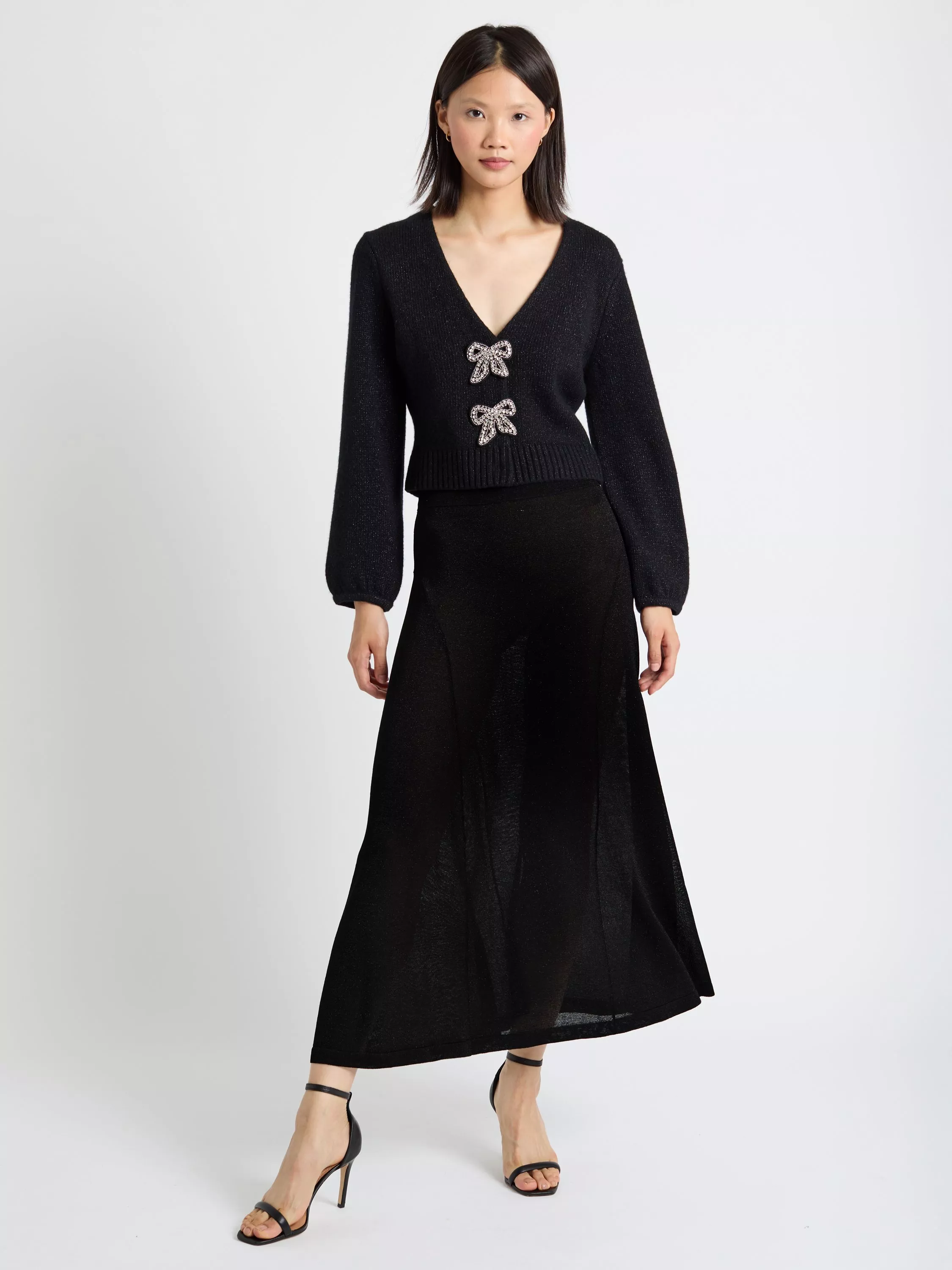 Feminine, festive, and full of charm — this cropped cardigan is the ultimate party knit. It is made from a soft merino and cashmere blend, and finished with sparkling crystal bow closures for an elegant statement that catches the light beautifully.