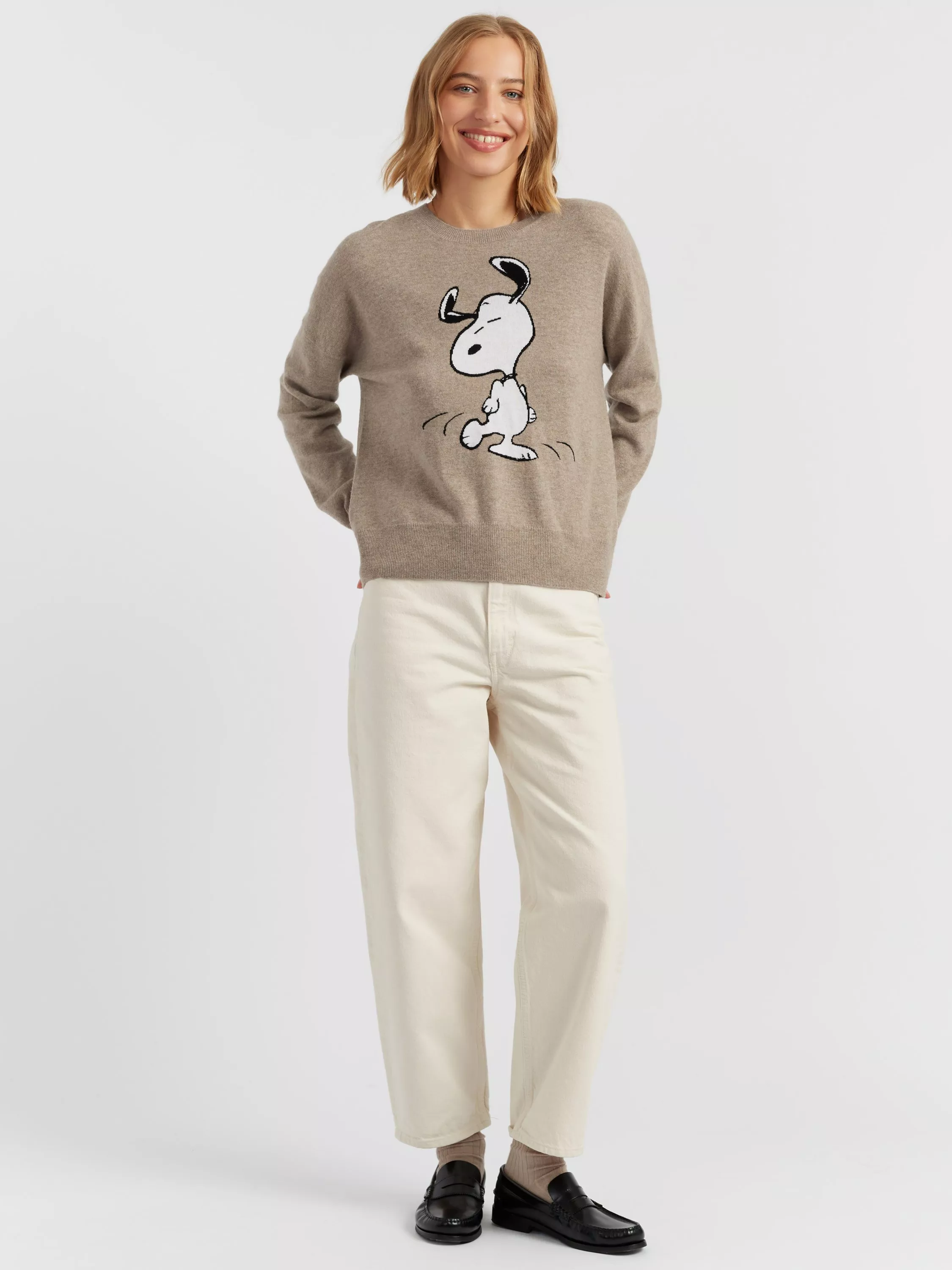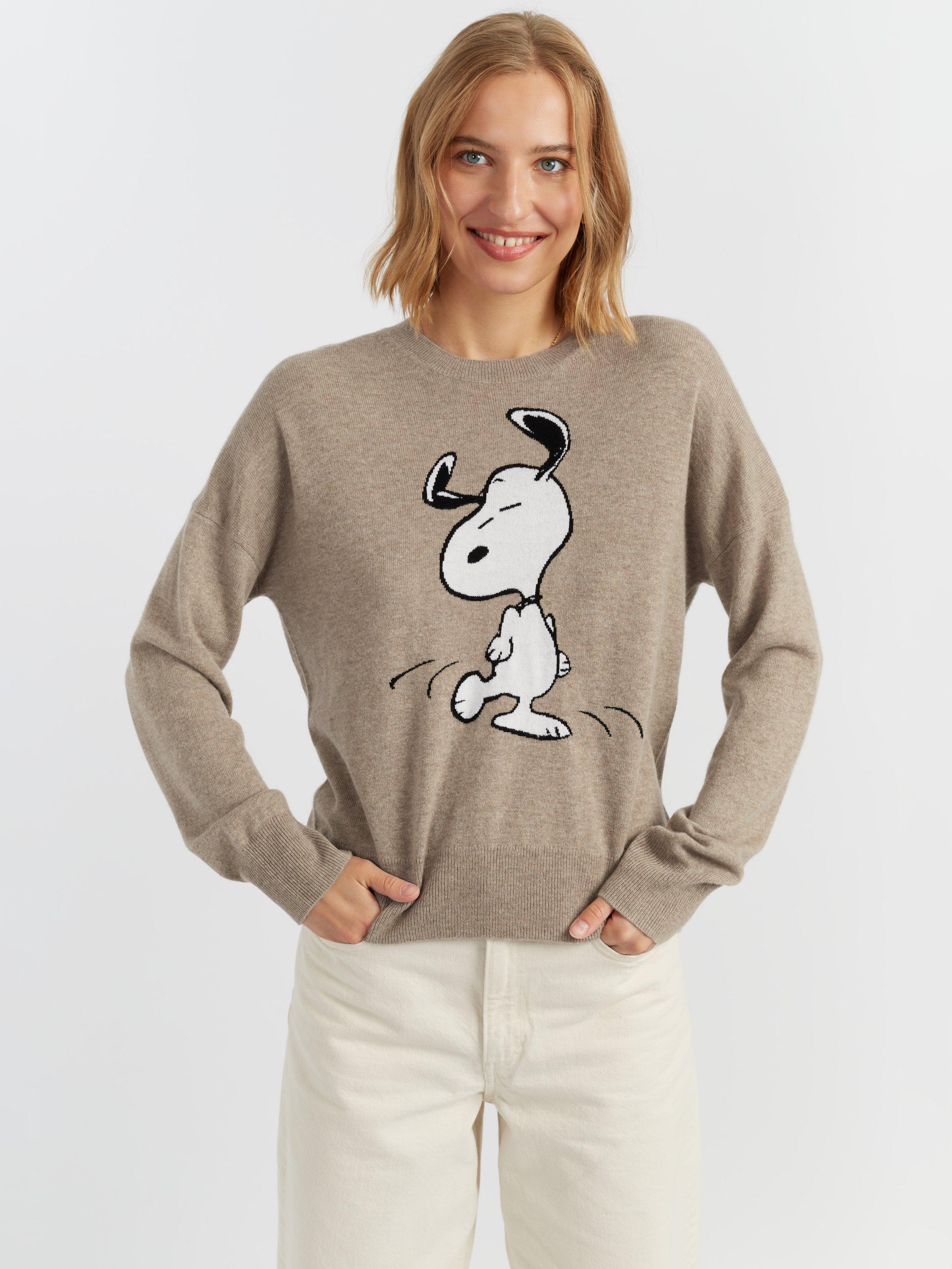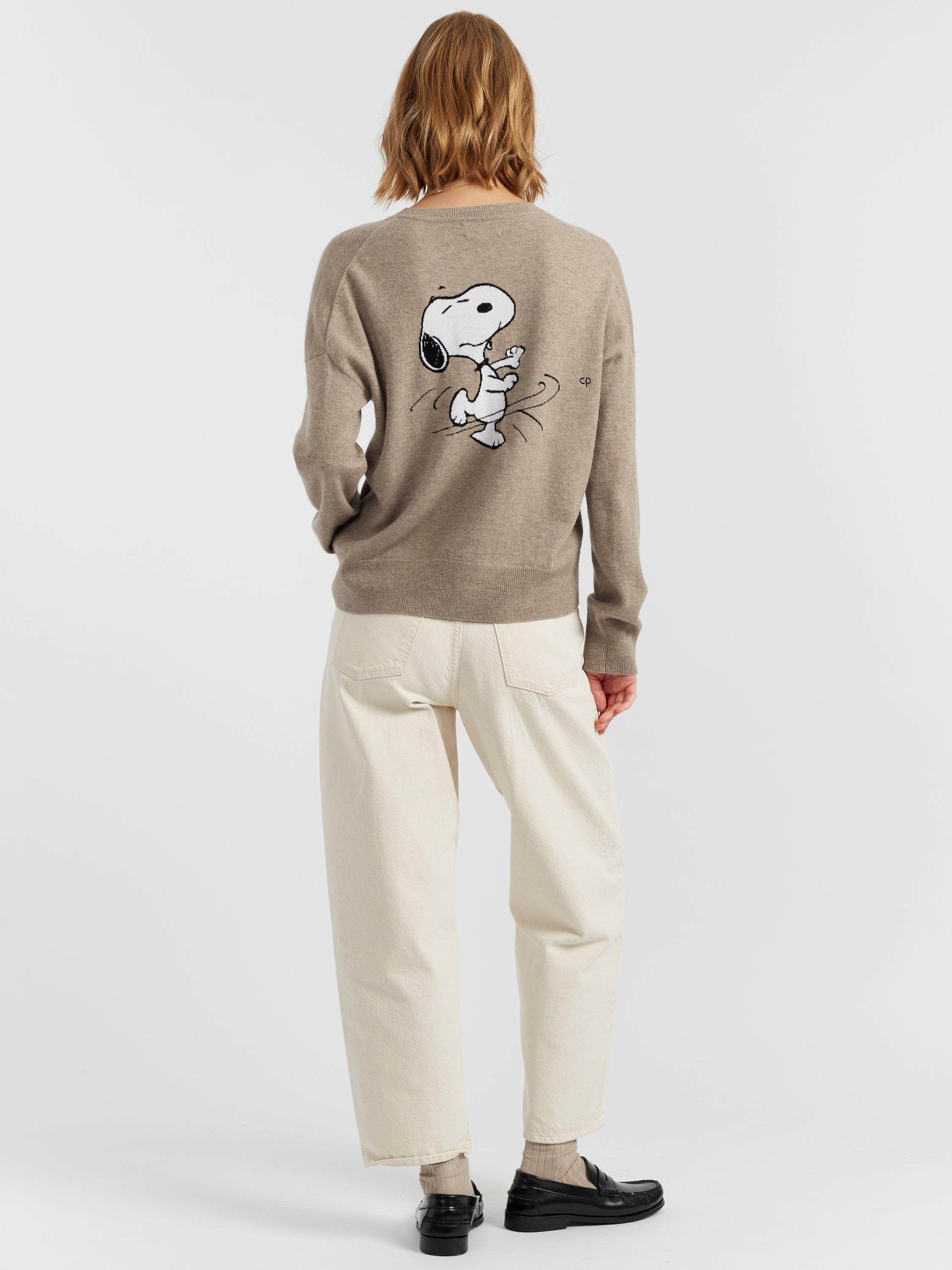 A joyful twist on winter knitwear, this crew neck sweater celebrates everyone's favourite beagle in motion. Crafted from a luxurious wool and cashmere blend, it features an oversized dancing Snoopy motif front and centre — playful, bold, and irresistibly soft.