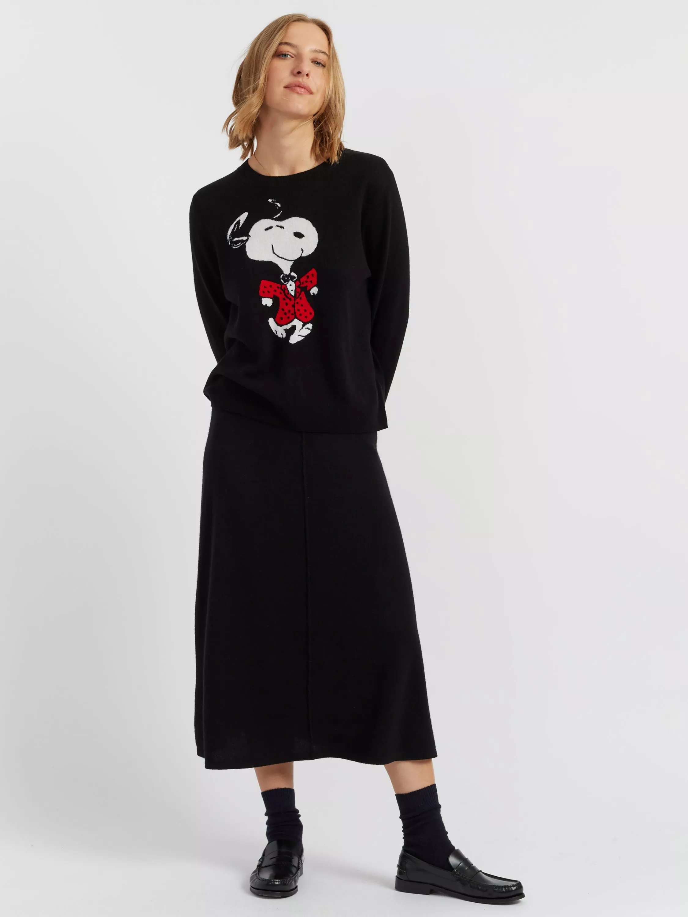 A joyful twist on winter knitwear, this crew neck sweater celebrates everyone's favourite beagle in motion. Crafted from a luxurious wool and cashmere blend, it features an oversized dancing Snoopy motif front and centre — playful, bold, and irresistibly soft.