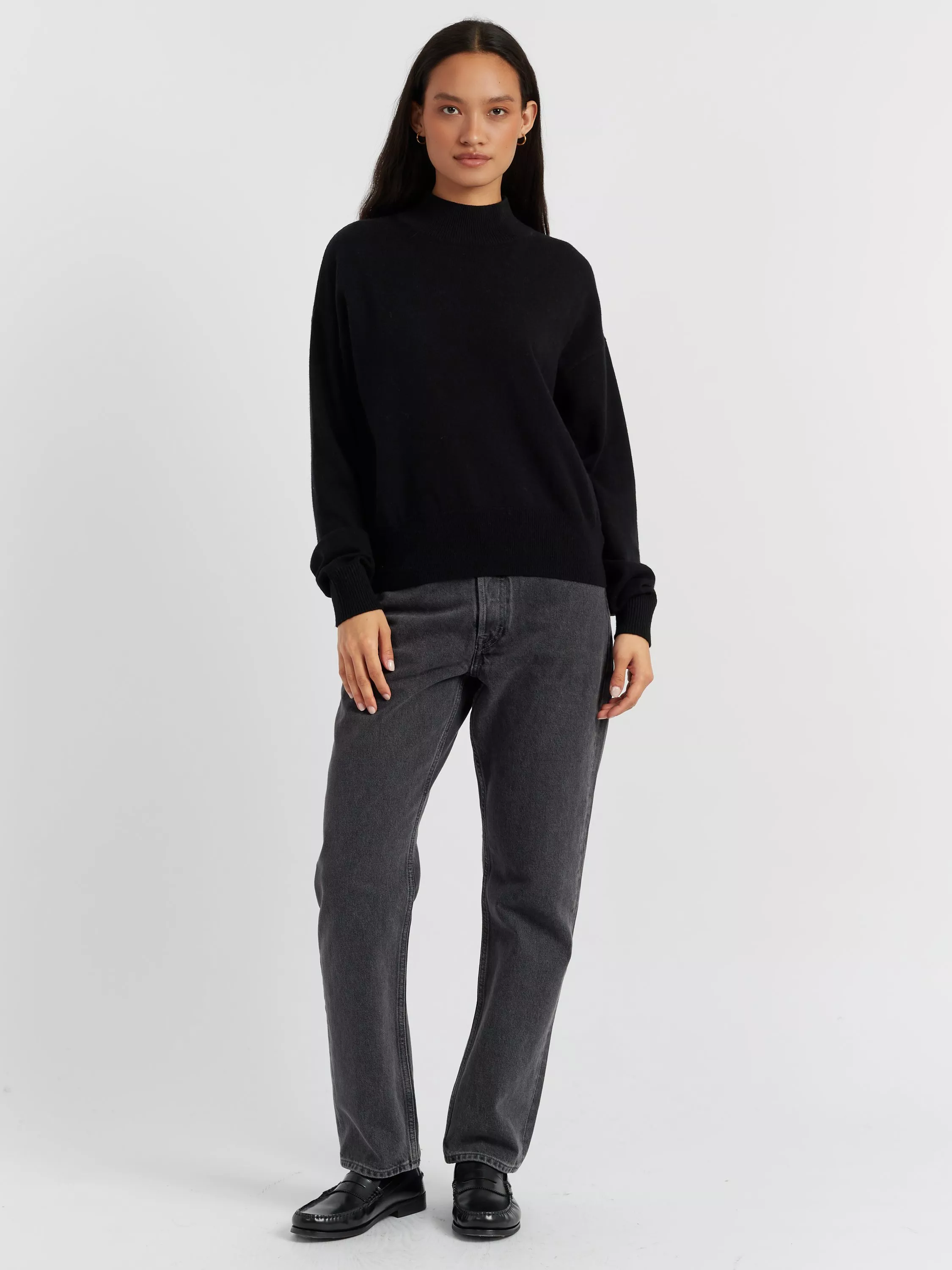 This funnel neck sweater is crafted from a luxurious blend of wool and cashmere with a soft drape and a slightly wider fit. A raglan sleeve gives design detail to this piece, making it a versatile addition to your Autumn/Winter wardrobe.