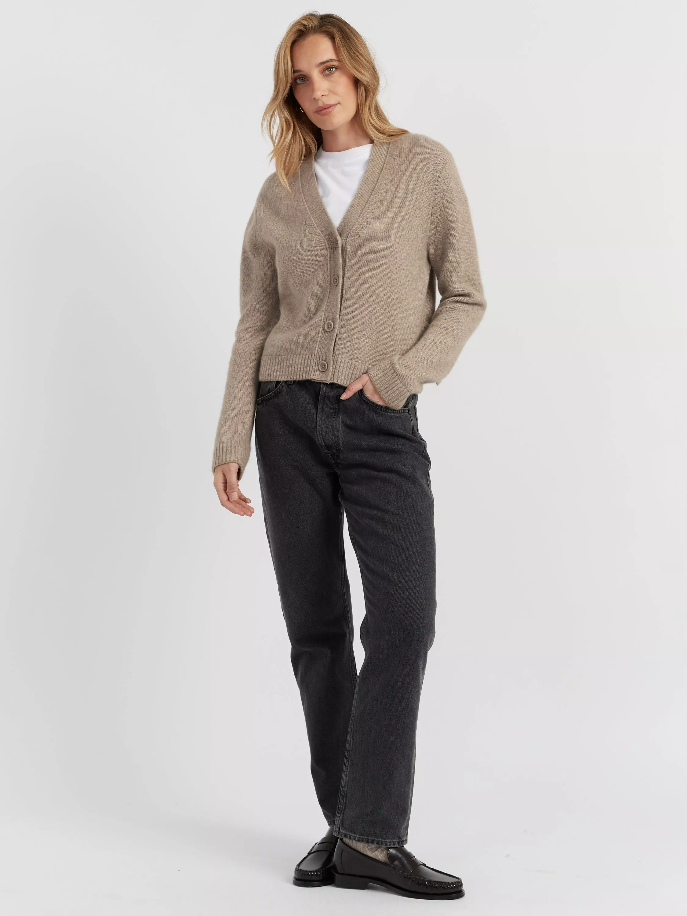 A timeless cashmere cardigan with a softly structured silhouette. Designed with a deep V neckline, dropped shoulders, and refined ribbed trims, it drapes effortlessly for a relaxed yet polished look.