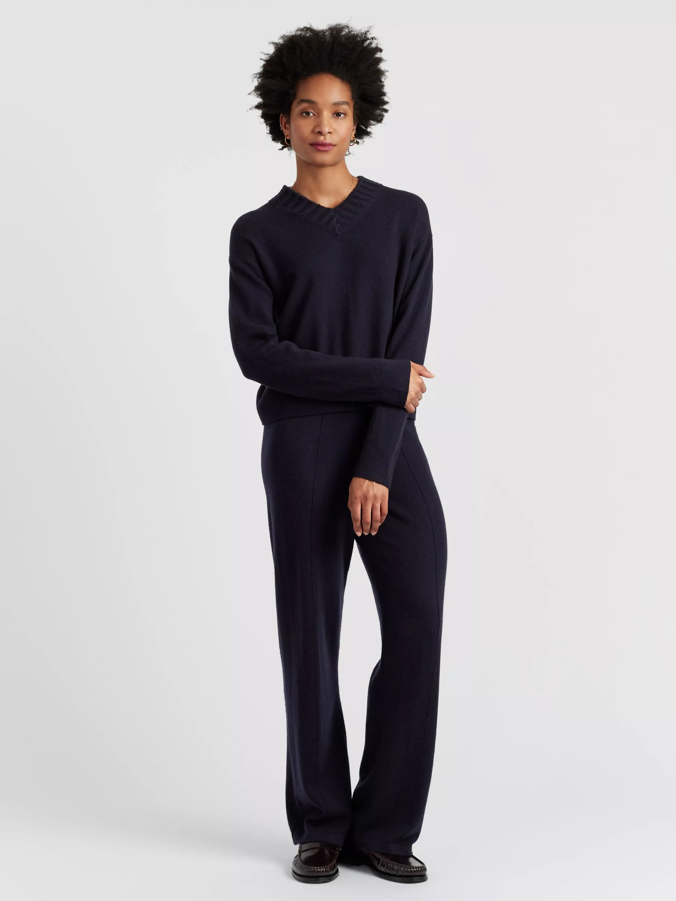 A relaxed take on a wardrobe classic, this chunky V-neck jumper is knitted from an ultra-soft wool and cashmere blend. It features a deep ribbed neckline, dropped shoulders, and a slightly boxy silhouette for an easy, flattering fit. Perfect for layering over a tee or collared shirt.