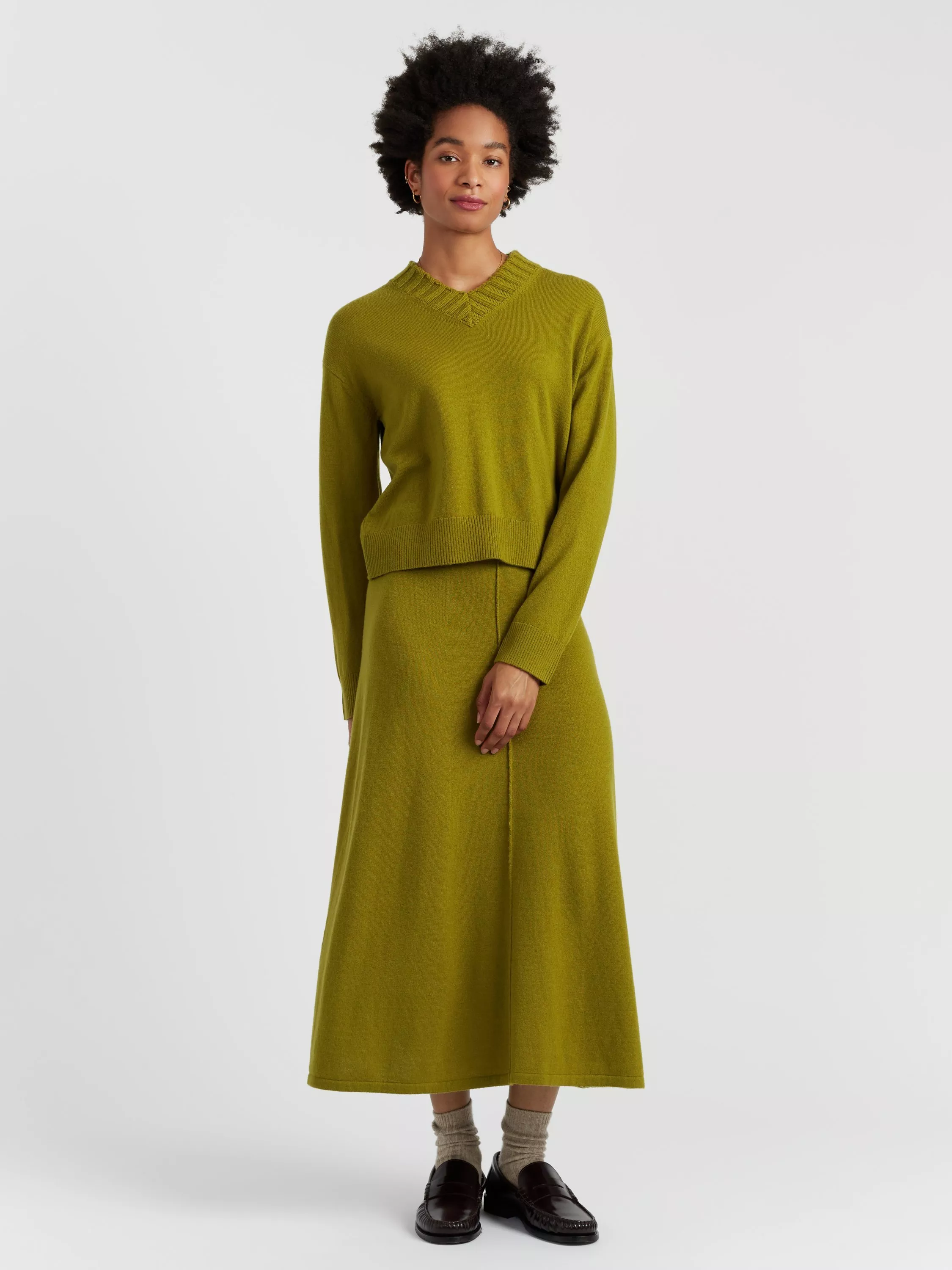 A relaxed take on a wardrobe classic, this chunky V-neck jumper is knitted from an ultra-soft wool and cashmere blend. It features a deep ribbed neckline, dropped shoulders, and a slightly boxy silhouette for an easy, flattering fit. Perfect for layering over a tee or collared shirt.