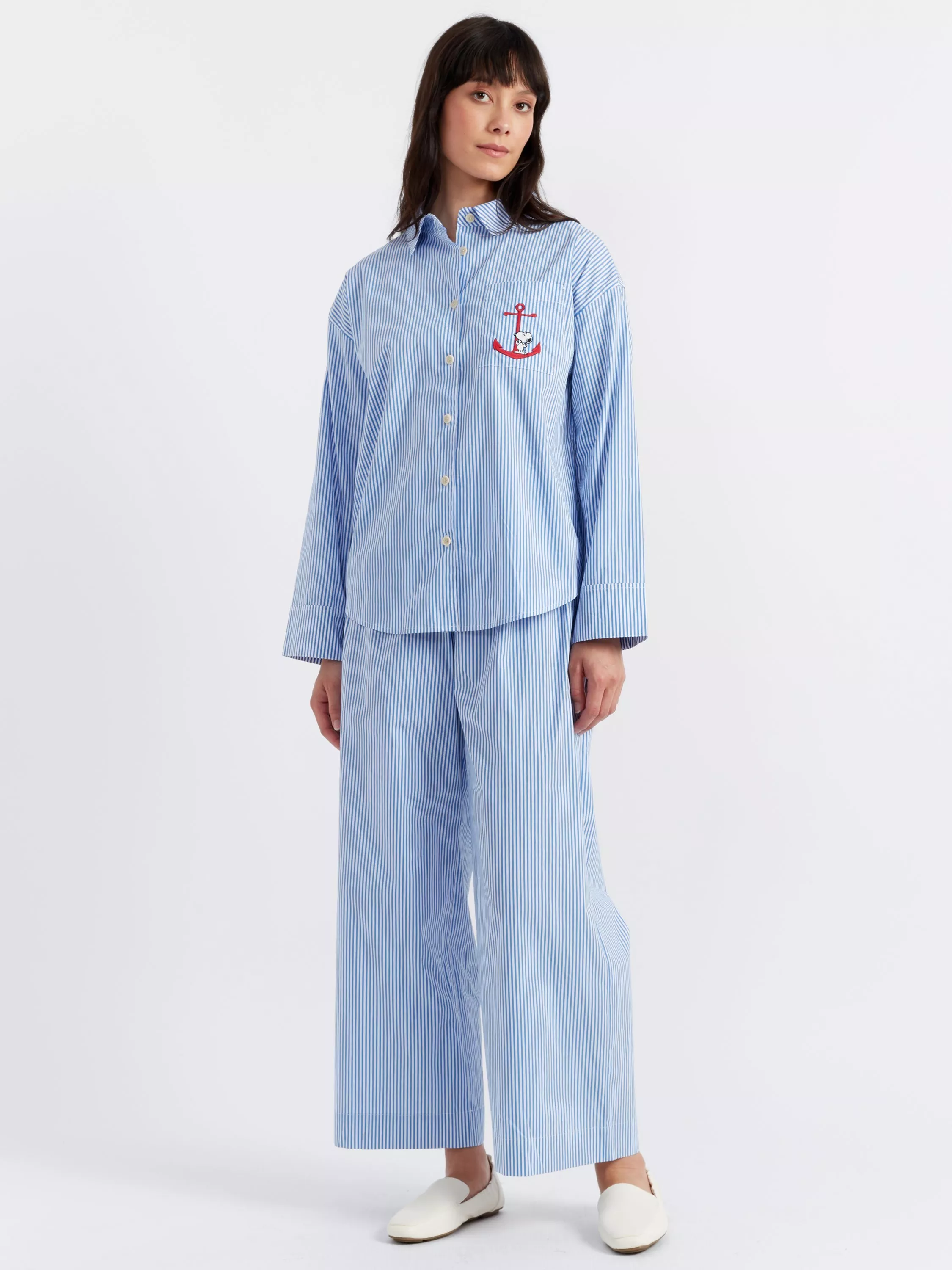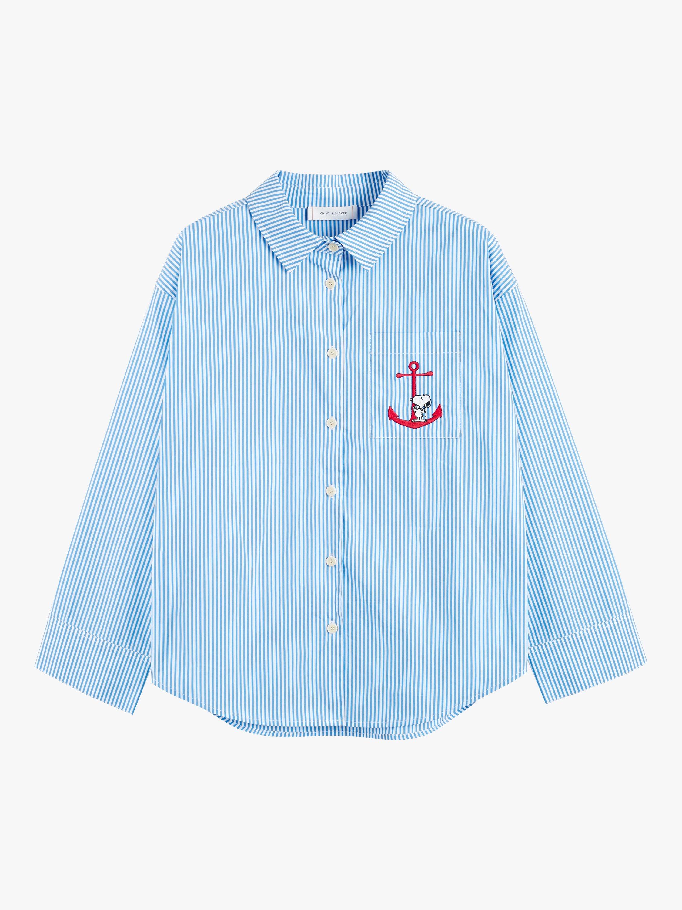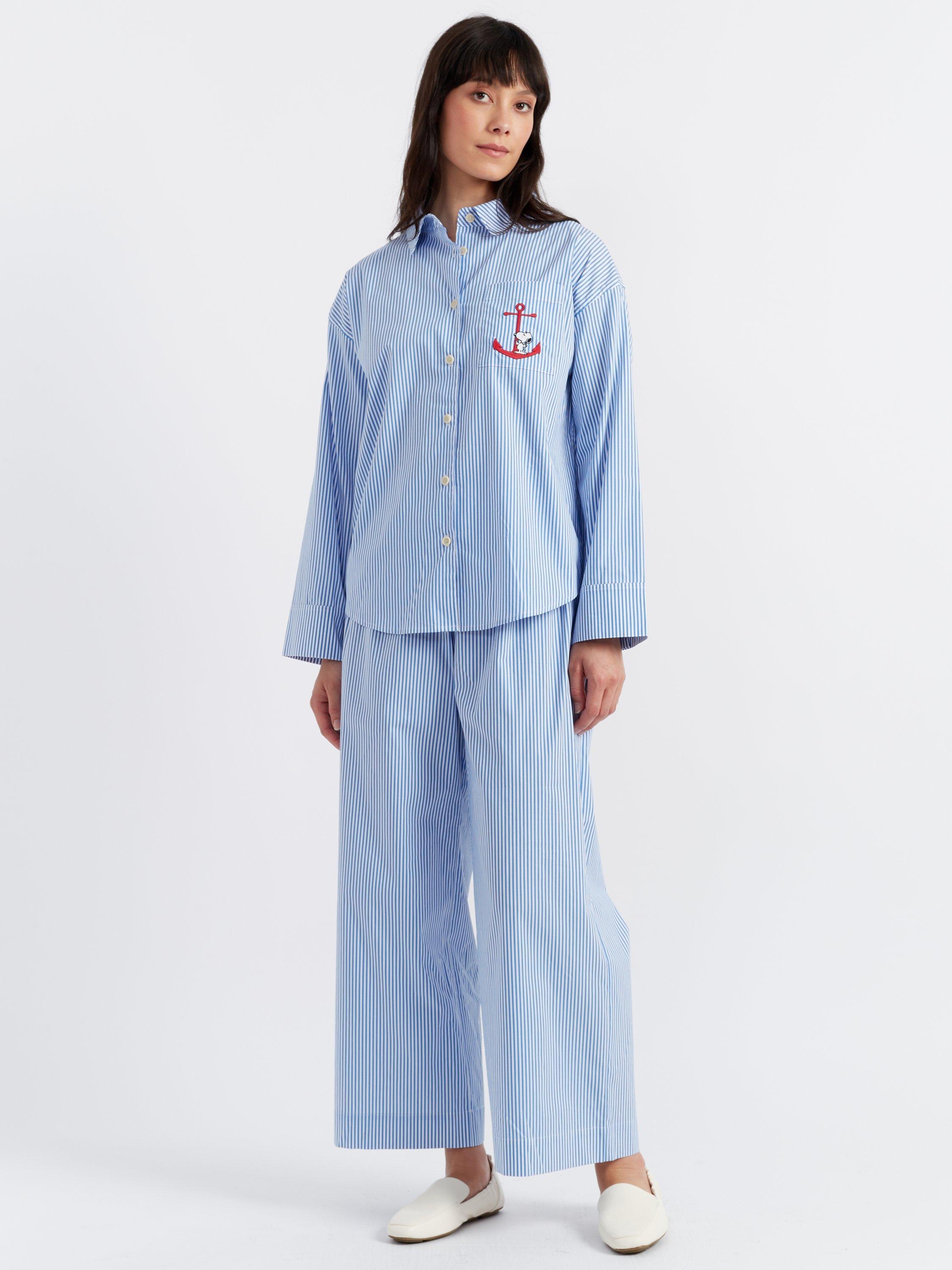 What could be cuter and comfier than this striped co-ord? Made up of a long sleeve shirt and trousers, it is cut from crisp striped cotton. In keeping with the collection's nautical theme, Snoopy is featured on the chest pocket standing atop an anchor.