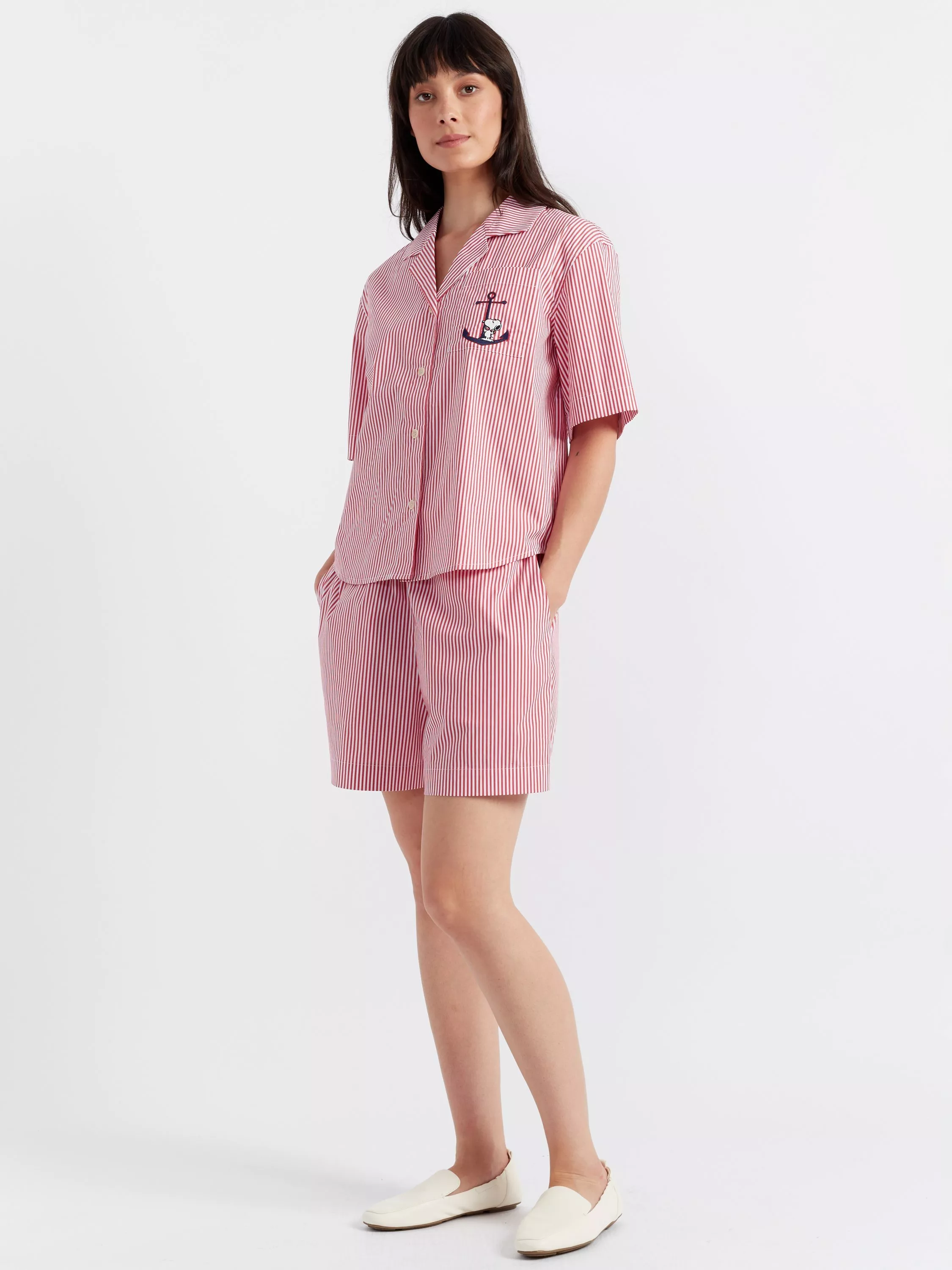 This cute co-ord is your one-and-done solution to warm weather dressing. Consisting of a short sleeve shirt and shorts, it is made from crisp striped cotton. In line with the collection's nautical theme, Snoopy is featured on the chest pocket standing atop an anchor.