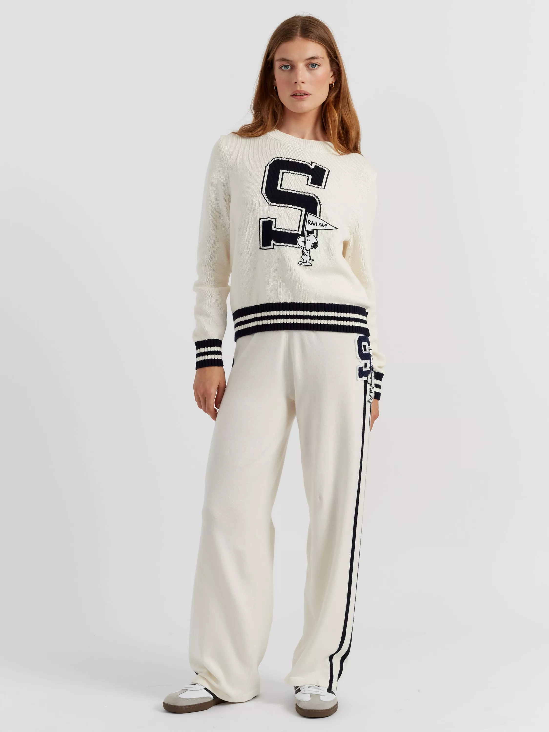 This cotton jumper channels classic varsity style through a playful lens. The bold “S” emblem with Snoopy adds a fun, graphic touch, while contrast stripes at the cuffs and hem give it a sporty edge. A soft knit makes it ideal for effortless layering.