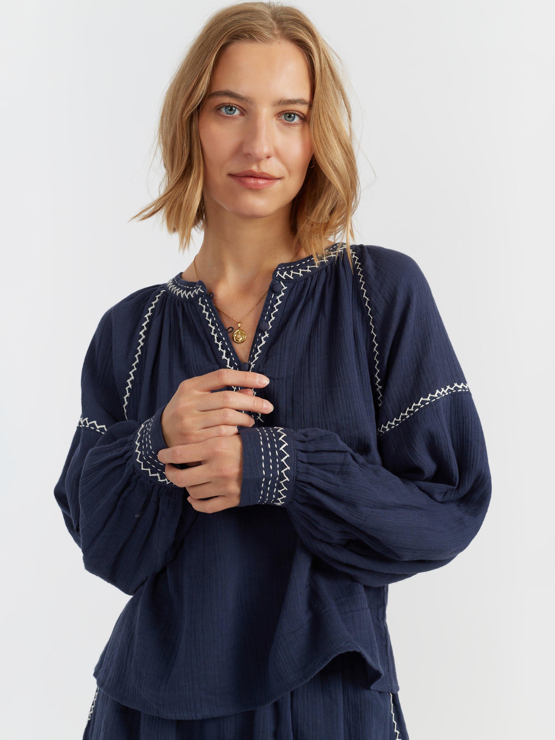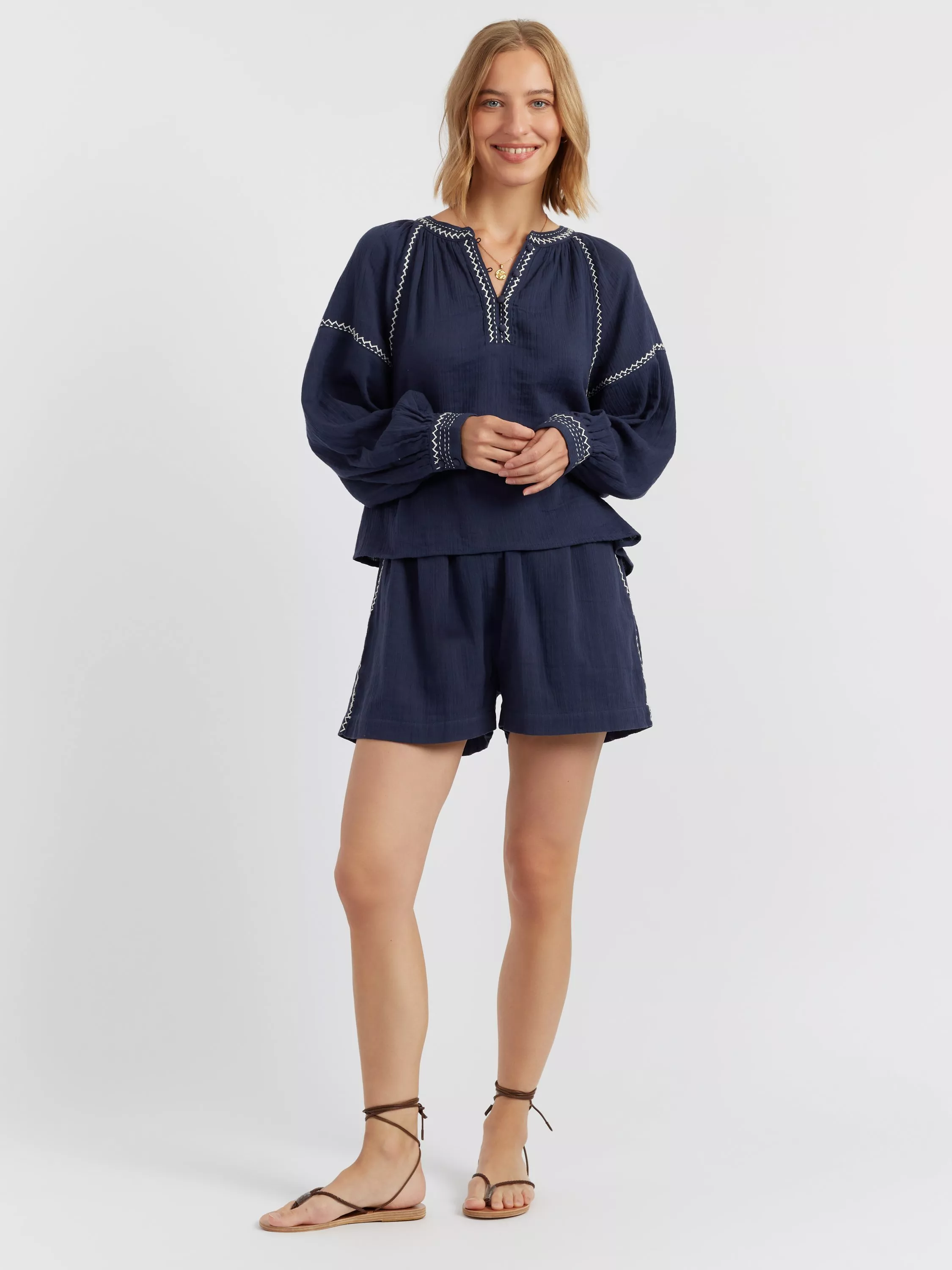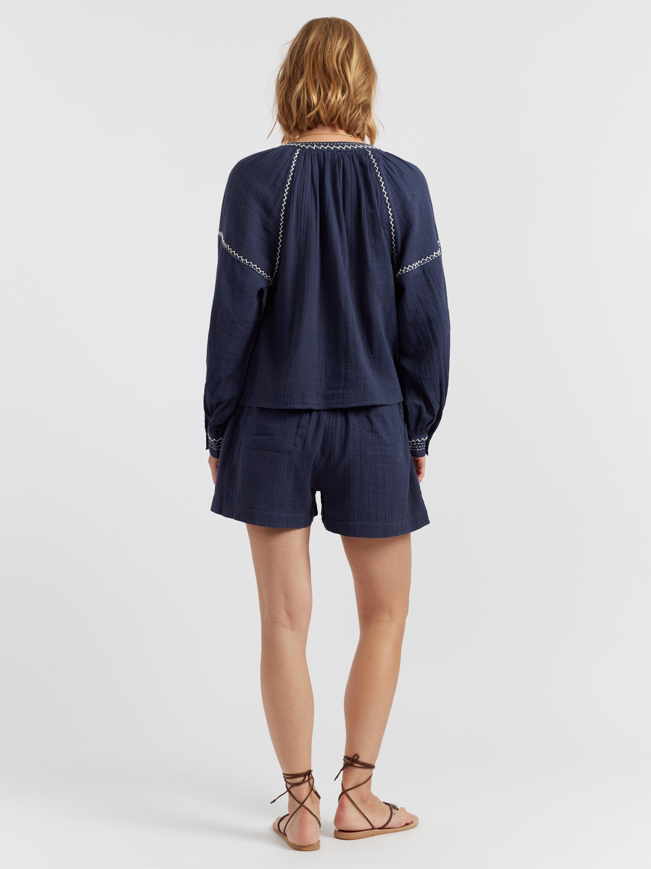 The St Tropez Blouse is crafted from 100% cotton, offering effortless elegance. Designed with a V-neckline and balloon sleeves featuring gathered cuffs, it creates a beautifully voluminous silhouette. Pair it with the matching shorts for a refined yet relaxed look.