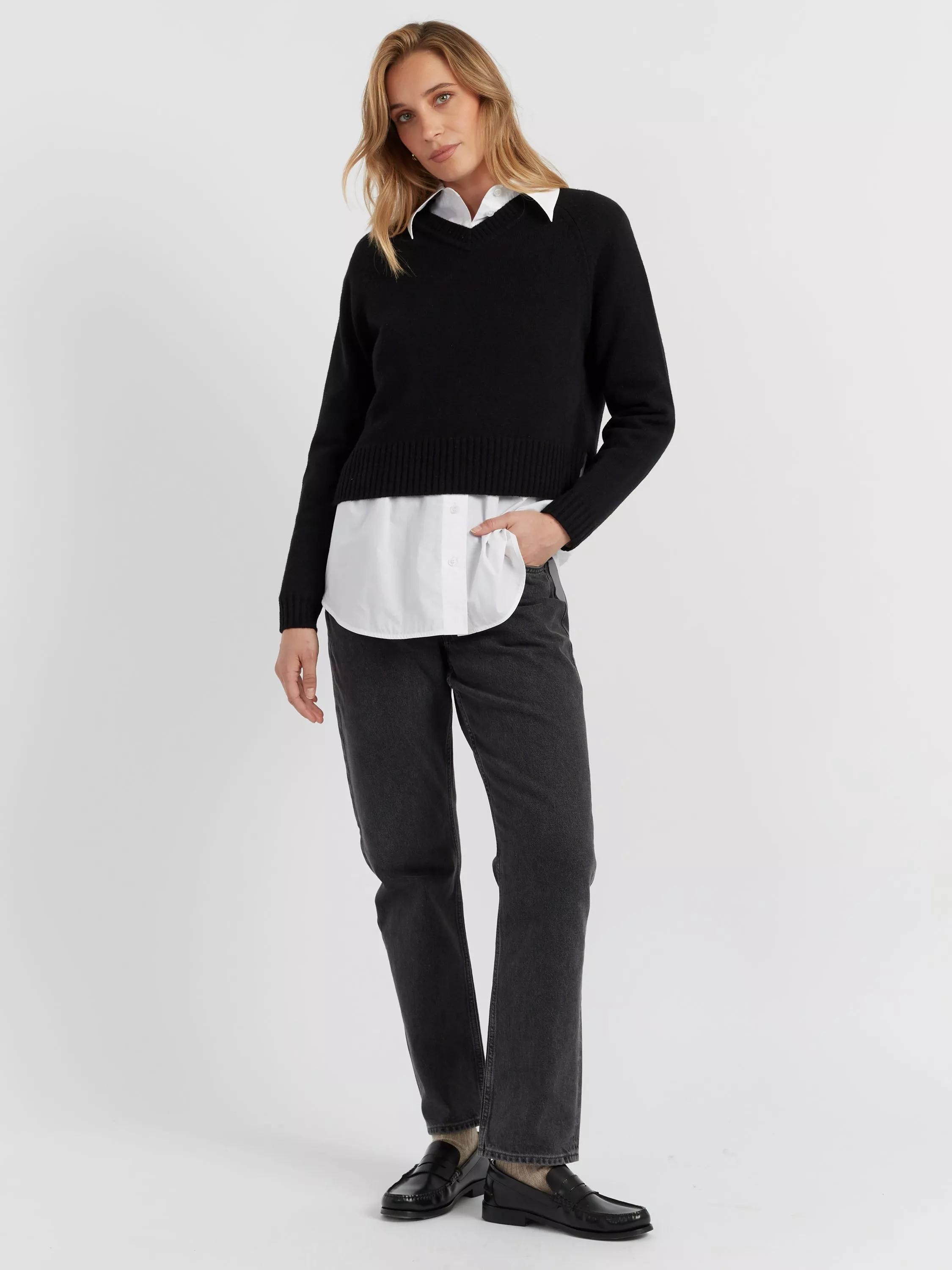 Relaxed yet refined, this pure cashmere V-neck sweater is designed with a slightly boxy silhouette for an easy, off-duty feel. The deep neckline and raglan sleeves add a sporty edge, while wide ribbing at the hem and cuffs brings structure to the soft drape. A modern everyday essential that pairs just as effortlessly with denim as it does with tailored layers.