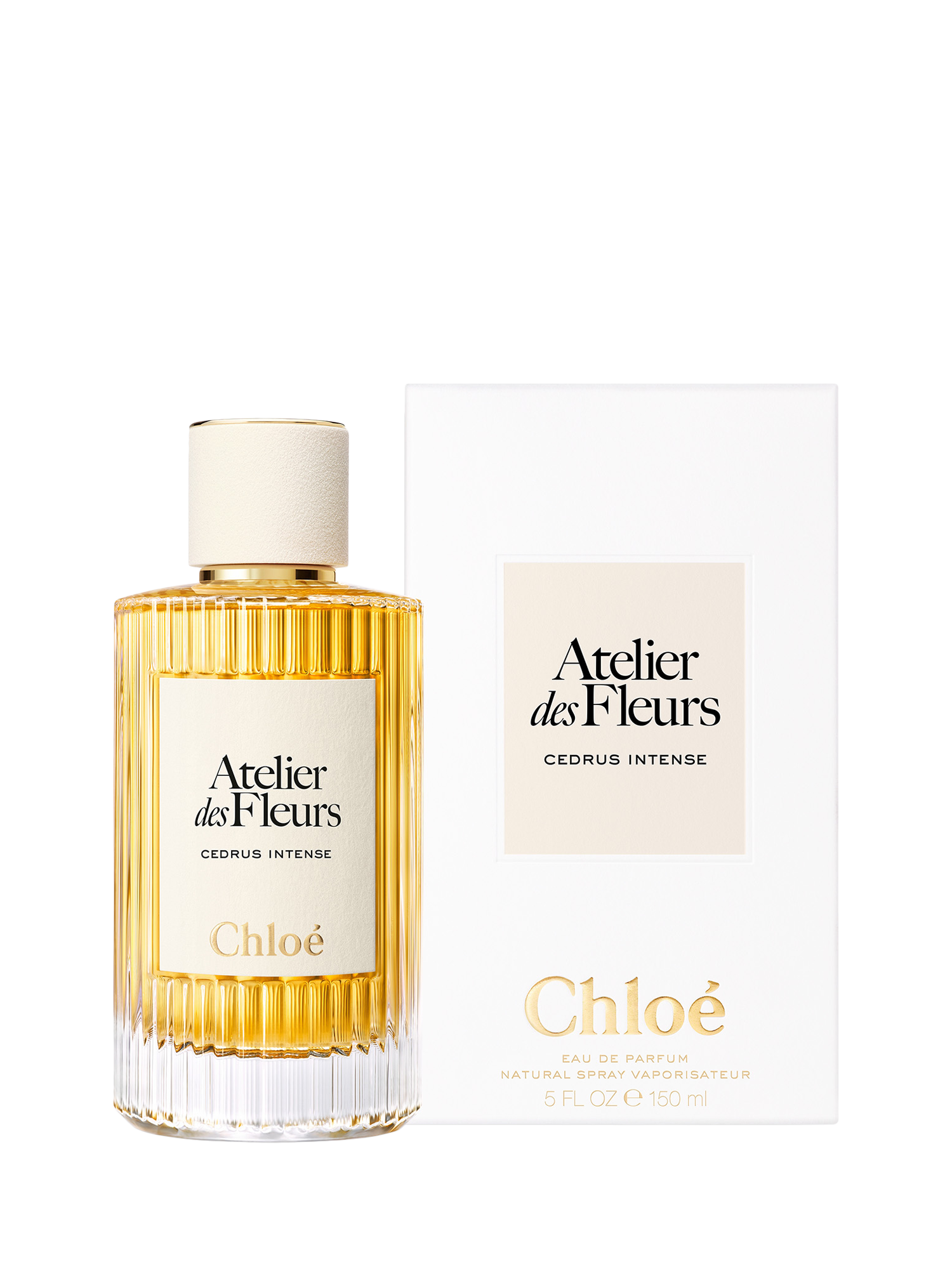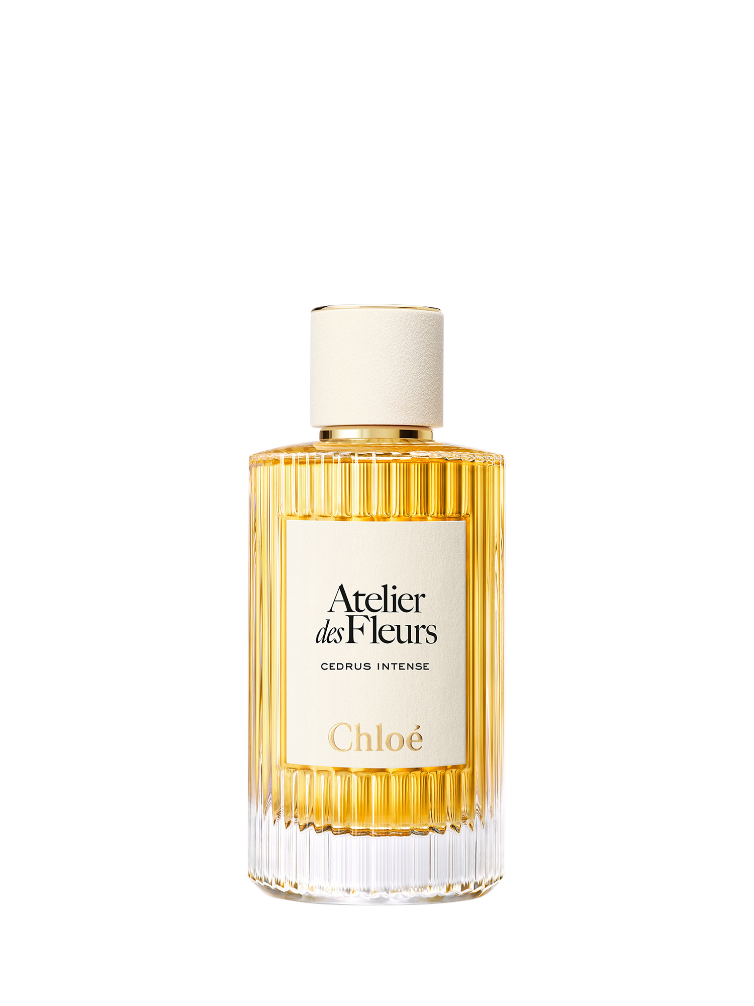Cedrus Intense is presented in the emblematic Atelier des Fleurs bottle, featuring an undulating glass silhouette evocative of the house's beloved sunray pleating and a sand-coloured cap. A pure expression of timeless elegance by Chloé.