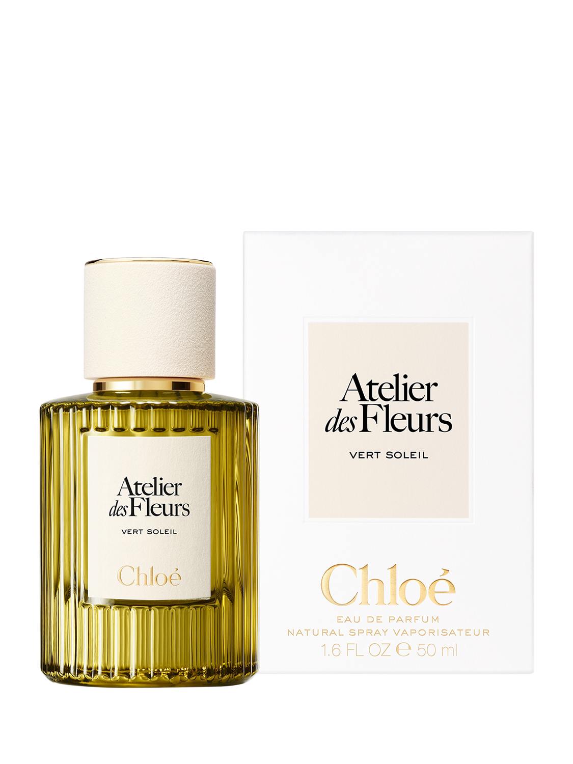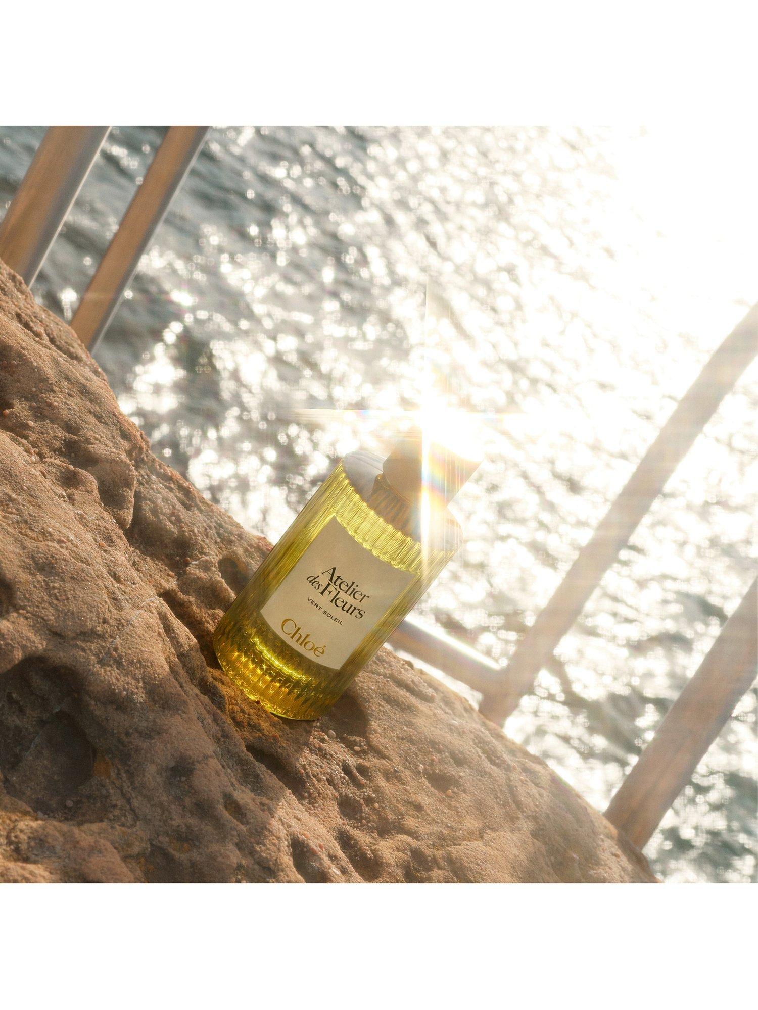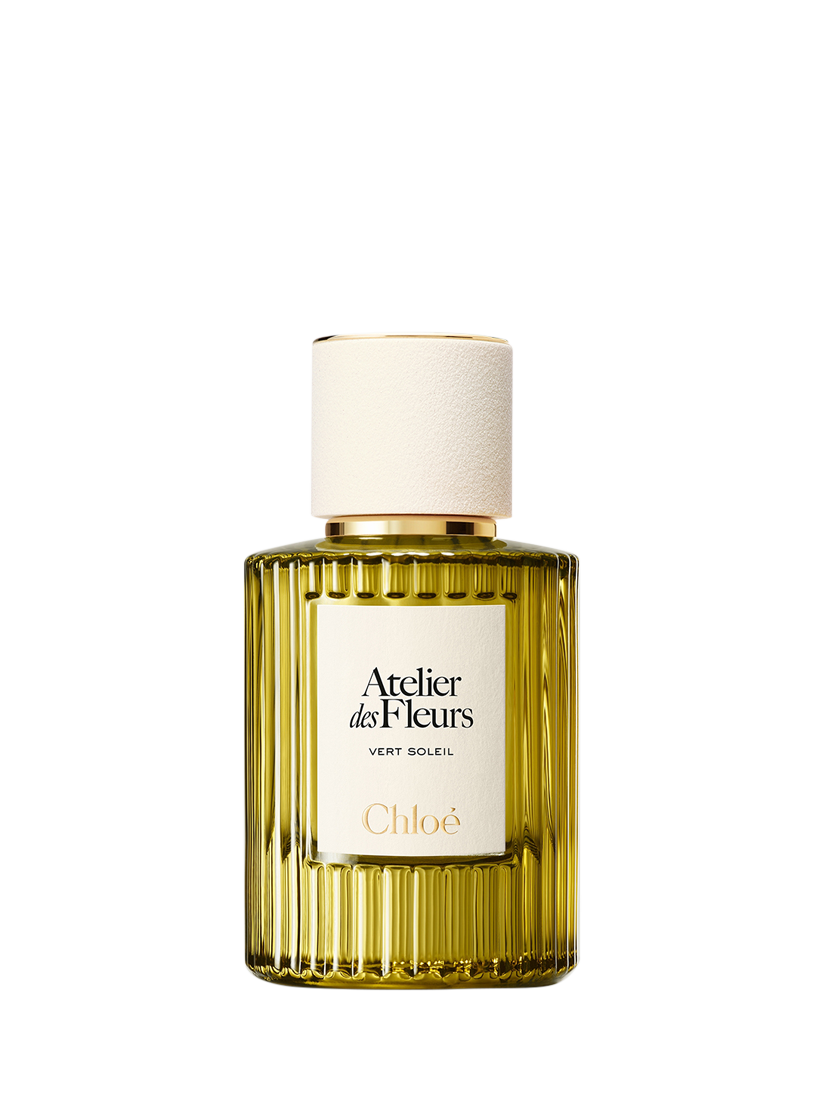 The Mediterranean Essences Eau de Parfum bottles embrace the iconic codes of Chloé, with an undulating glass shape recalling the plissé soleil, a warm green hue, and a textured sand-coloured cap.
